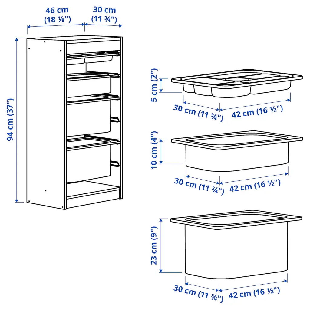 TROFAST Storage combination with boxes/tray - white gray/white 18 1/8x11 3/4x37 ". A playful and sturdy storage series for storing and organizing toys. If you want to protect the contents from dust and dirt, you can complete with TROFAST lid, sold separately. Recommended for indoor use only.