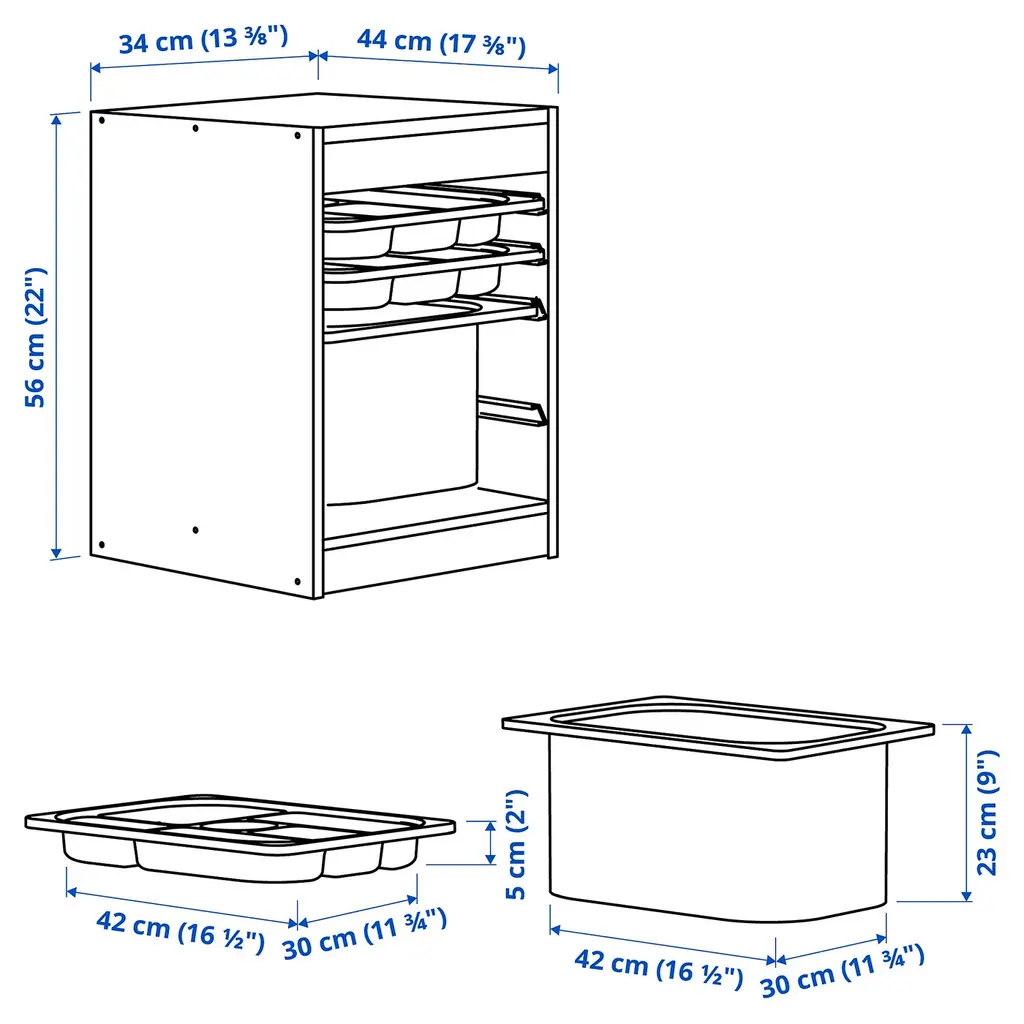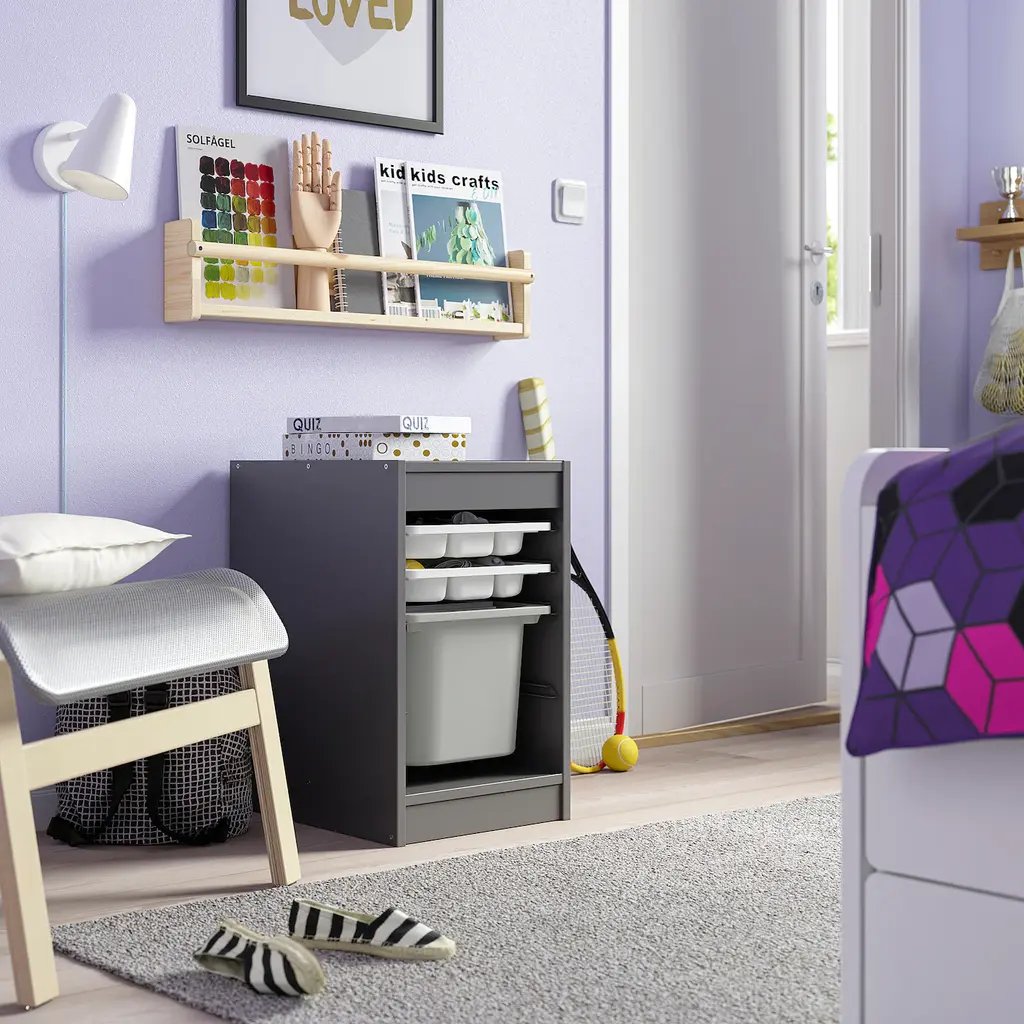 TROFAST Storage combination with box/trays - gray white/gray 13 3/8x17 3/8x22 ". This sturdy and spacious storage solution makes it easier for your child to organize and keep everything in order. Low storage makes it easier for children to reach and organize their things. Guide rails included.