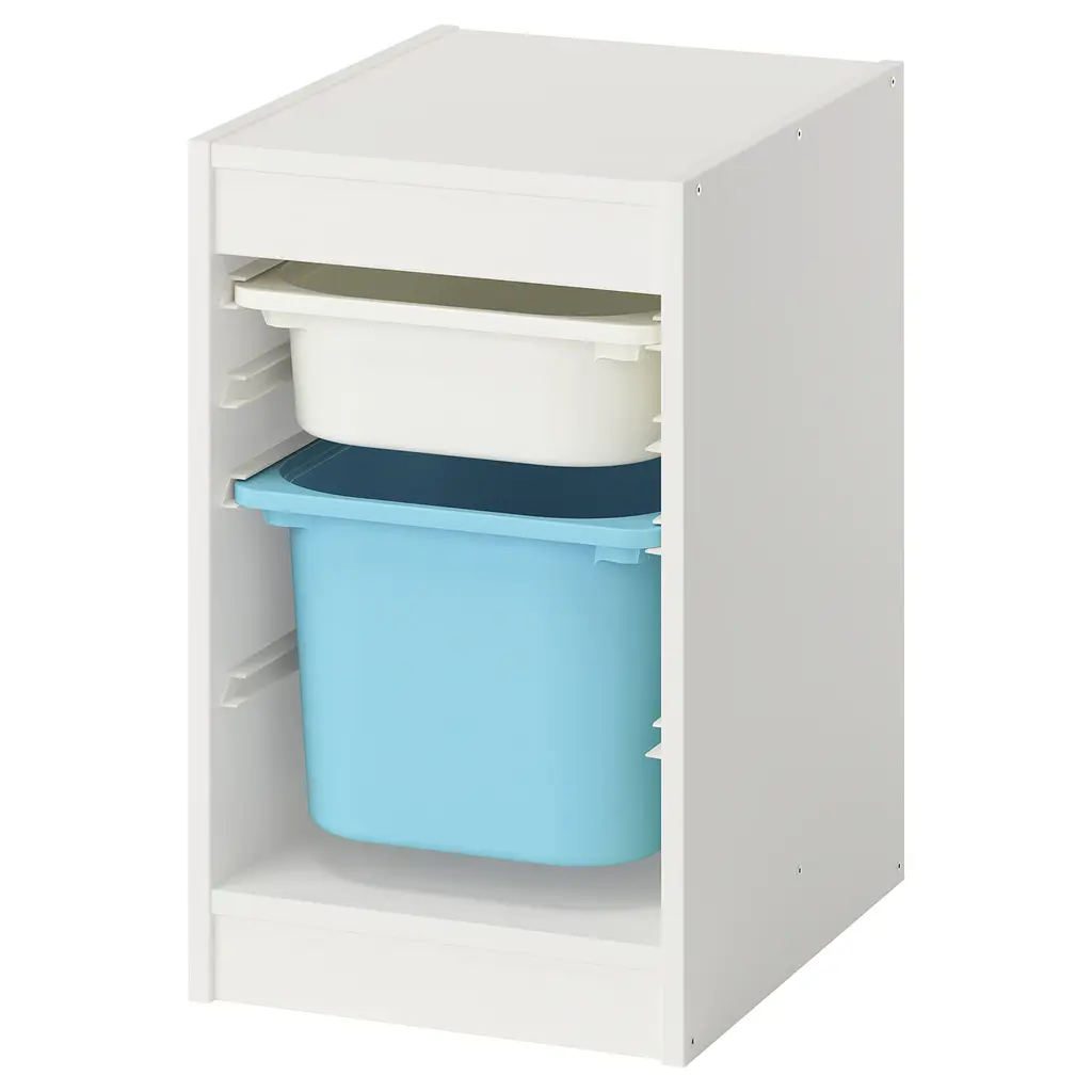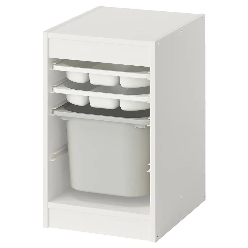 TROFAST Storage combination with box/trays - white red/gray 13 3/8x17 3/8x22 ". This sturdy and spacious storage solution makes it easier for your child to organize and keep everything in order. Low storage makes it easier for children to reach and organize their things. Guide rails included.