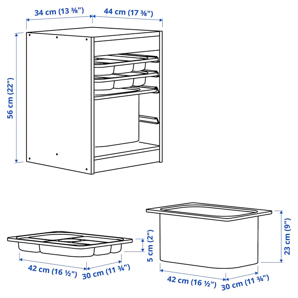 TROFAST Storage combination with box/trays - white white/gray 13 3/8x17 3/8x22 ". This sturdy and spacious storage solution makes it easier for your child to organize and keep everything in order. Low storage makes it easier for children to reach and organize their things. Guide rails included.