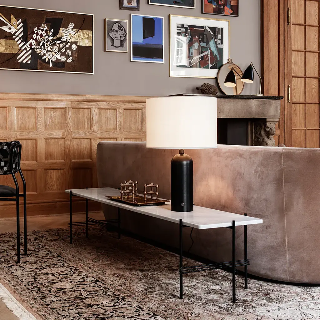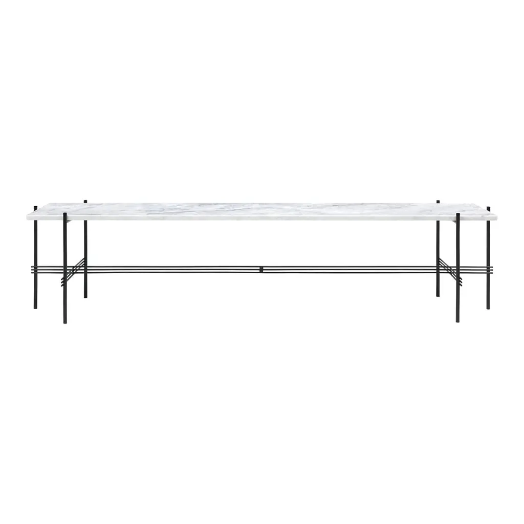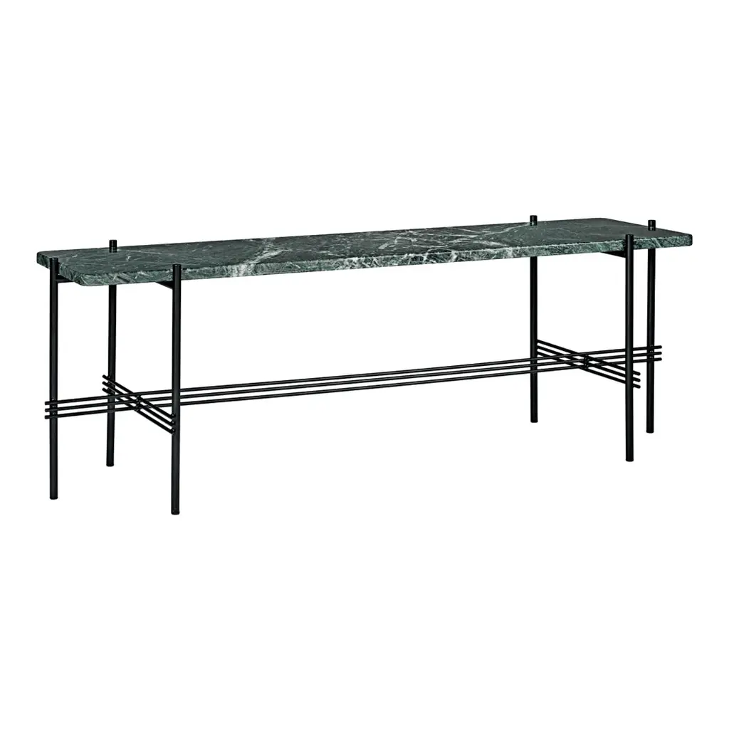 The TS Console creates a sophisticated and sculptural aesthetics for any room with its characteristic slender legs, beautifully crossing details and contrasting solid table top. The rectangular console serves equally well as a storage unit, serving station or media console, featuring either one or two table tops. The timeless TS Console by GamFratesi is extended from the classic TS Table, made for the renowned restaurant The Standard in Copenhagen, where not only its name got its inspiration but also aesthetics and material choices were found. Available in glass or marble with black or brass frame. Not available in brown marble.