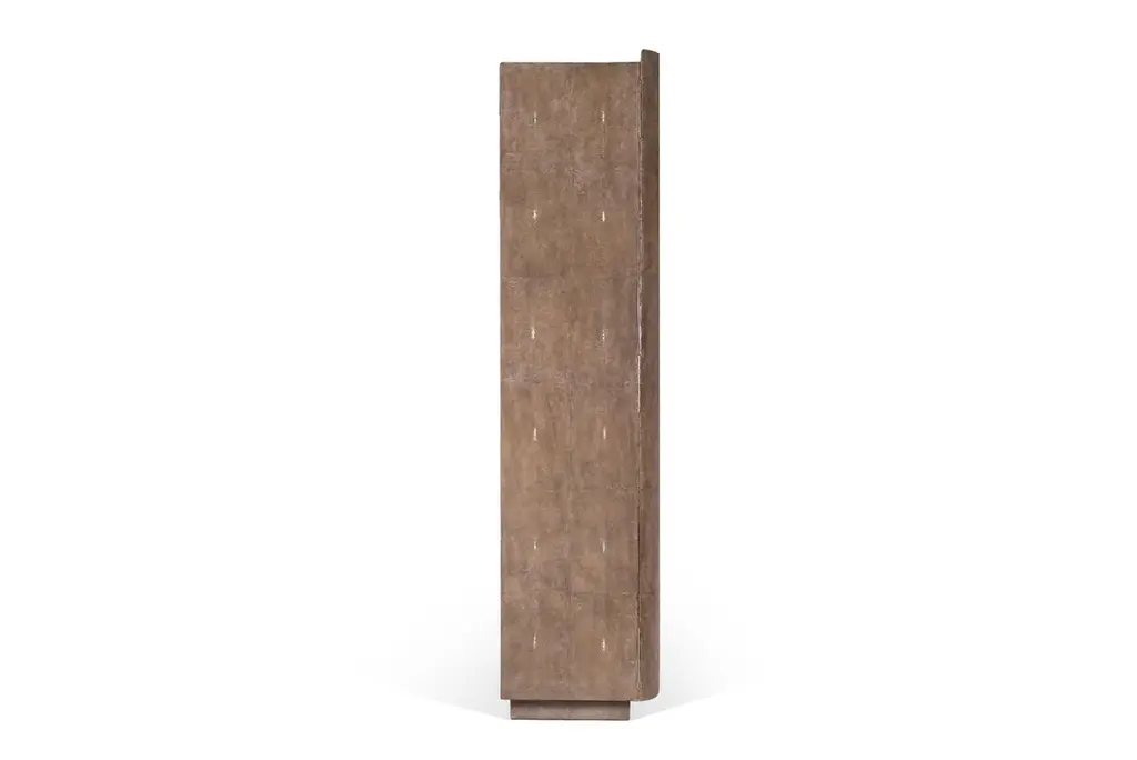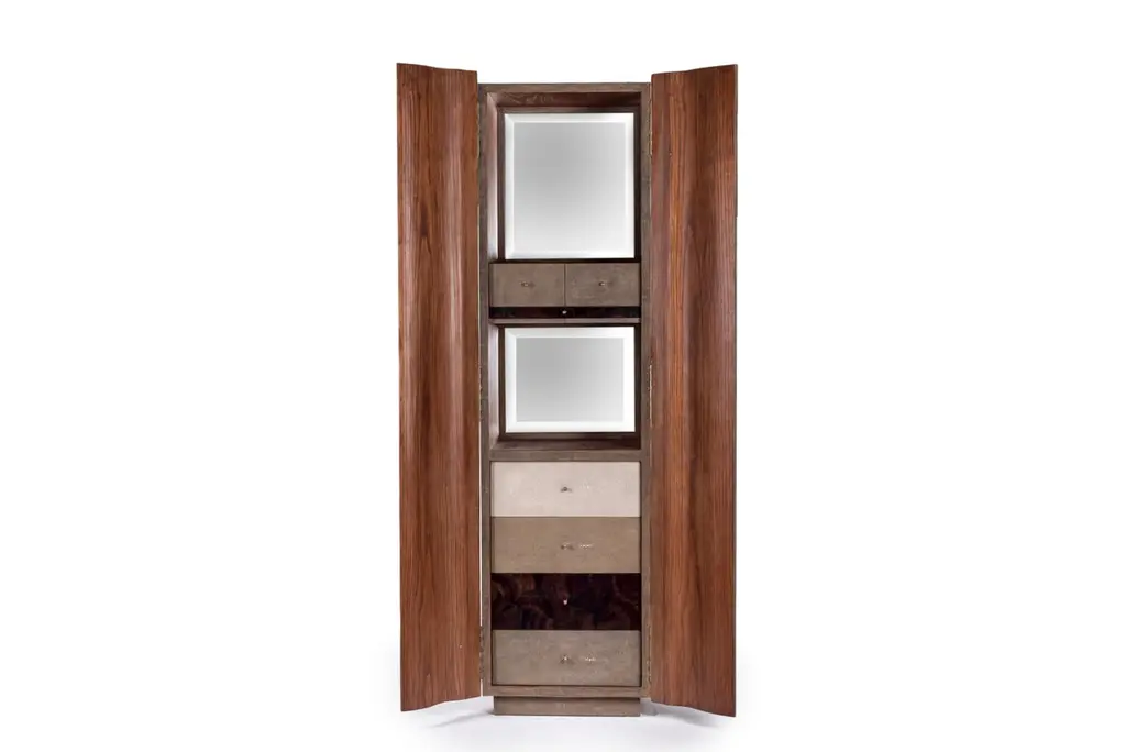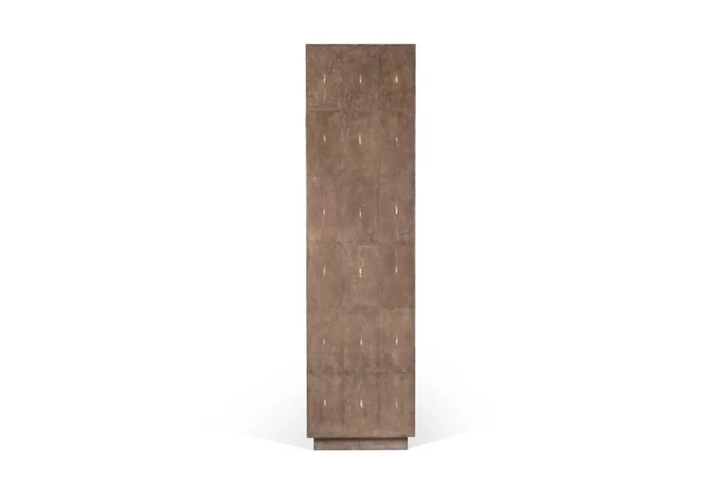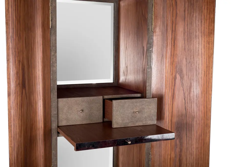 The Paris based label has distinguished themselves since their launch, with their iconic use of shagreen mixed with brass and other exotic materials. All furniture is handcrafted by skilled artisans, ultimately making each piece unique, designed in Paris and produced in the Philippines.This vanity or drinks cabinet in mink shagreen is the ultimate luxury storage unit for any living space. The doors are inspired by waves and overlap over one another to create subtle geometry within the overall structure of the piece. The inside of the cabinet is inlaid in gemelina wood veneer, and includes 6 drawers total, inlaid in a mixture of shagreen and shell with discreet bronze-patina brass knobs. There are also two mirrors and a hidden tray.The dimensions of this piece are 40 x 35 x 154 cm / 15.75 x 13.75 x 60.5"All R&Y Augousti pieces are handmade by artisans, ultimately making each piece unique. Custom color or sizing available on request. Wipe clean with soft dry cloth.Acclaimed design duo Ria & Yiouri Augousti have established themselves since the 1990s as pioneers of modern-vintage style through their luxurious Art Deco inspired collections.The Paris based label has distinguished themselves since their launch, with their iconic use of shagreen mixed with brass and other exotic materials. All furniture is handcrafted by skilled artisans, ultimately making each piece unique. All shagreen-covered items should be kept out of direct sunlight, color variants may occur on the stingray and other exotic finishes, but this showcases the Parisian label's commitment to creating authentic luxurious products using natural components.