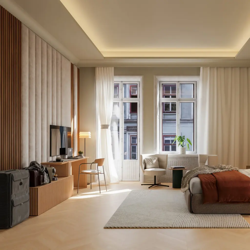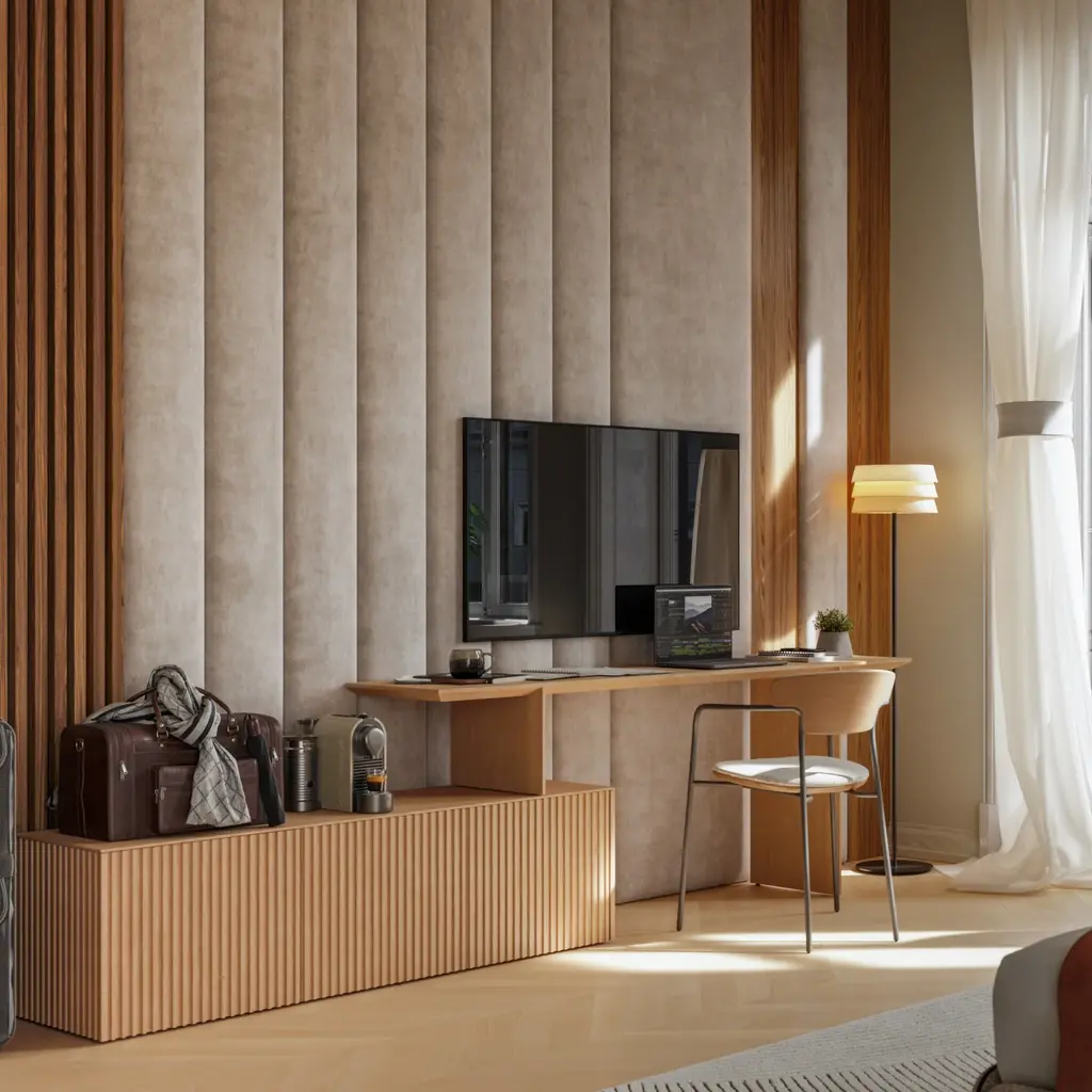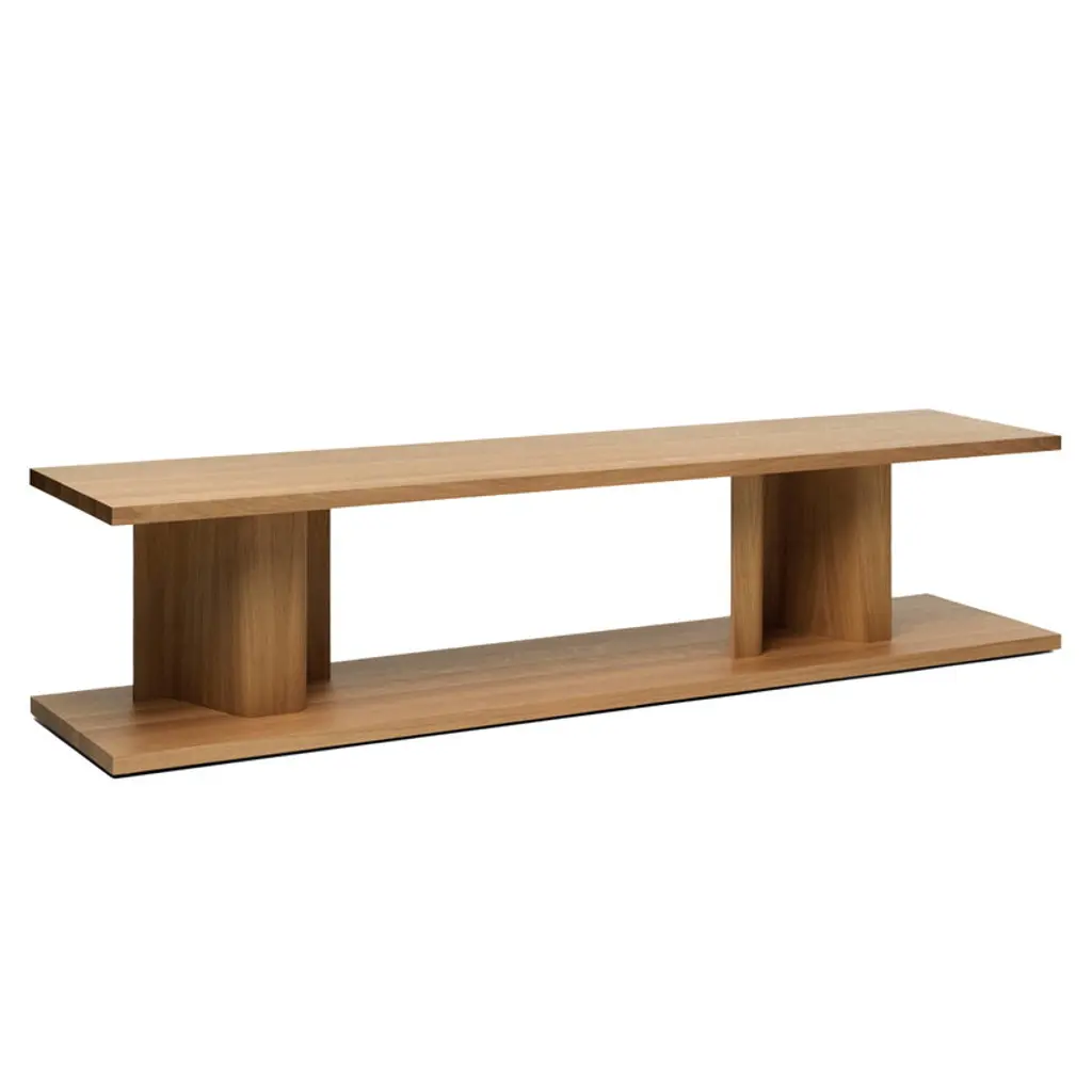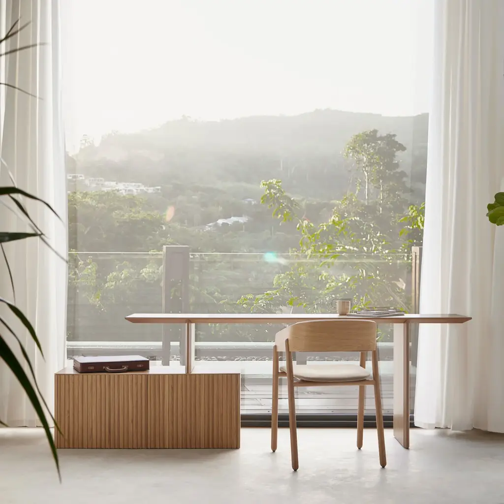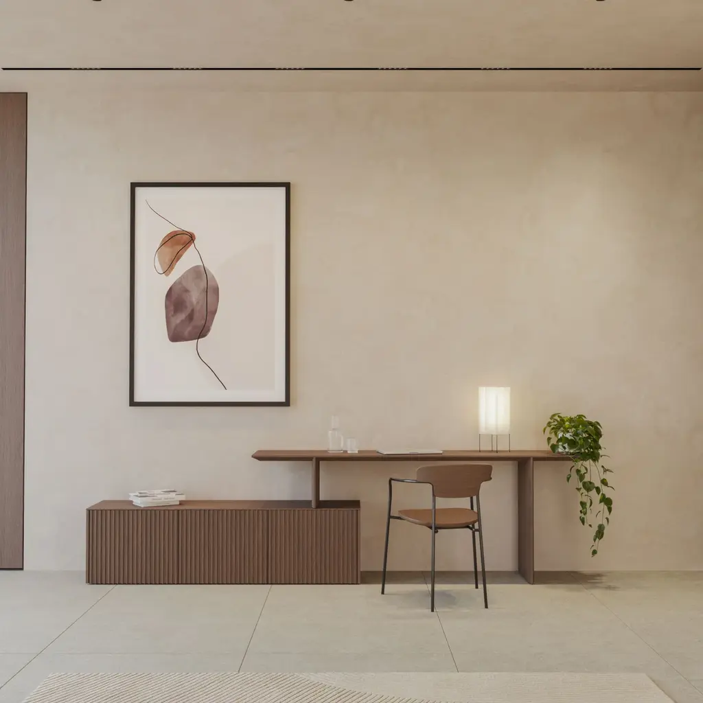 The Velasca Desk features a solid oak storage unit adorned with hand-glued vertical strips, enhancing its three-dimensional texture. An extendable top with chamfered legs offers versatility, allowing the workspace to adapt to various needs. This design not only provides ample storage but also brings warmth and architectural sophistication to both home and professional environments.