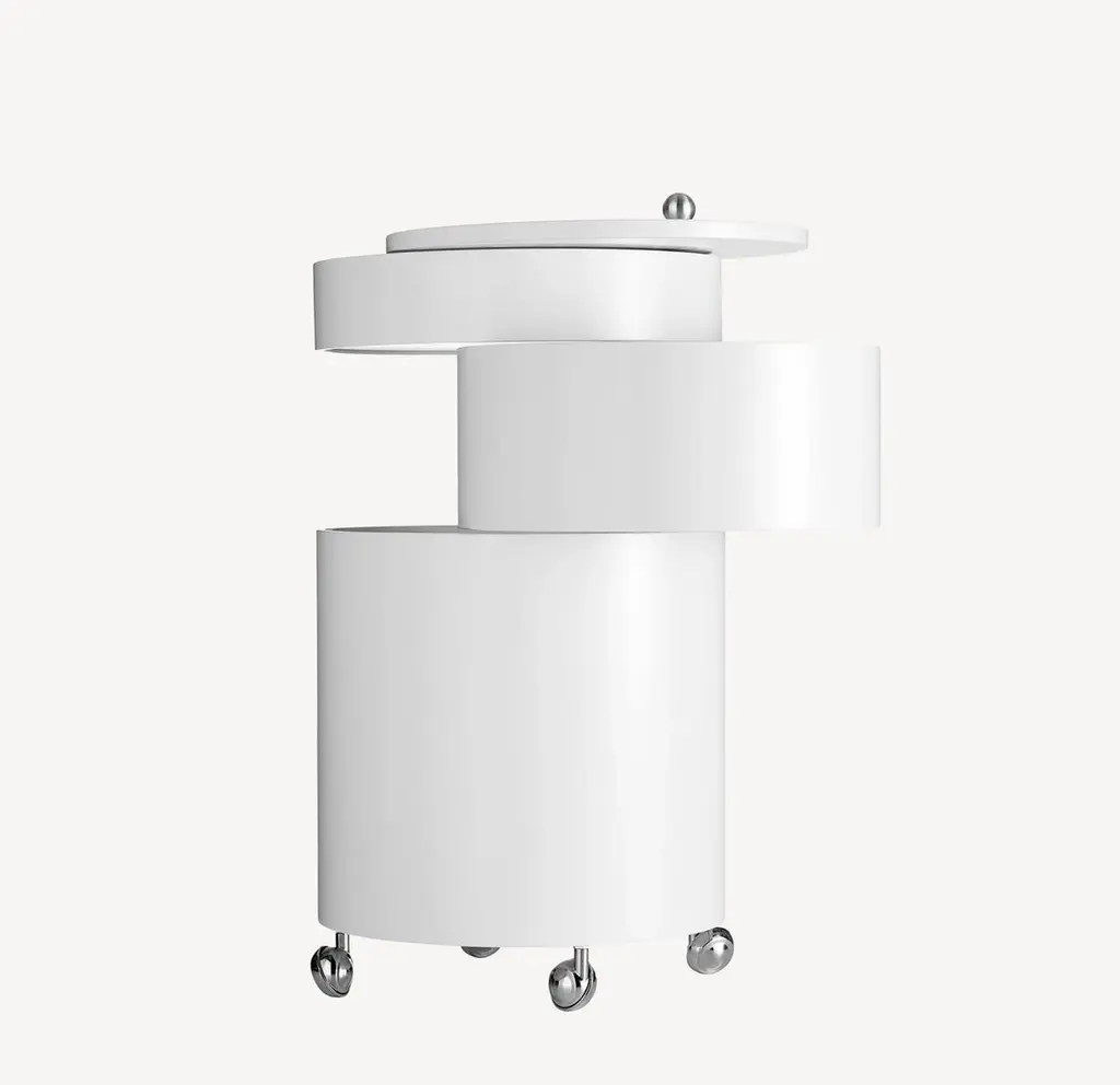 Verner Panton 'Barboy' Bar Cabinet for Verpan. Designed in 1963, current production.Adaptable side table and mobile storage unit in one. Barboy consists of three round-shaped drawers, which can be pulled out fully so the whole surface can be used. Barboy is a typical example of Panton’s furniture, in which he combines a matt surface with a shiny chrome handle and wheels, investing the piece with an elegant contrast.Available in black, white, blue, orange, mushroom and lilac-grey.Verner Panton (1926-1998) was an inspirational and colourful personality. A unique person with a special sense of colours, shapes, light function and room. Over the course of his career, Verner Panton (1926-1998) introduced a series of modern lamps with personalities unlike any of his Scandinavian contemporaries. With a remarkable faith in the unlimited possibilities of the form, he worked successfully to create a new set of theories about how lighting should work and how it should influence its surrounding.At DEZAAK DELUXE we try to find items that are out of the ordinary. With experience over 40 years, we are known for our singular eye and combining the new and the old. We have a few thousand items in stock in our beautiful showroom in a reclaimed factory building out of the 1930s.