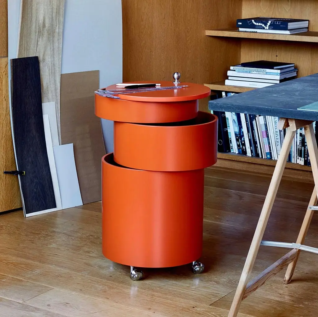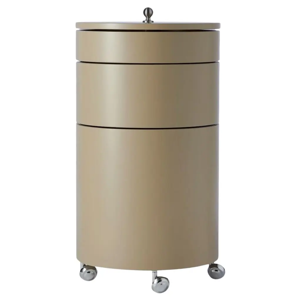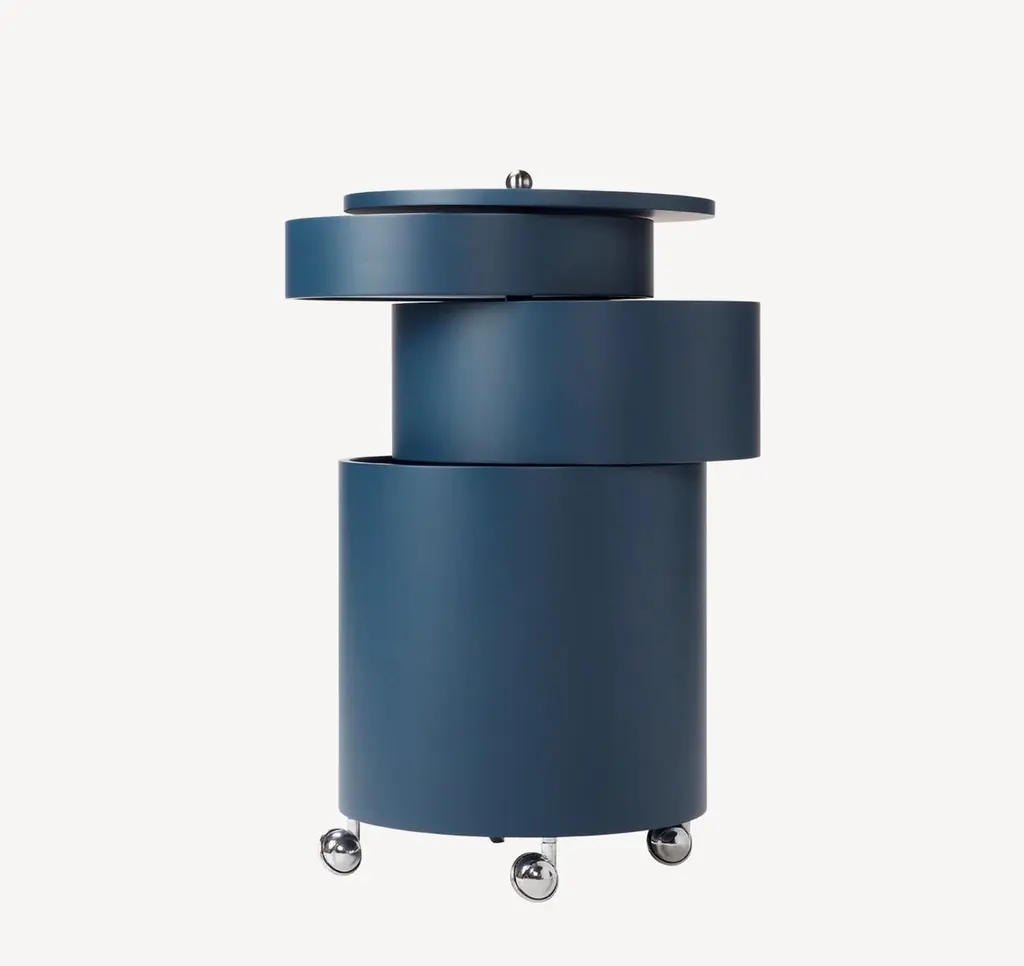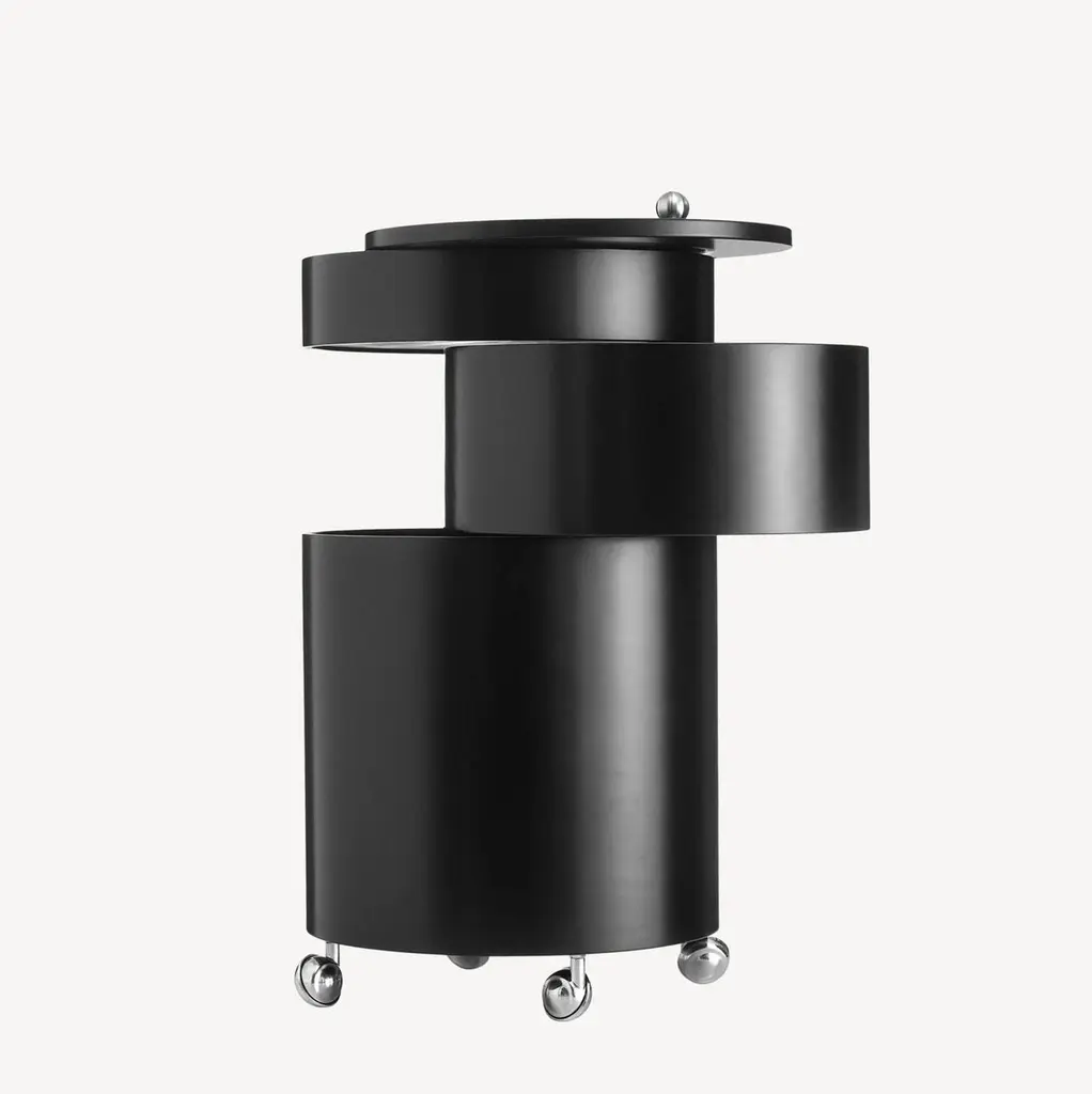 Verner Panton 'Barboy' Bar Cabinet for Verpan. Designed in 1963, current production.Adaptable side table and mobile storage unit in one. Barboy consists of three round-shaped drawers, which can be pulled out fully so the whole surface can be used. Barboy is a typical example of Panton’s furniture, in which he combines a matt surface with a shiny chrome handle and wheels, investing the piece with an elegant contrast.Available in black, white, blue, orange, mushroom and lilac-grey.Verner Panton (1926-1998) was an inspirational and colourful personality. A unique person with a special sense of colours, shapes, light function and room. Over the course of his career, Verner Panton (1926-1998) introduced a series of modern lamps with personalities unlike any of his Scandinavian contemporaries. With a remarkable faith in the unlimited possibilities of the form, he worked successfully to create a new set of theories about how lighting should work and how it should influence its surrounding.At DEZAAK DELUXE we try to find items that are out of the ordinary. With experience over 40 years, we are known for our singular eye and combining the new and the old. We have a few thousand items in stock in our beautiful showroom in a reclaimed factory building out of the 1930s.