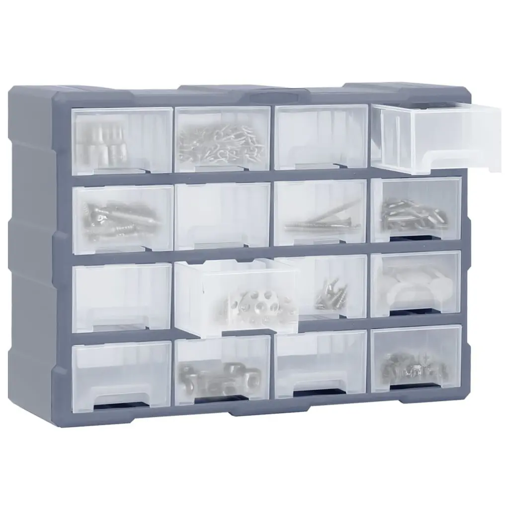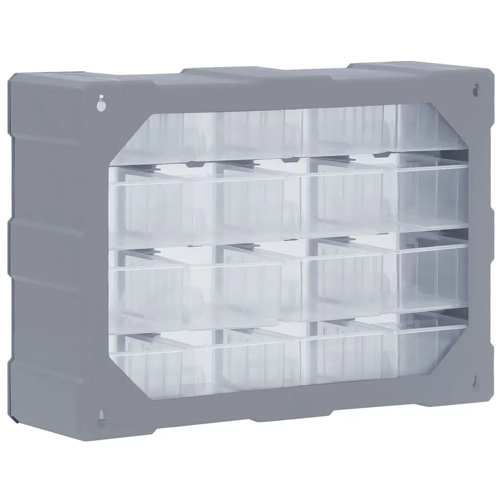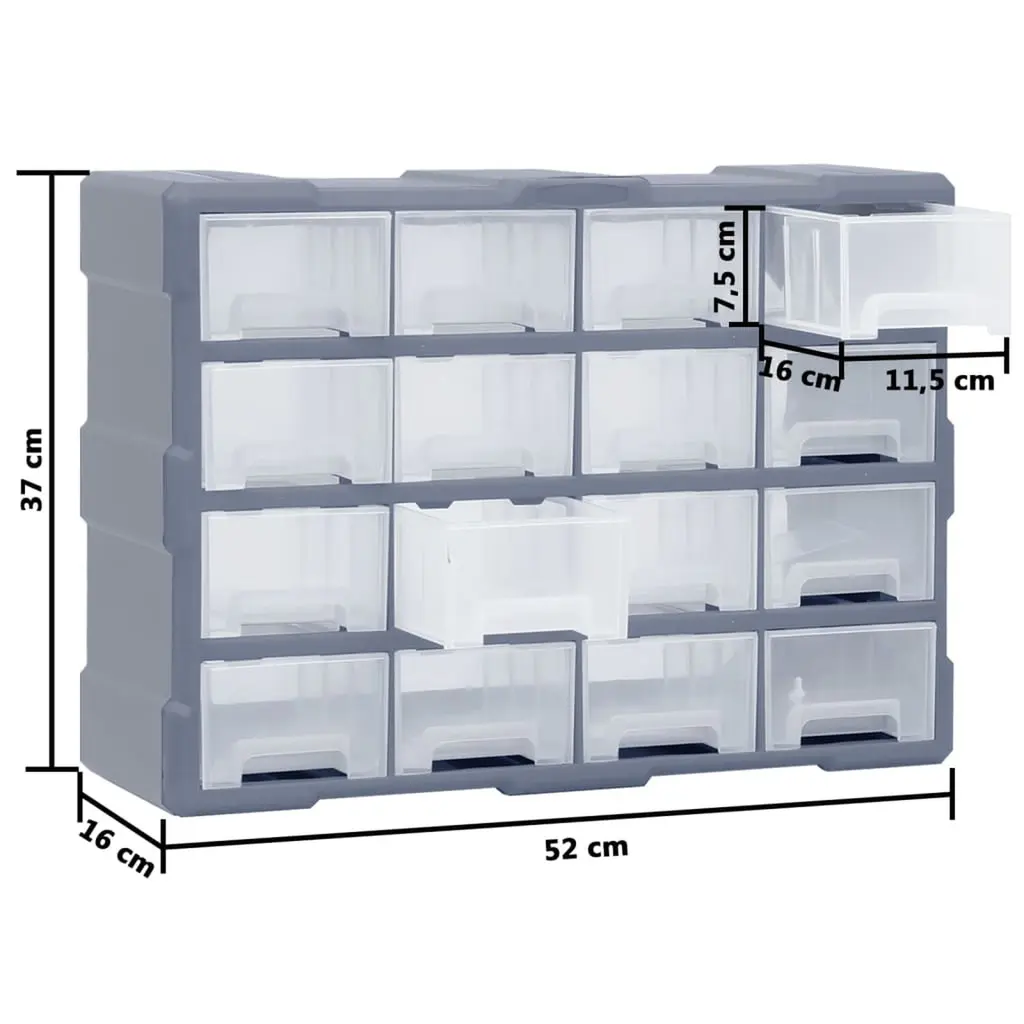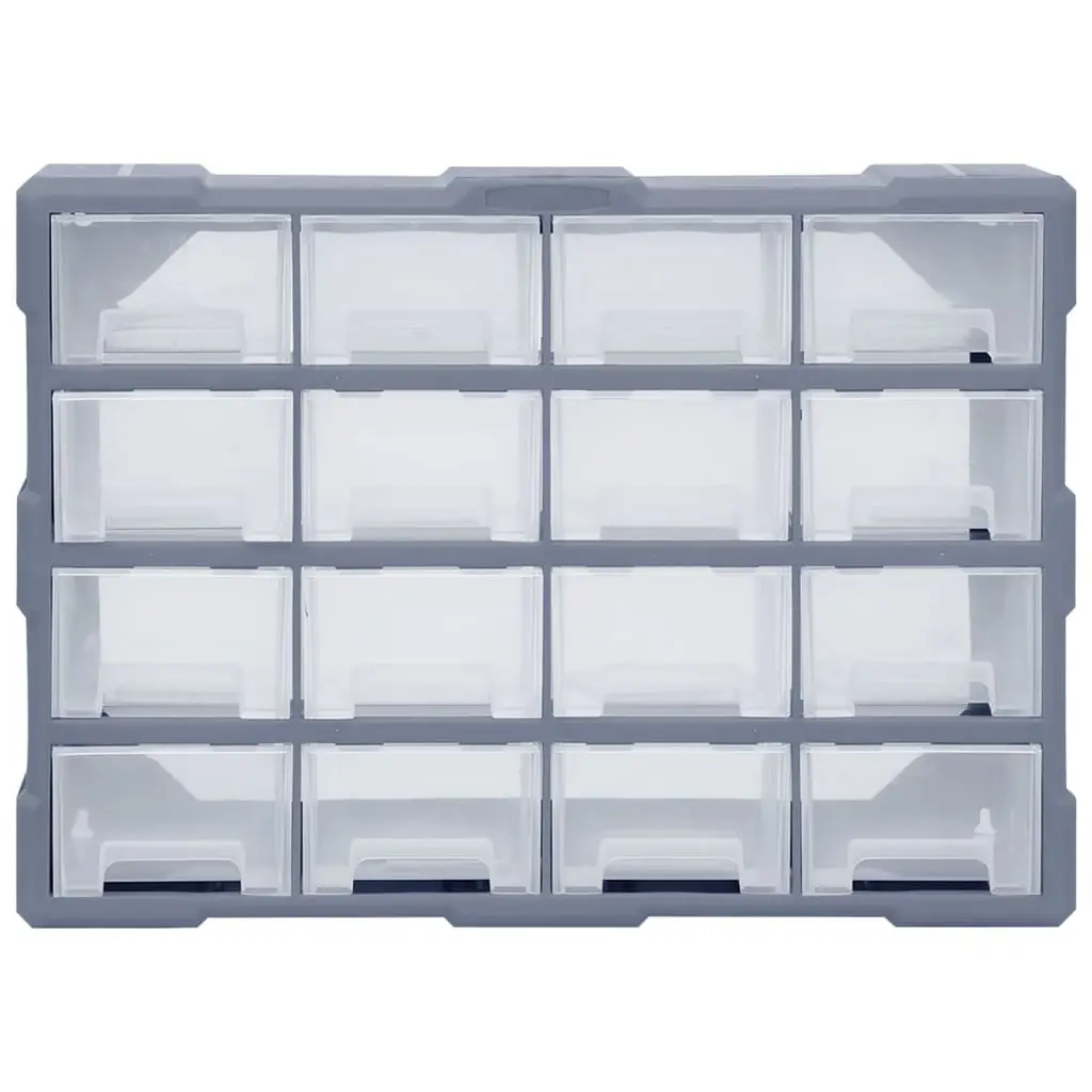 This must-have multi-drawer organizer with totally 16 middle drawers is designed for neatly storing a wide variety of items. It can also be used as a sewing or nail box.This storage unit contains 16 middle drawers to meet your daily needs. It keeps your hand tools and accessories like fasteners organized and within reach. The tool cabinet is made of impact-proof plastic, which is both durable and stable. The drawers are made of see-through plastic so that you can quickly identify the contents. The craft box is ideal for storing nuts, bolts, screws, nails, general fixings and components.This item can be wall mounted and it can also be used individually as a tool organizer.