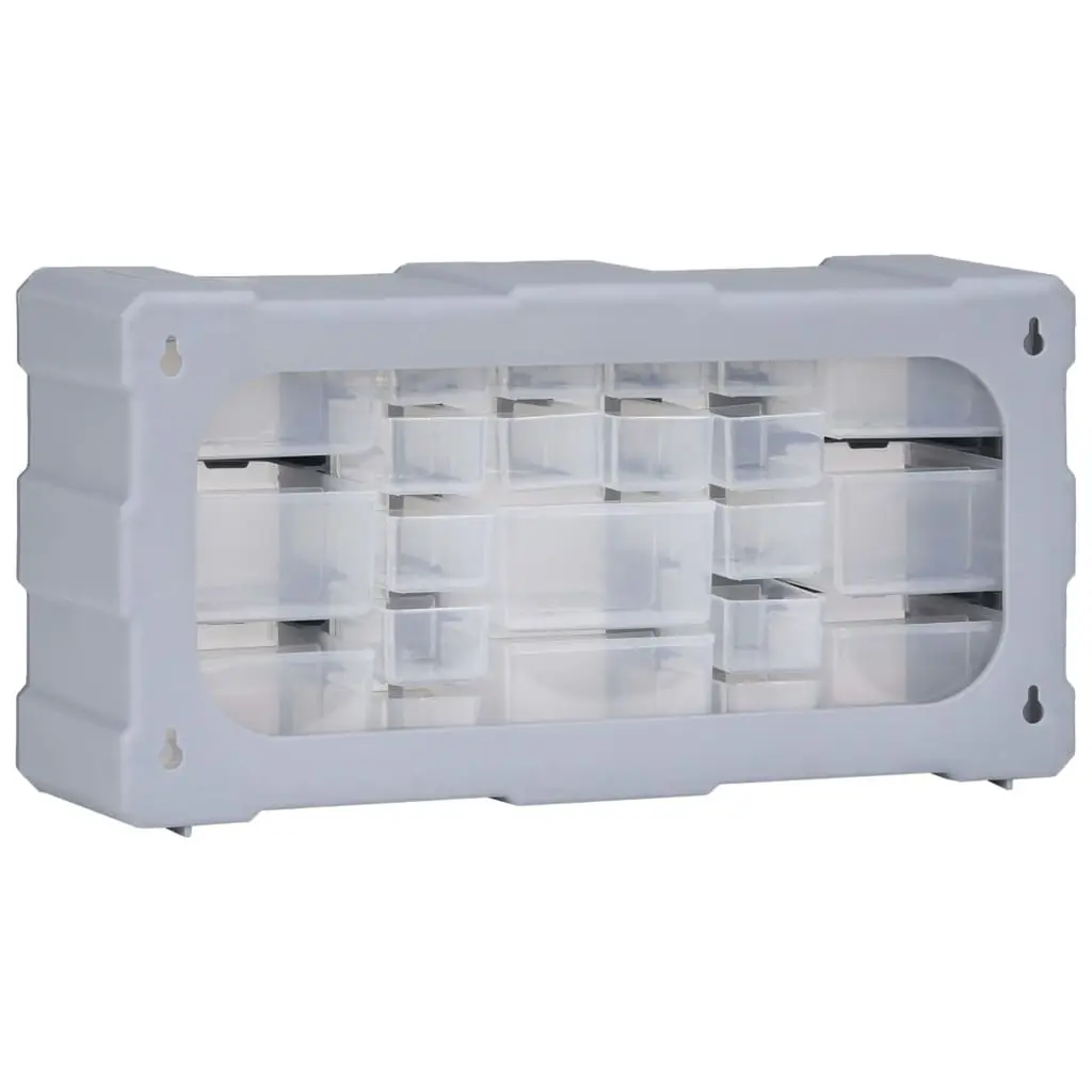 This must-have multi-drawer organizer with totally 22 drawers is designed for neatly storing a wide variety of items. It can also be used as a sewing or nail box.This storage unit contains 14 small drawers and 8 middle drawers to meet your different needs. It keeps your hand tools and accessories like fasteners organized and within reach. The tool cabinet is made of impact-proof plastic, which is both durable and stable. The drawers are made of see-through plastic so that you can quickly identify the contents. This craft box is ideal for storing nuts, bolts, screws, nails, general fixings and components.This item can be wall mounted and it can also be used individually as a tool organizer.