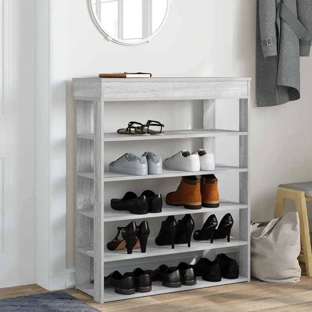 This Grey Sonoma Shoe Rack is a beautifully crafted dresser for your shoes. It's got a modern look and fits nicely into any entrance, hallway, or mudroom while keeping your footwear organized. This shoe rack features five spacious shelves made from engineered wood, designed to hold a considerable number of footwear, ensuring your shoes are organized and easily accessible for everyday use.Its sleek grey finish, paired with a matte texture, lends a sophisticated appearance, making it an excellent addition to modern interiors.Constructed of engineered wood, this shoe storage unit is designed for durability and moisture resistance, helping to maintain the quality of your shoes over time.The shoe rack's versatile design allows it to fit in various spaces, whether by the front door or in a bedroom closet, catering to different organizational needs.With easy assembly instructions included and safety wall attachment devices, the unit provides secure storage without compromising on style.