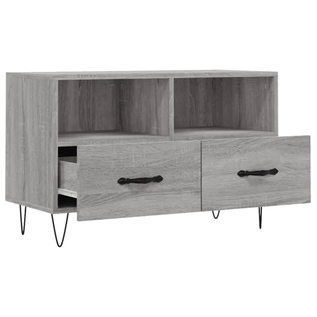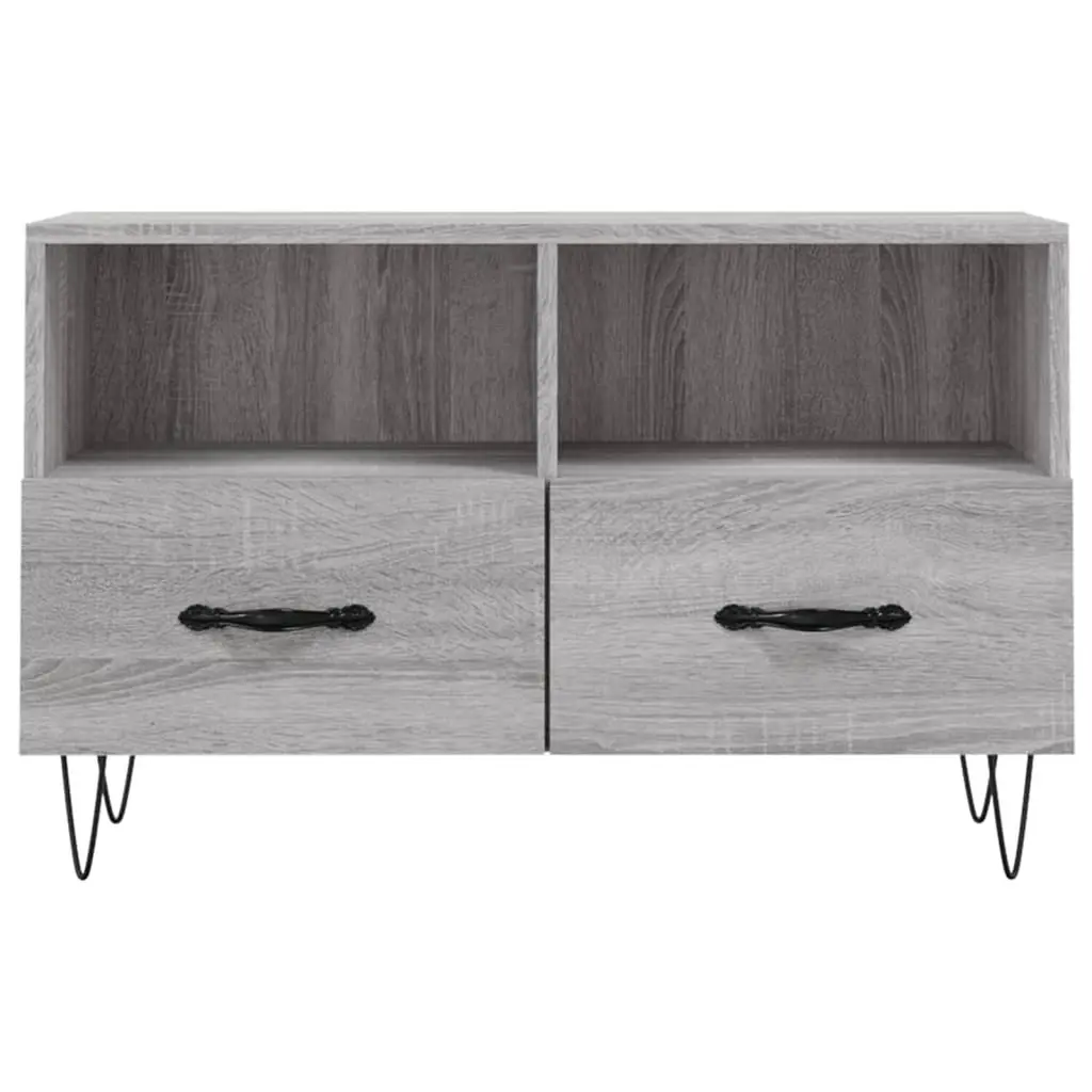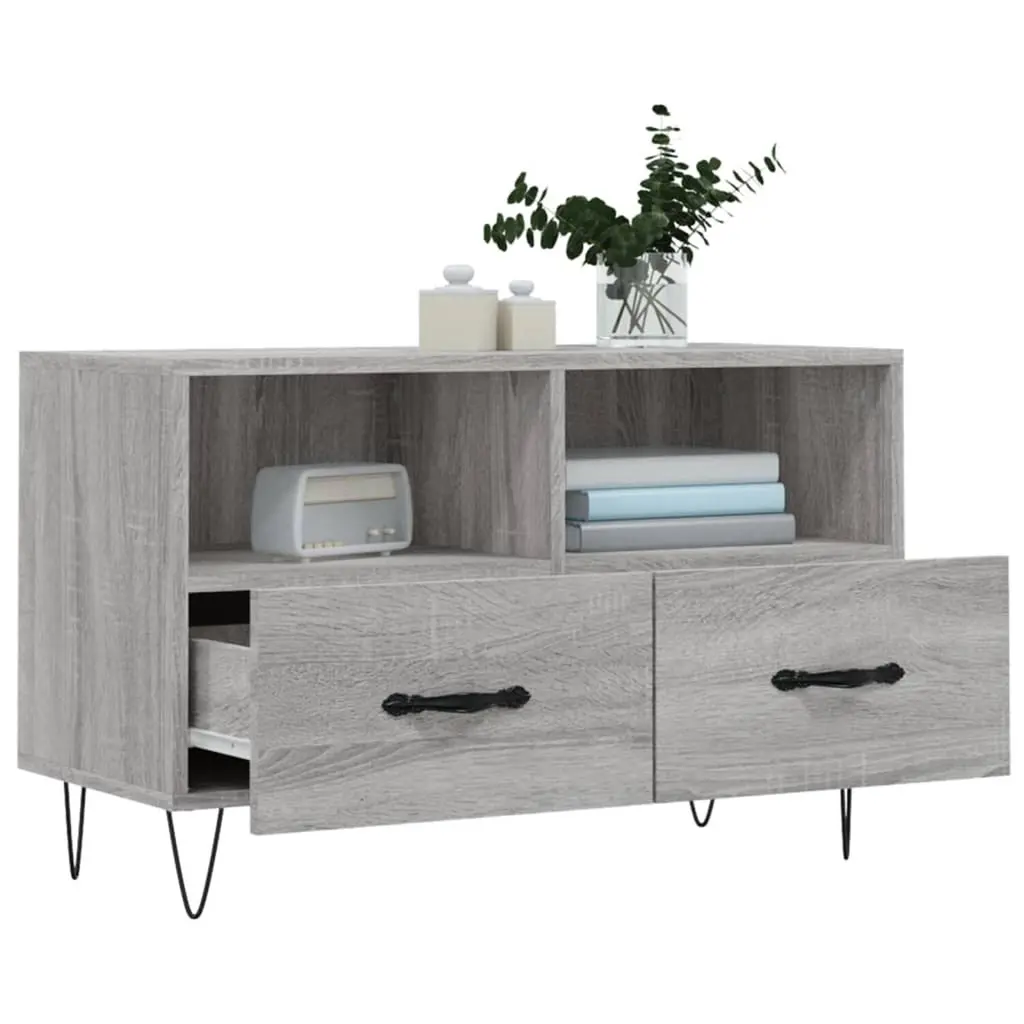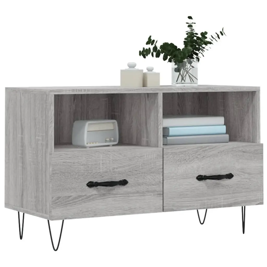 This TV Cabinet in Grey Sonoma is a fantastic mix of style and practicality, making it a great addition to any living room or entertainment area. Built from top-notch engineered wood and comes complete with sleek iron legs, this piece isn't just a solid base for your TV, it also creates a welcoming vibe with its industrial charm. Ample Storage: The design includes two classic drawers and two shelves, giving you loads of room to sort your media bits, DVDs, or gaming consoles, keeping things tidy.Industrial Design: The cabinet sports a solid industrial look, with a matte grey finish and striking iron bits, bringing a touch of urban style to your décor that fits right in modern homes.Sturdy Construction: Made from moisture-friendly engineered wood with iron legs, this cabinet is tough and stable, keeping your TV and media gear secure.Versatile Functionality: Whether you use it as a TV stand, media console, or stylish storage unit, this cabinet hits the mark for all kinds of living room setups.Easy Maintenance: Built for your convenience, keeping it clean is simple. Just wipe it down with a damp cloth and check for loose screws once in a while to keep it solid.