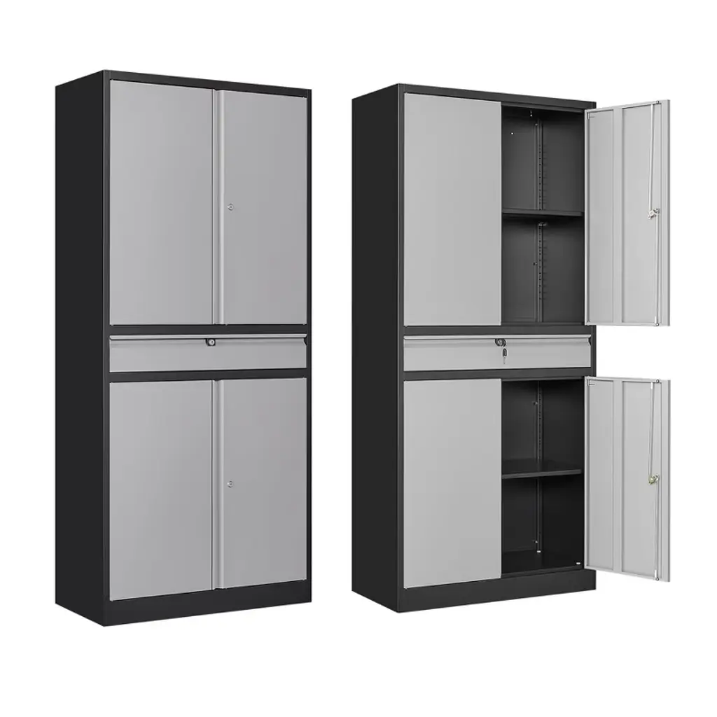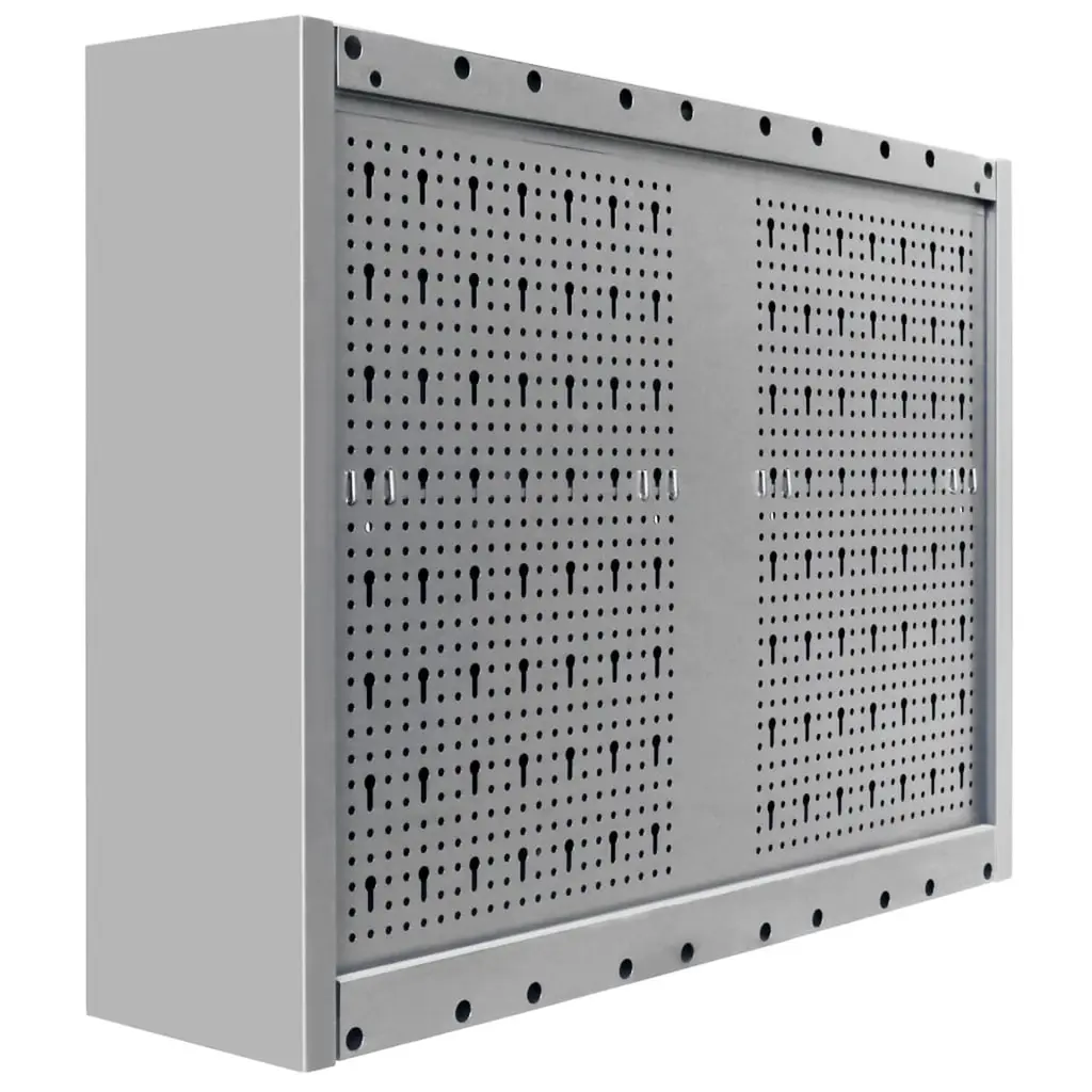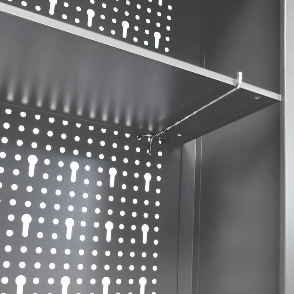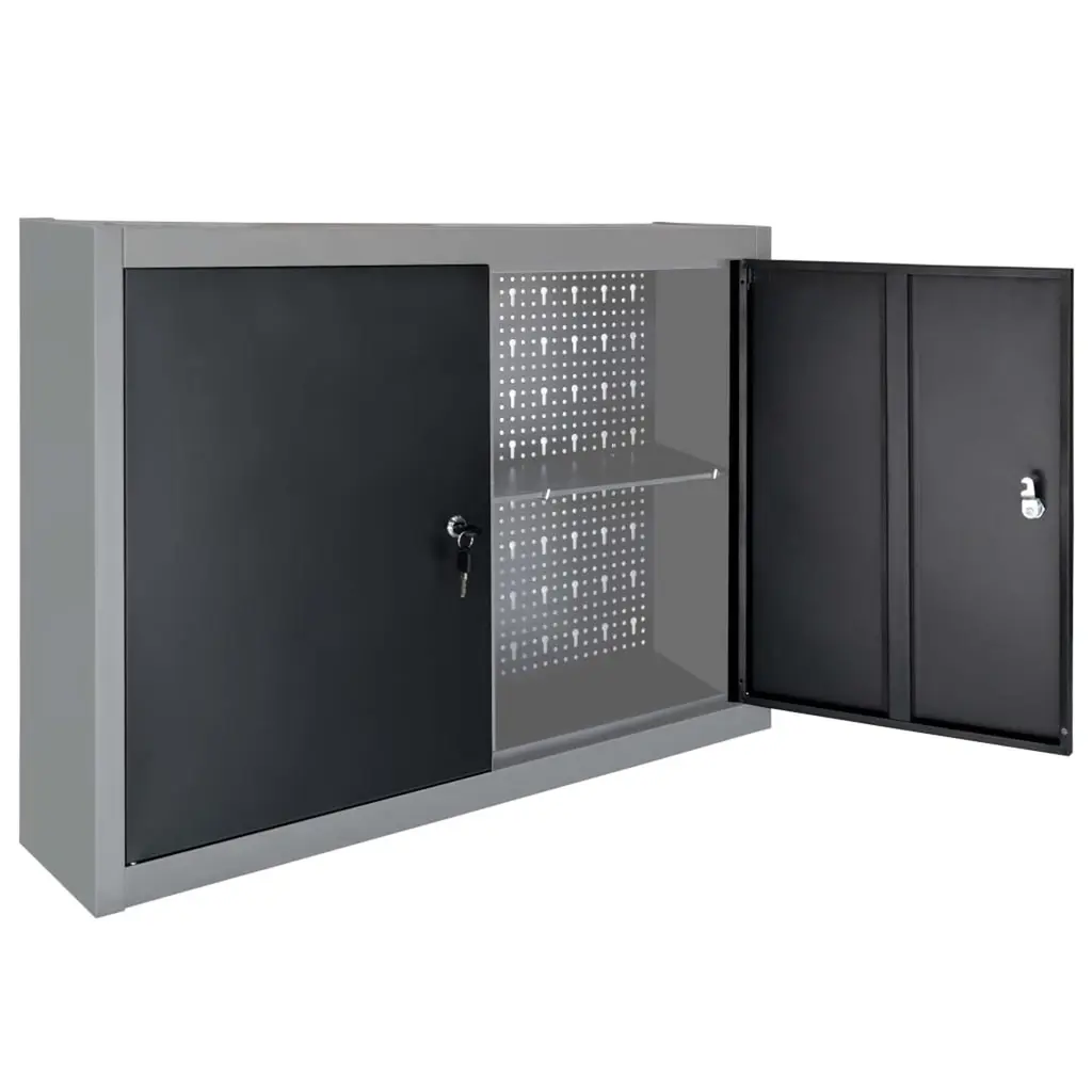 This wall mounted tool cabinet will be ideal for storing your tools, but can also make a unique decorative addition to your home with its cool, industrial style.This tool storage unit features two height-adjustable shelves and a perforated plate with Euro holes that can be used to hang various kinds of tools such as spanners, pliers, hammers, etc. Equipped with two lockable doors (2 keys included for each door), the tool cabinet provides extra safety. It is made of metal with an extra strong scratch-proof coating, making it durable and easy to clean. This product needs to be assembled.