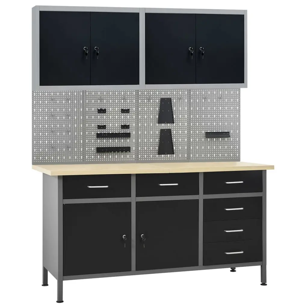 This set is combined with 1 workbench, 4 wall panels and 2 wall cabinets, which will make a practical storage solution to your workshop and garage.The heavy-duty workbench, standing out with ample storage space and 1102.3 lb loading capacity. This large and sturdy tabletop provides a stable platform for all your repair works. The workbench has 6 drawers, to organize your tools, parts and accessories such as screws, nails and adhesive tape properly. All drawers are equipped with ball bearing mechanism for smooth sliding. There are 2 shelves with a lockable door, which can easily accommodate drills, cable drums and grinders. Additionally, the feet are height-adjustable. This workstation is crafted from premium steel and engineered wood, making it extra sturdy, durable and easy to clean. It is easy to assemble.These tool panels crafted from solid steel can bear the weight of various tools, like drills, pliers, screwdrivers and wrenches. The panels are perforated for fixing tools easily and securely. The 4 wall panels can be fixed together for extra rigidity. It is an ideal addition to your workbench and workshop cabinets with a practical width of 63".The tool storage unit features two height-adjustable shelves and a perforated plate with holes that can be used to hang various kinds of tools such as spanners, pliers, hammers, etc. Equipped with two lockable doors (2 keys included for each door), this tool cabinet provides extra safety. It is made of metal with an extra strong scratch-proof coating, making it durable and easy to clean. This product needs to be assembled.