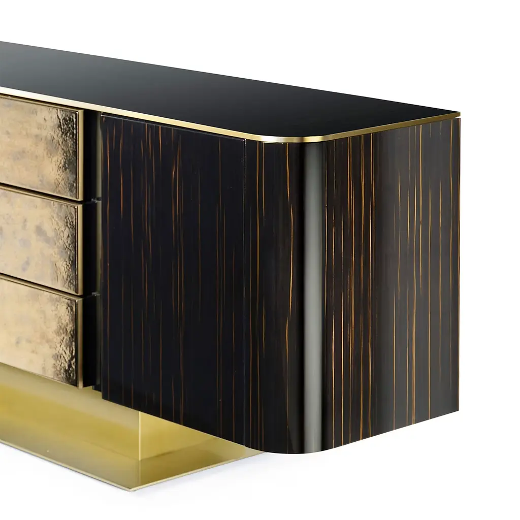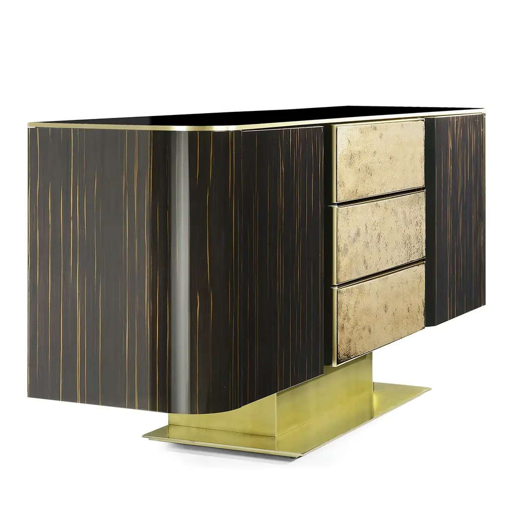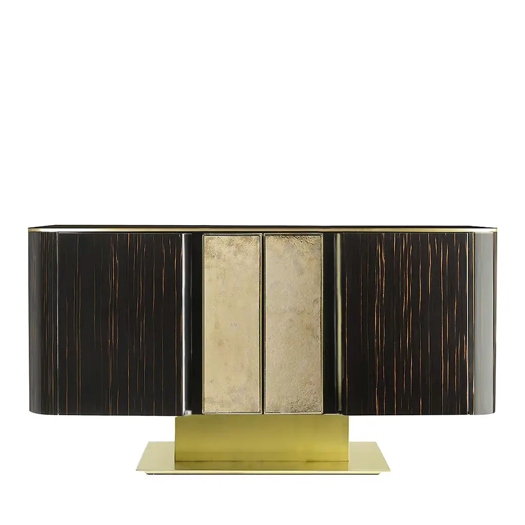 A triumph of daring contrasts between materials and finishes characterizes this sideboard's eccentric yet refined personality. Ceramic inserts adorn the front, where three practical drawers are flanked by veneered doors that open to reveal elegant solid-color lacquered storage units. Sustained by a bright metallic base, the sideboard comes complete with a black back-varnished glass top. Please contact the Concierge for finishing variants.