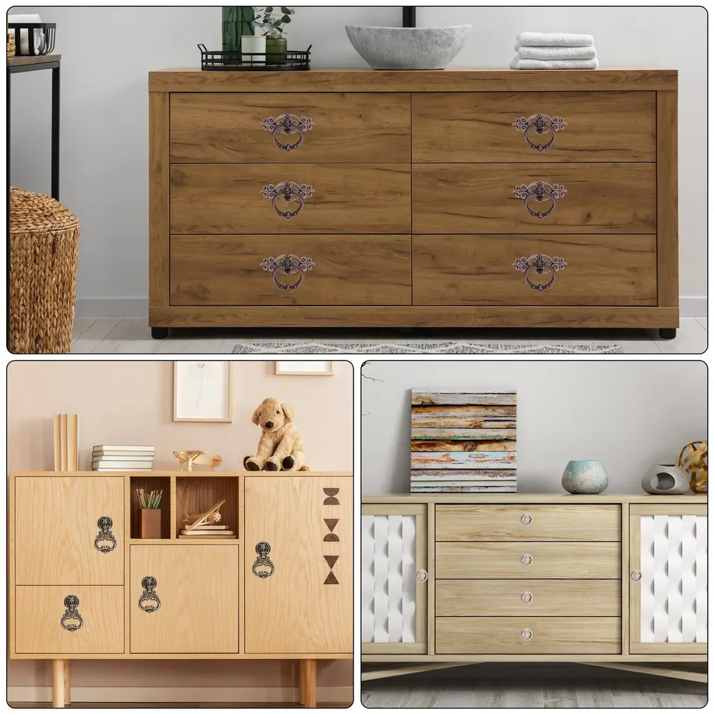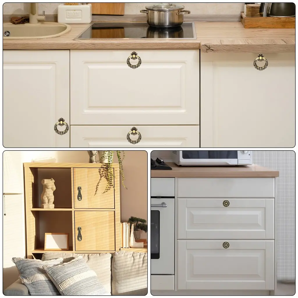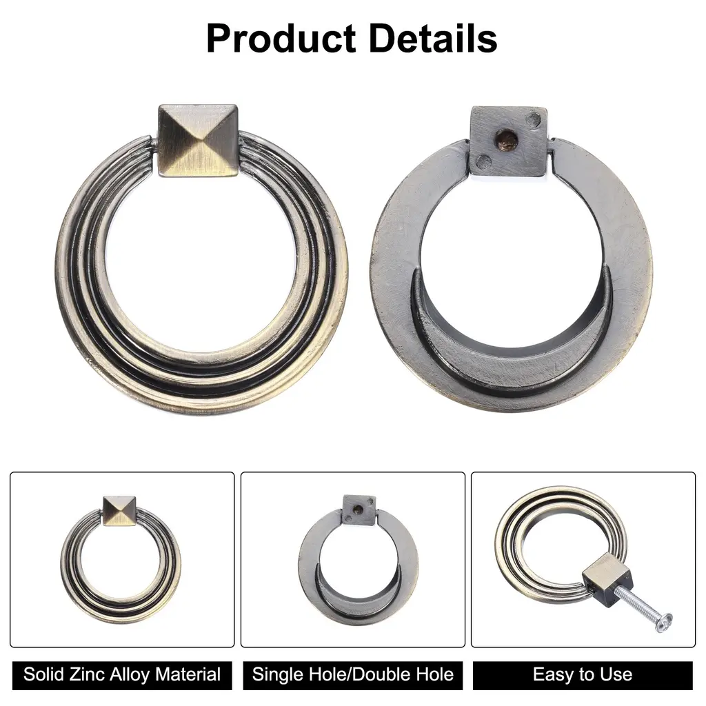 Description:1. The vintage ring drawer pulls are made of tough zinc alloy material, not easily damaged, ensuring durability and long-lasting use.2. These retro dresser pulls feature a classic ring design, adding a touch of elegance and vintage charm to any space. The drawer pulls are decorative and functional, providing a comfortable grip for easily opening and closing drawers.3. To install the drawer pulls, screw them onto the desired furniture piece using the included screws, ensuring a secure and stable attachment.4. These vintage ring drawer pulls are suitable for use in various settings, such as bedrooms, living rooms, kitchens, and bathrooms, adding a stylish accent to cabinets, dressers, and other storage units.5. When installing the drawer pulls, measure and mark each pull's placement to ensure a uniform appearance. Additionally, do not use excessive force when tightening the screws to prevent damage to the drawer or furniture.Specification:Material: Zinc AlloyColor: BronzeTotal Length: 4.5cm/1.8"Total Width: 4.3cm/1.7"Total Height: 0.7cm/0.3"Package Included: 2 sets x ring drawer pulls with screw