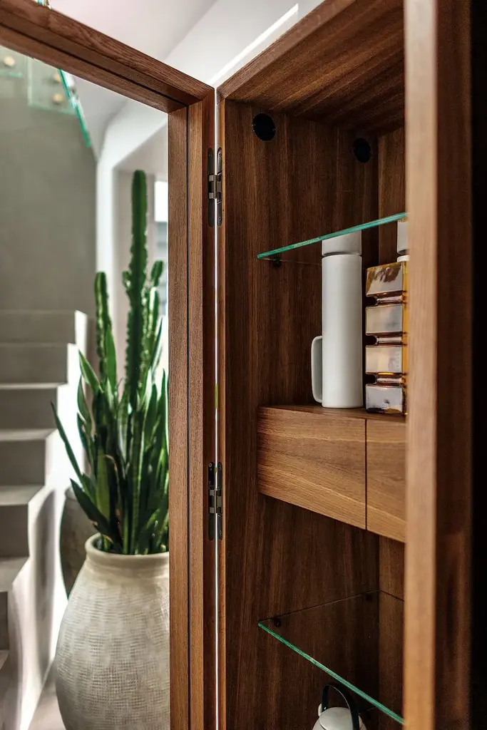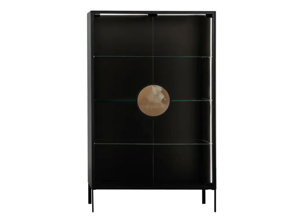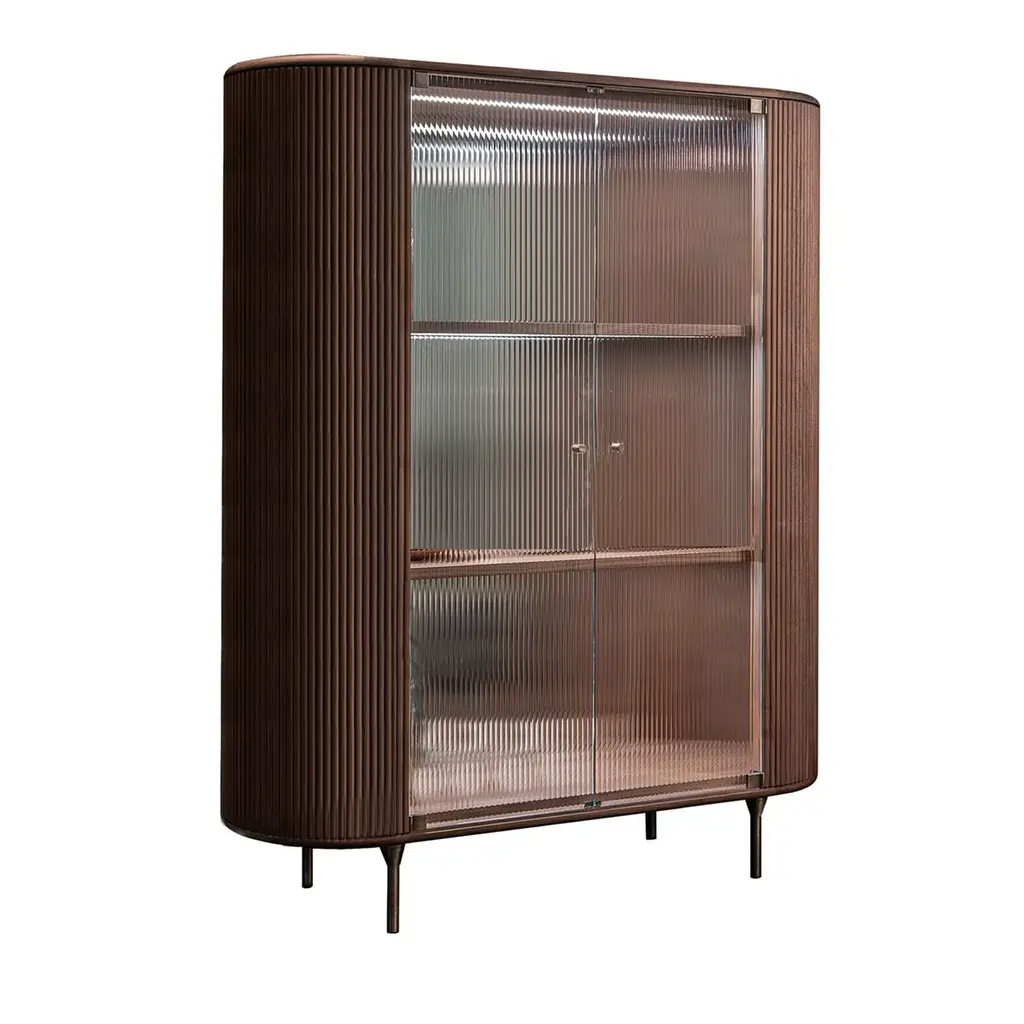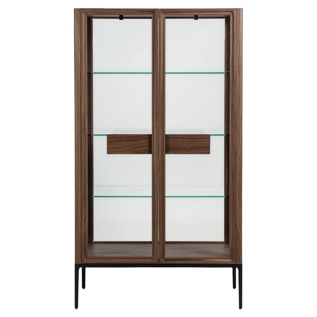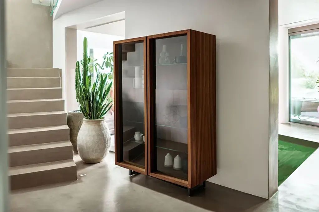 Vitrea is a multifunctional storage unit in blockboard, with glass doors with wooden frame, opening to 180°, and iron base with U-shaped legs. The unit and the interior accessories are designed to meet storage and functional needs. The inside is illuminated by LED strips along the inner sides.AVAILABLE FINISHES:A1: walnut without knots, walnut with knotsA2: oak without knots, oak with knots, cherryA4: oak without knots pigmented: milk white, total blackoak with knots pigmented: milk white, total blackN.B.: pigmented surfaces only outside, oak insideAVAILABLE FINISHES - DOORSE1: glass: clear / extra-clear, satin-finishedE2: glass: smoked, bronzedE3: RAL lacquered glass (selected colours only)E4: glass + fabric, glass 130, moulded glassAVAILABLE FINISHES - GLASS SHELVES 1:E1: glass: clear / extra-clear, frostedE2: glass: smoked, bronzedE3: RAL lacquered glass (selected colours only)E4: glass + fabric, glass 130, moulded glassAVAILABLE FINISHES - BASEB2: lacquered iron: irondust, RAL (selected colours only)B3: matt brushed lacquered iron: antique bronze, steel, titanium