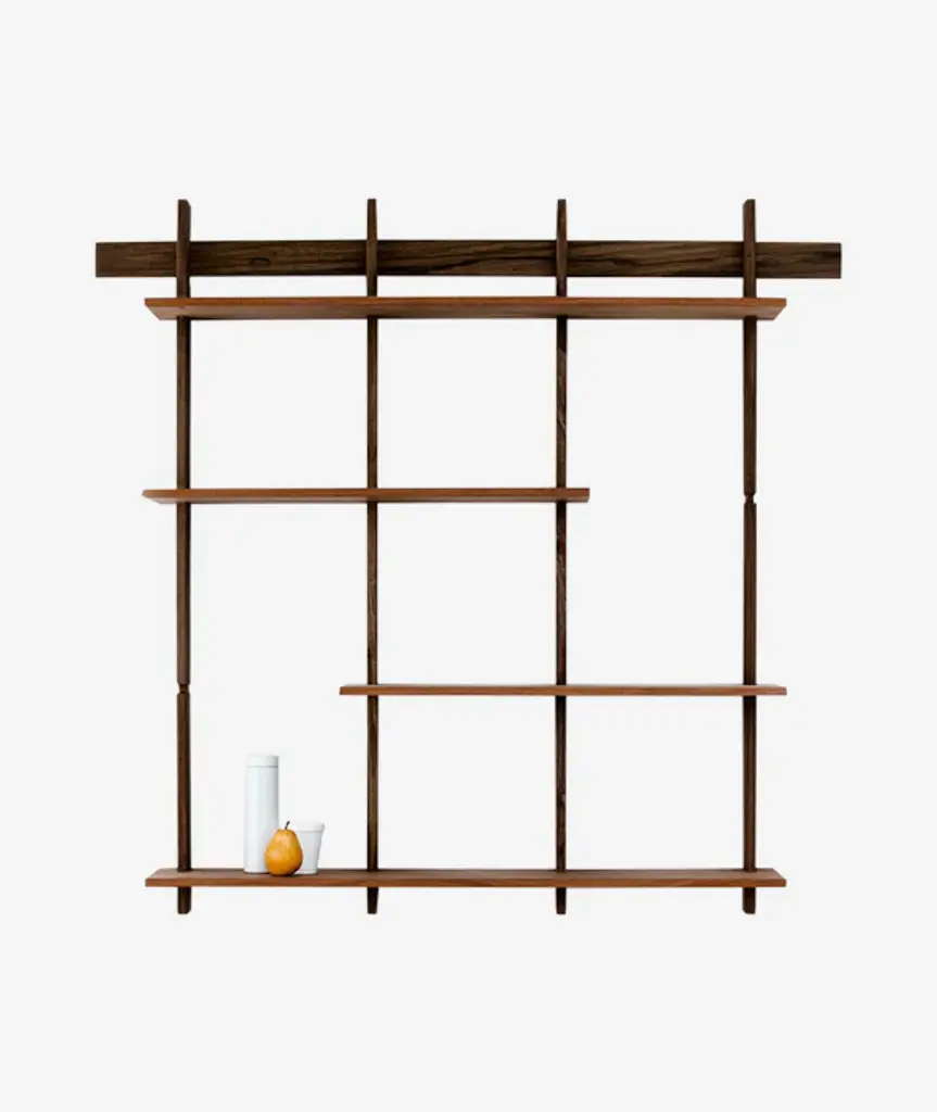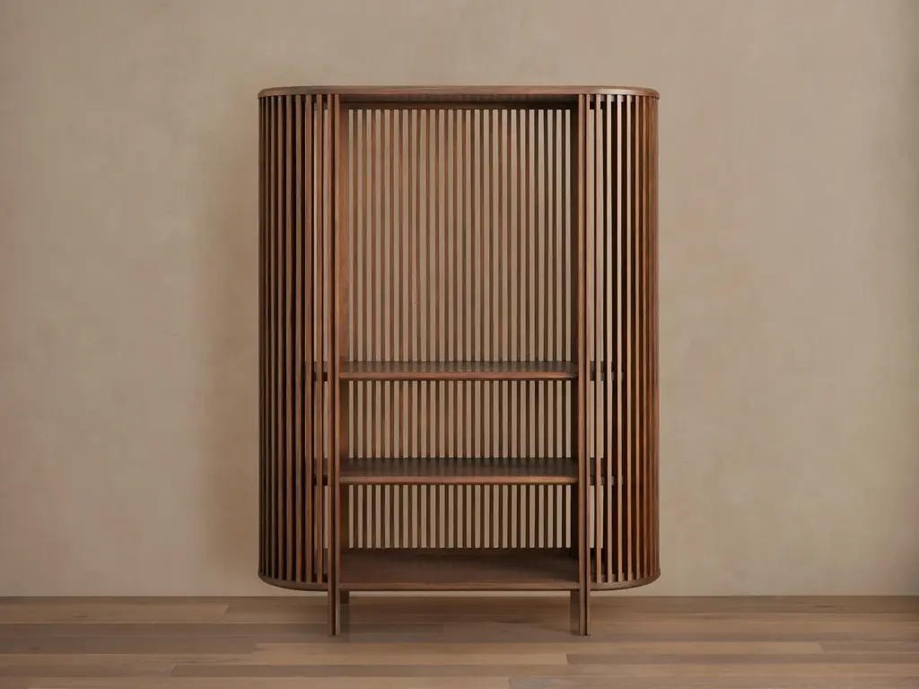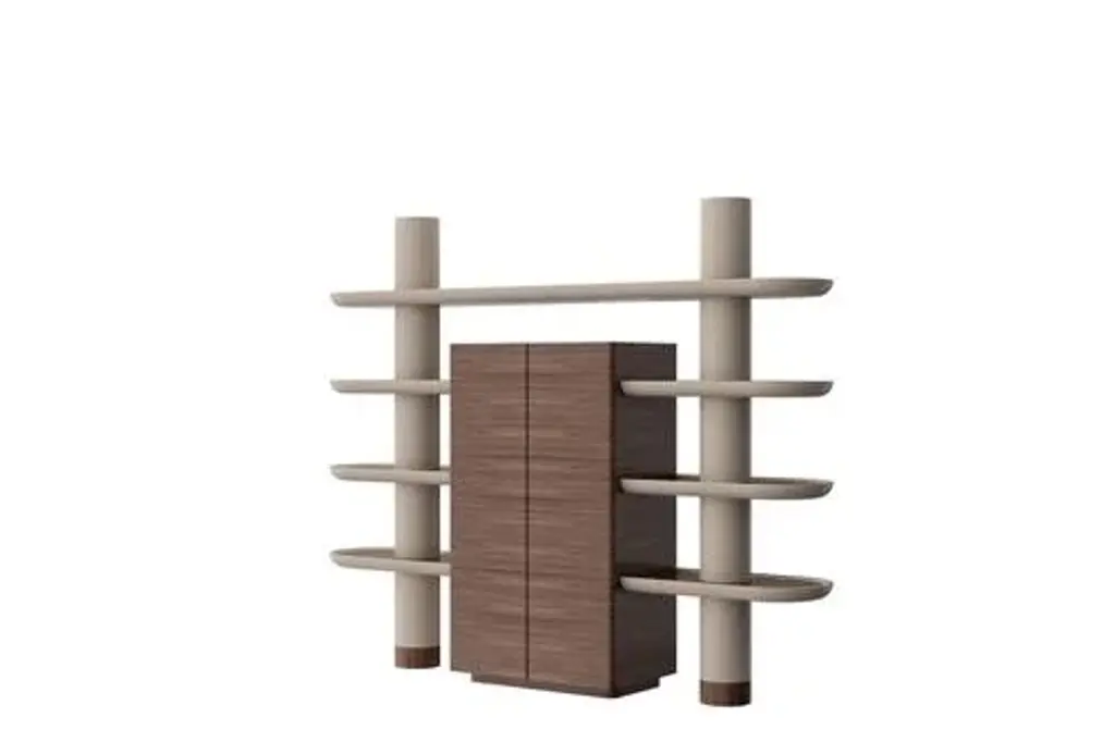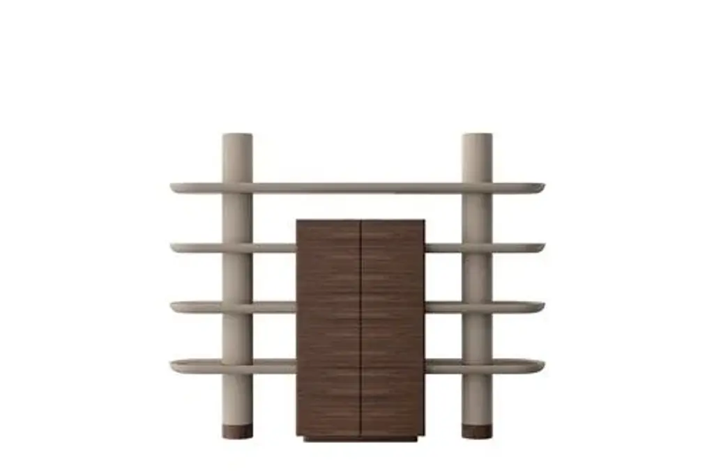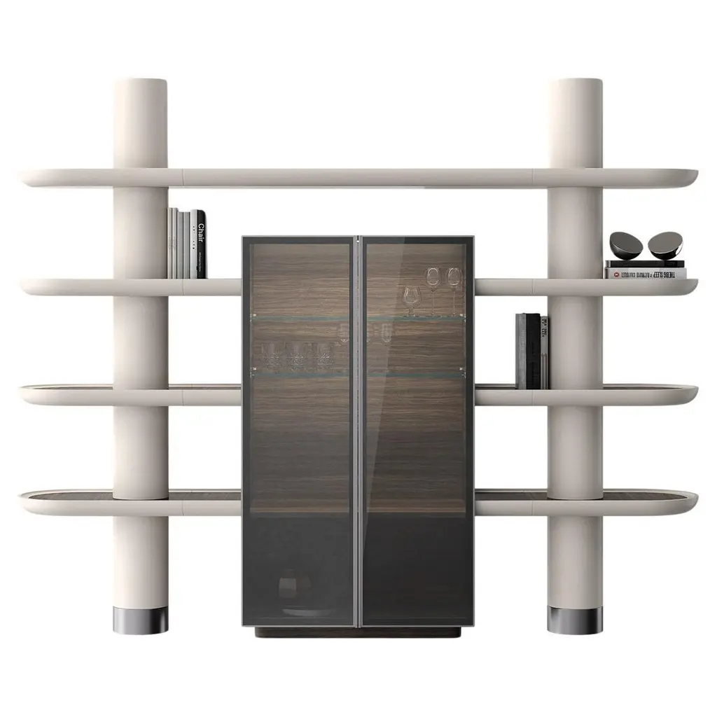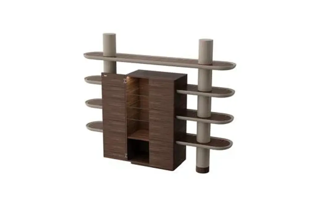 Mina int 1, walnut modular bookcase library wall units by ultramobili dimensions: w 240 x d 47.5 x h 194 cm materials: walnut canaletto. Modular composition of bookcase with integrated storage unit in walnut canaletto (noce canaletto). Two-doors cabinet with wooden and glass shelves and led lighting. Presented in mat lacquered finish col. M/ mega greige and natural walnut canaletto inserts on shelves.
