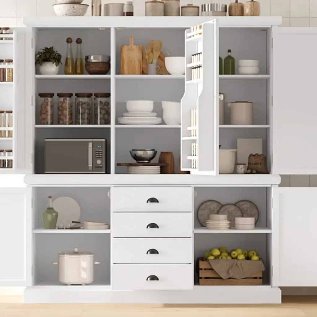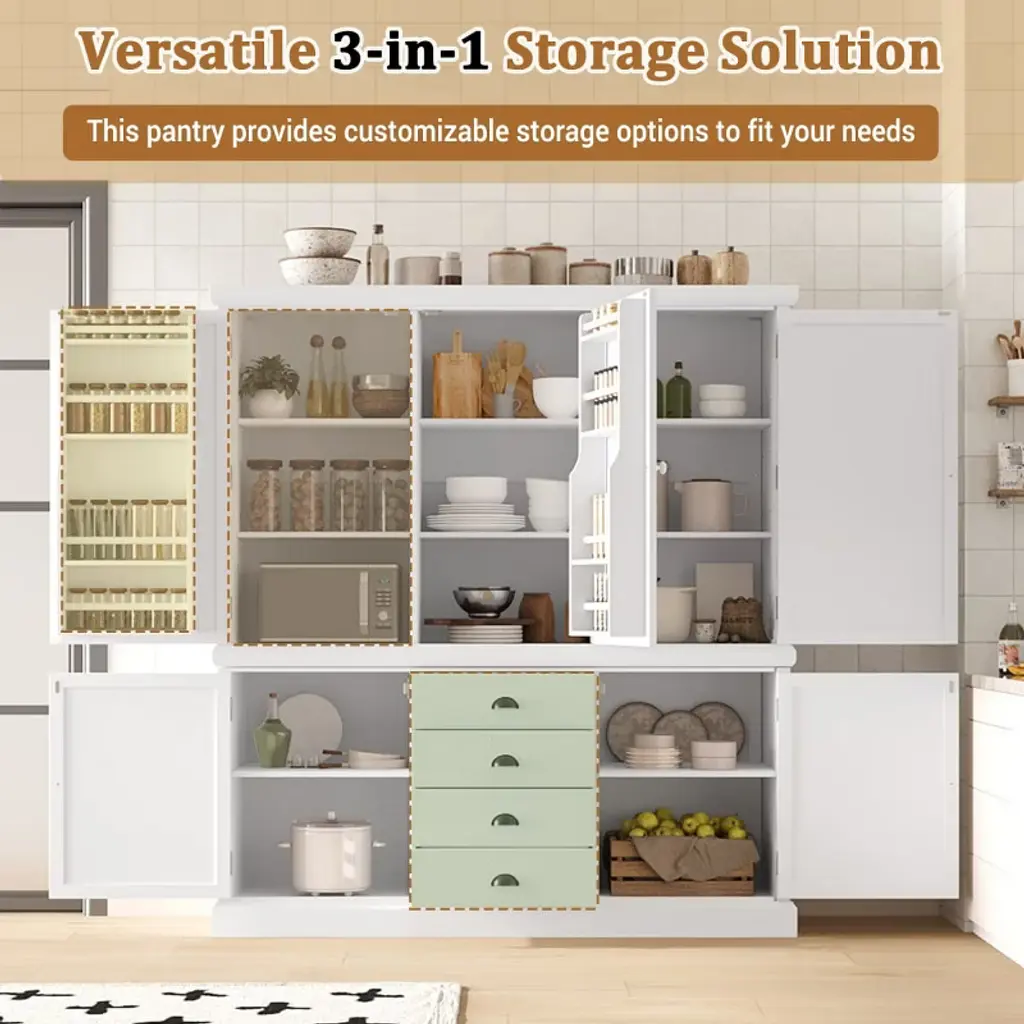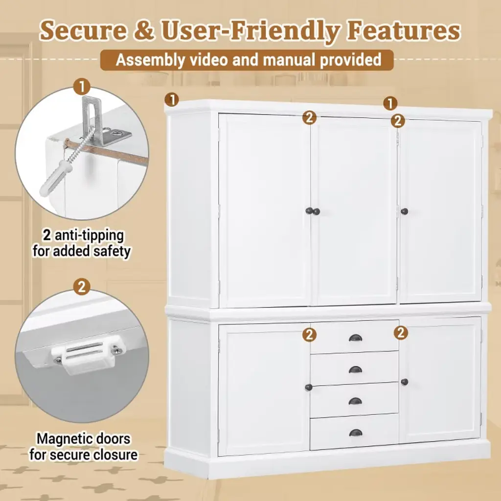 Upgrade your kitchen organization with this freestanding kitchen pantry cabinet, designed to offer 30% more space than standard storage units. Crafted from durable painted pine wood, this wooden pantry cabinet is built to last while providing a clean, modern look for your kitchen, dining area, or utility room. Featuring 2 top cabinets, 2 bottom cabinets, 4 center drawers, and 8 adjustable shelves, it offers a versatile 3-in-1 storage solution for pantry goods, dinnerware, cookware, and more. Magnetic doors ensure secure closure, while two included anti-tip devices enhance safety—ideal for households with children or pets. The adjustable shelf system allows you to easily store items of various heights, helping reduce clutter and maximize space. With user-friendly assembly instructions and a neutral design that blends with most interiors, this kitchen and dining storage cabinet is as practical as it is stylish.