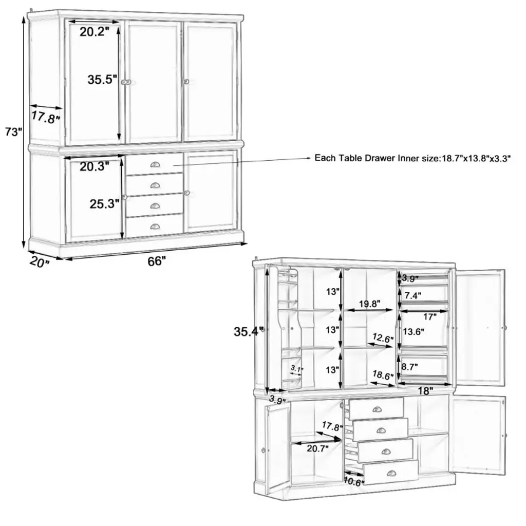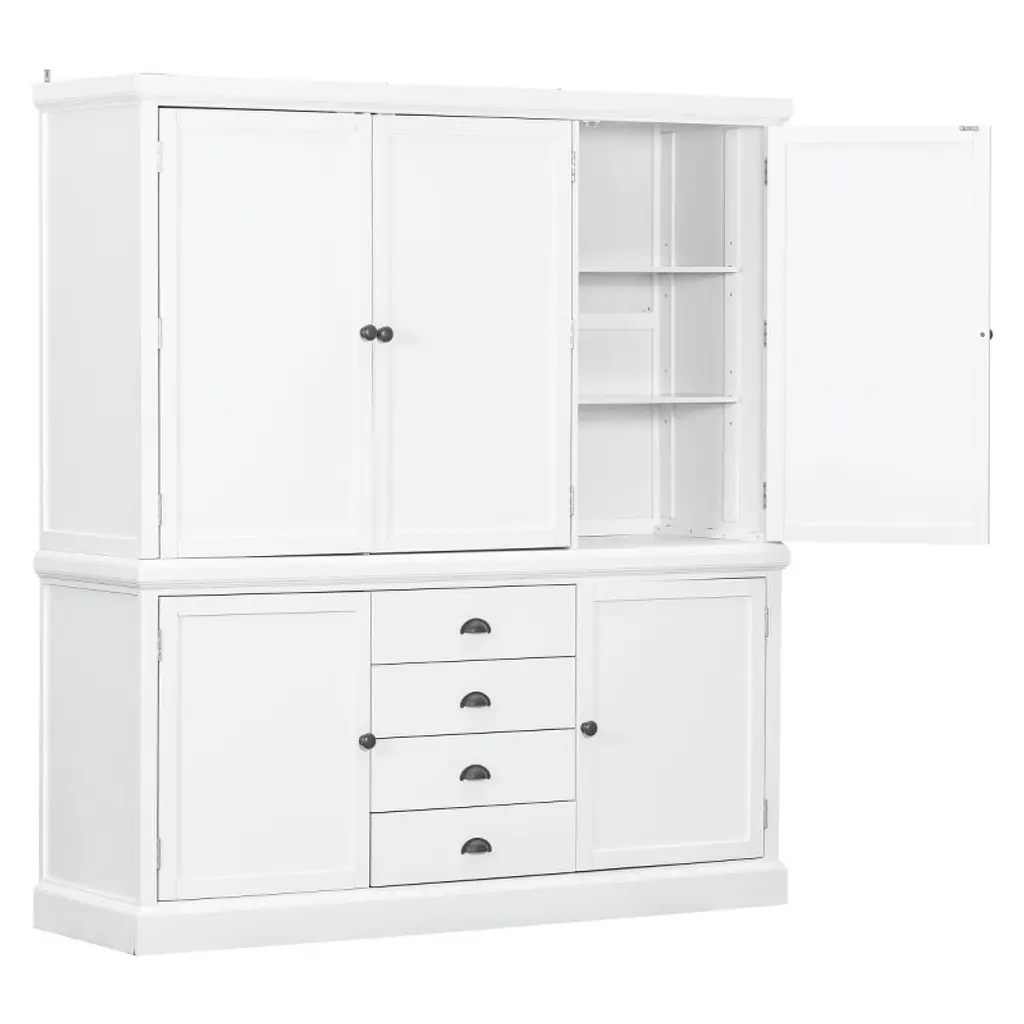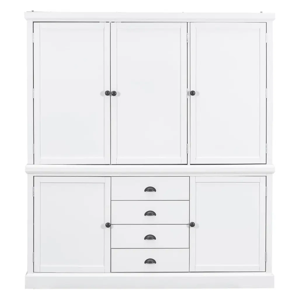 Upgrade your kitchen organization with this freestanding kitchen pantry cabinet, designed to offer 30% more space than standard storage units. Crafted from durable painted pine wood, this wooden pantry cabinet is built to last while providing a clean, modern look for your kitchen, dining area, or utility room. Featuring 2 top cabinets, 2 bottom cabinets, 4 center drawers, and 8 adjustable shelves, it offers a versatile 3-in-1 storage solution for pantry goods, dinnerware, cookware, and more. Magnetic doors ensure secure closure, while two included anti-tip devices enhance safety—ideal for households with children or pets. The adjustable shelf system allows you to easily store items of various heights, helping reduce clutter and maximize space. With user-friendly assembly instructions and a neutral design that blends with most interiors, this kitchen and dining storage cabinet is as practical as it is stylish.