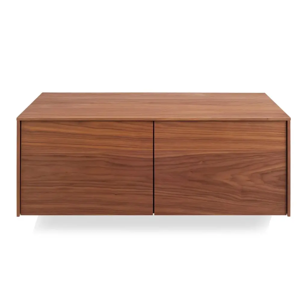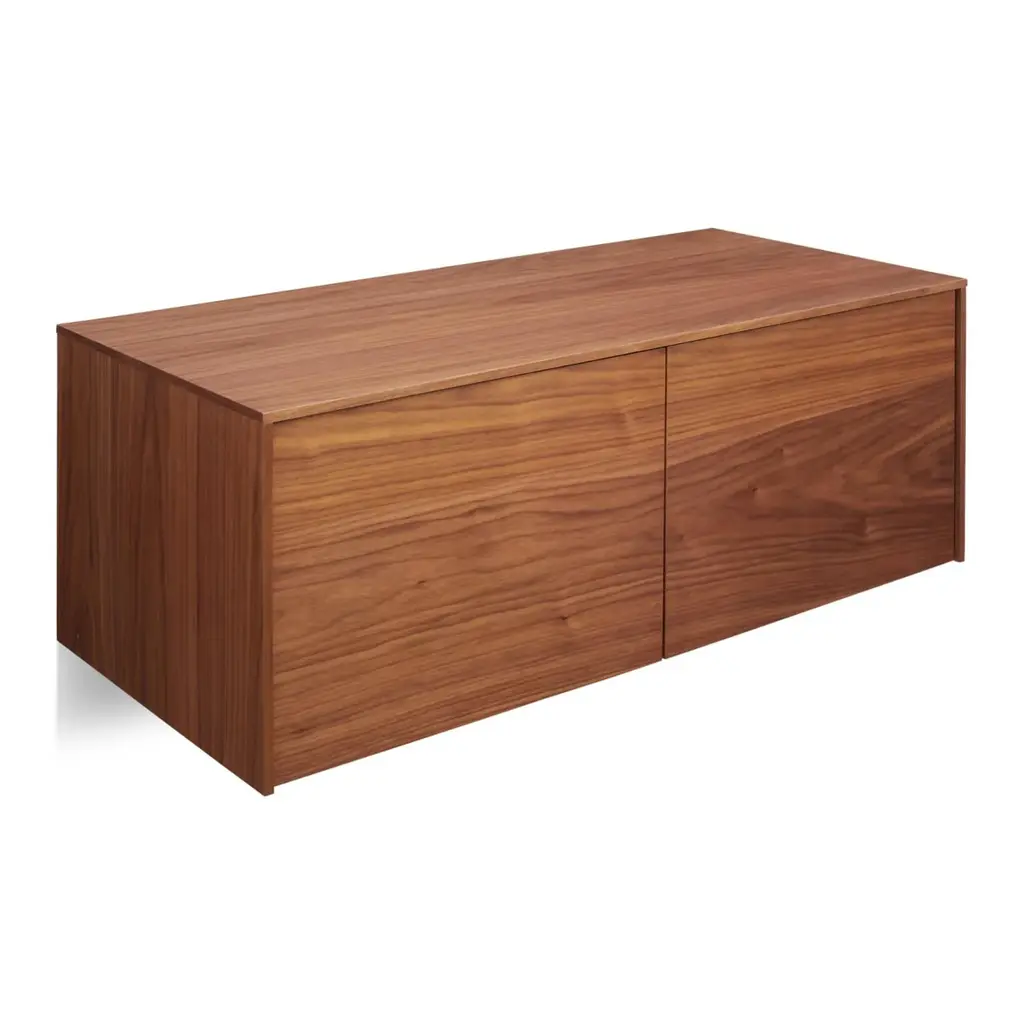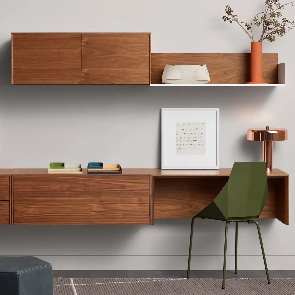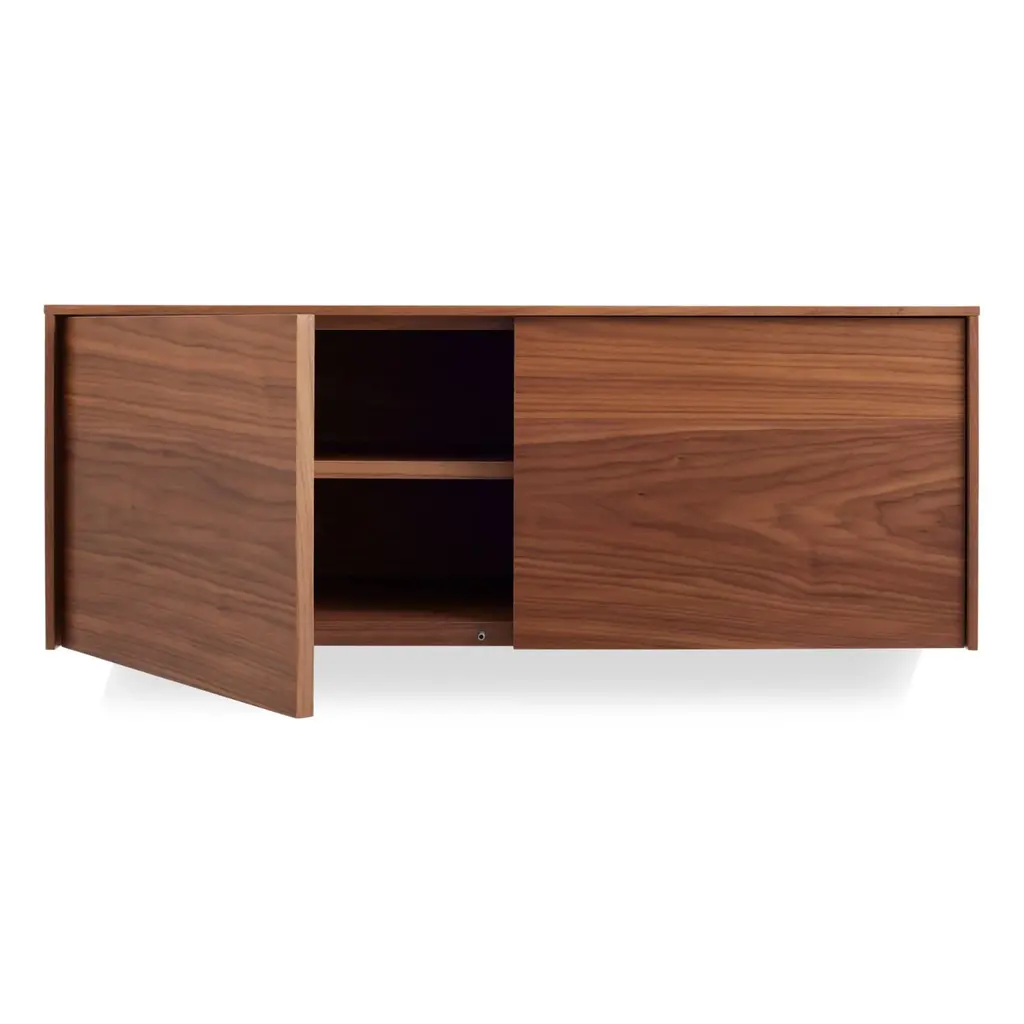 The Blu Dot Wonder Wall Cabinet is a handsome wall-mounted storage unit that has the look of a custom designed cabinet. Beautifully finished in walnut veneer, this modern cabinet has two doors and an adjustable interior shelf that provides ample storage without the need for floor space. Designed to be mounted alone or to be paired with companion Blu Dot Wonder Wall desk or drawers, this Blu Dot design is a versatile option for home office, kitchen, bedroom, and virtually any other space. Features