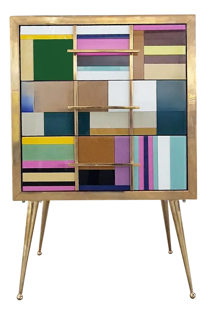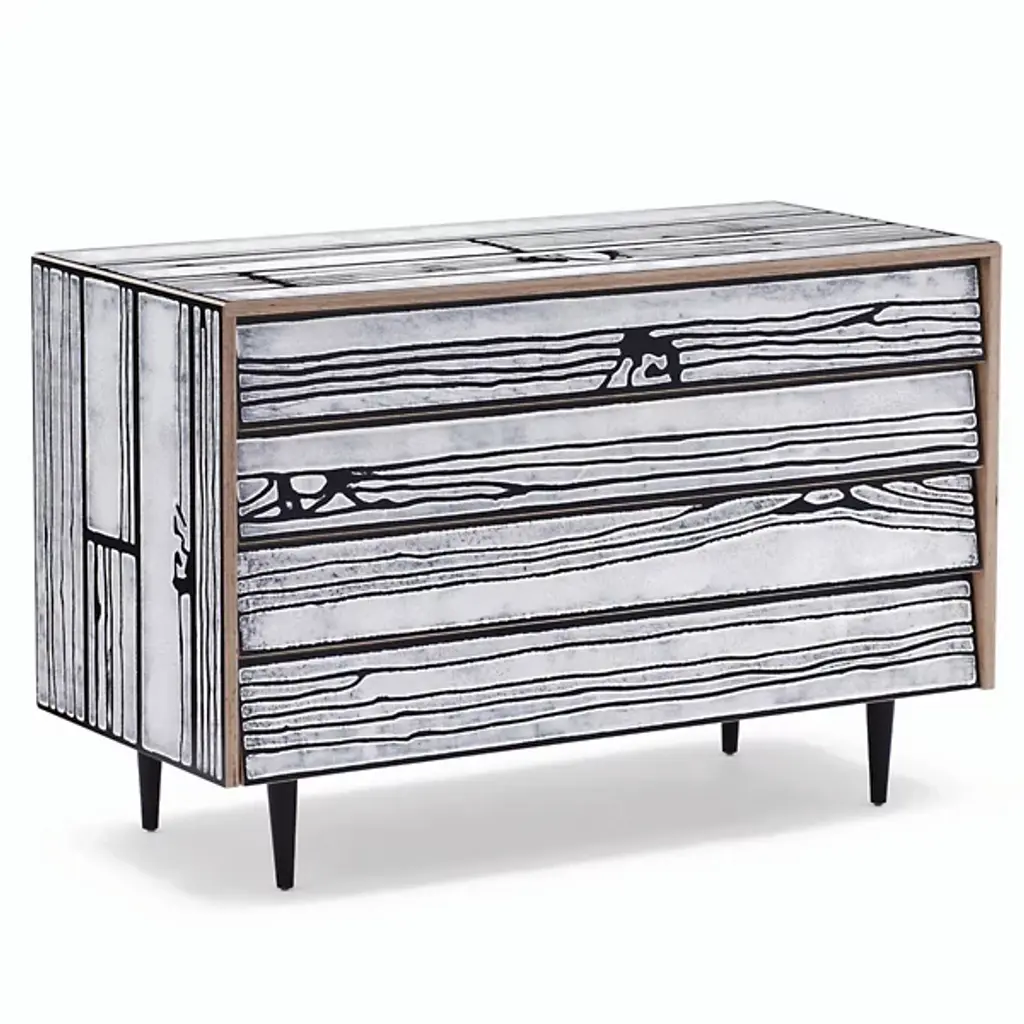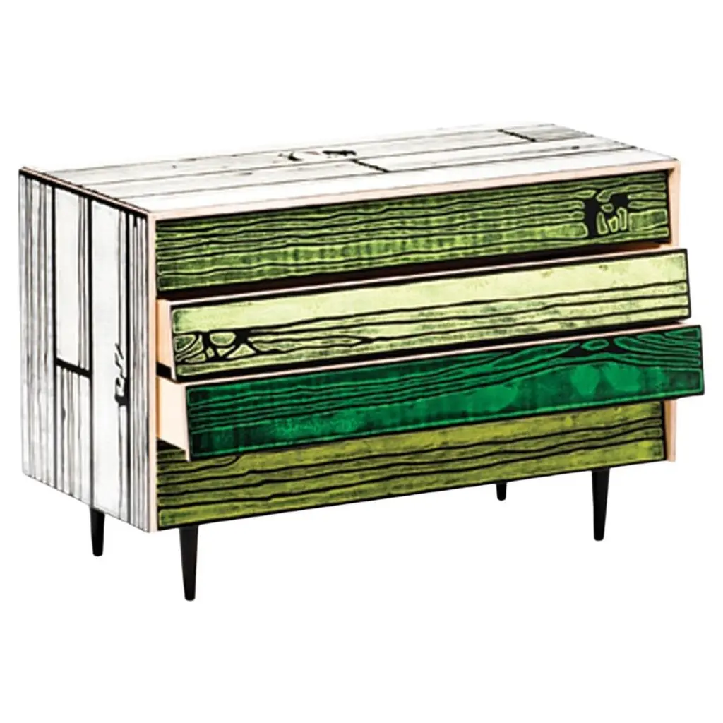 British artist Richard Woods is renowned for his work with garish and repetitious motifs. He has applied these to facades, floors and walls across the world in commissioned work and gallery installations. These ‘logos’ are often abstractions and interpretations of domestic pattern, the woodblock print being a particularly recognisable signature print. Designer Sebastian Wrong teamed up with Woods for Established & Sons’ programme of collaborations where individuals from two creative fields work together. Woods’ block printed motifs were applied to Wrong’s utilitarian cabinets. These storage units are reminiscent of 1950s furniture – a fitting vehicle because much of Woods’ work is based on a nostalgia for mid-century domestic interiors.DimensionsNight Table: L585mm × D355mm × H595mm 16kgChest of Drawers: L1090mm × D510mm × H735mm 70kgLow Cabinet: L1500mm × D405mm × H645mm 60kgLong Low Cabinet: L2600mm × D405mm × H645mm 140kgMaterialsPlywood, timber, paint, clear lacquerNotes: Artisan material and process, variations occurColoursNight Table:Pink with blue, white with black, white with green, yellow with redChest of Drawers:Pink with blue, white with black, white with green, yellow with redLow Cabinet:Pink with blue, white with black, white with green, yellow with red, light grey with dark greyLong Low Cabinet:Pink with blue, white with black, white with green, yellow with red.