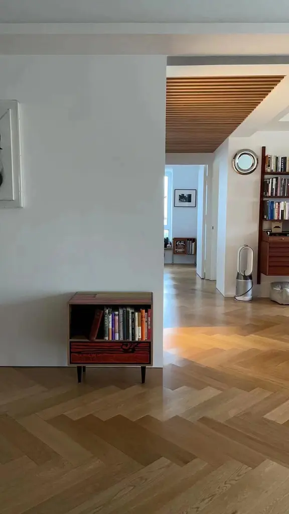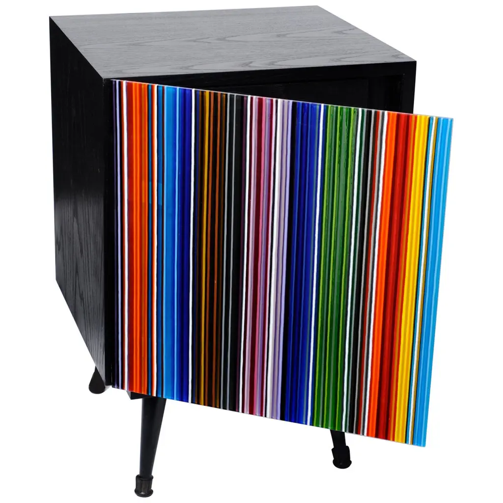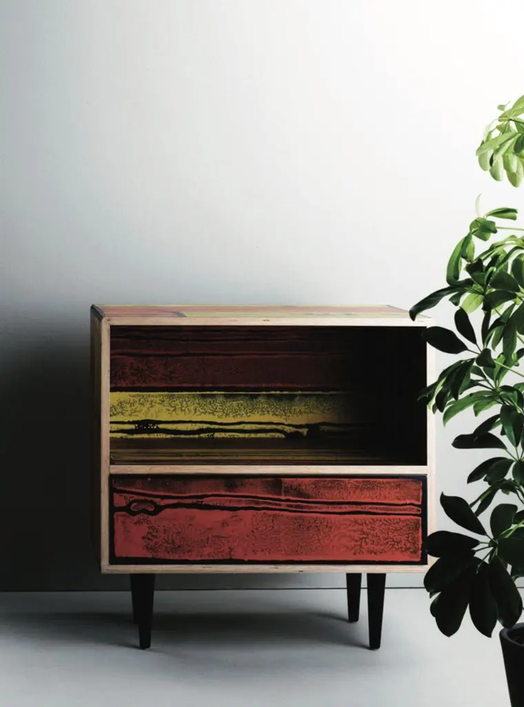 British artist Richard Woods is renowned for his work with garish and repetitious motifs. He has applied these to facades, floors and walls across the world in commissioned work and gallery installations. These ‘logos’ are often abstractions and interpretations of domestic pattern, the woodblock print being a particularly recognisable signature print. Designer Sebastian Wrong teamed up with Woods for Established & Sons’ programme of collaborations where individuals from two creative fields work together. Woods’ block printed motifs were applied to Wrong’s utilitarian cabinets. These storage units are reminiscent of 1950s furniture – a fitting vehicle because much of Woods’ work is based on a nostalgia for mid-century domestic interiors.DimensionsNight Table: L585mm × D355mm × H595mm 16kgChest of Drawers: L1090mm × D510mm × H735mm 70kgLow Cabinet: L1500mm × D405mm × H645mm 60kgLong Low Cabinet: L2600mm × D405mm × H645mm 140kgMaterialsPlywood, timber, paint, clear lacquerNotes: Artisan material and process, variations occurColoursNight Table:Pink with blue, white with black, white with green, yellow with redChest of Drawers:Pink with blue, white with black, white with green, yellow with redLow Cabinet:Pink with blue, white with black, white with green, yellow with red, light grey with dark greyLong Low Cabinet:Pink with blue, white with black, white with green, yellow with red.