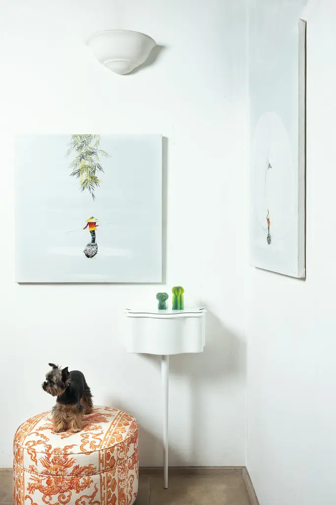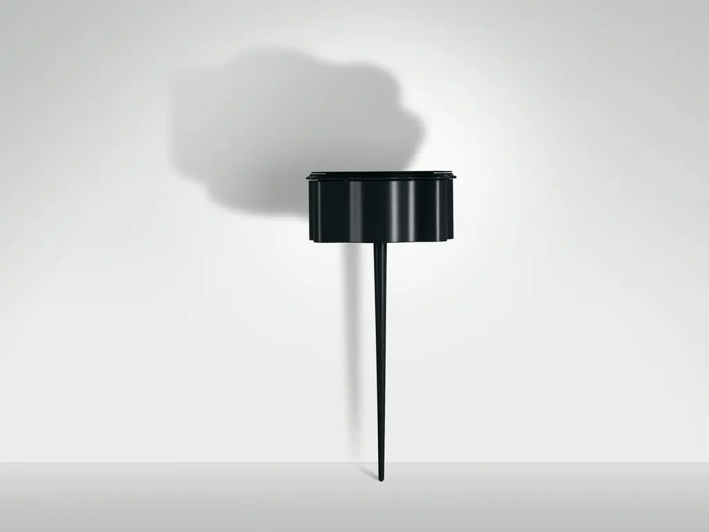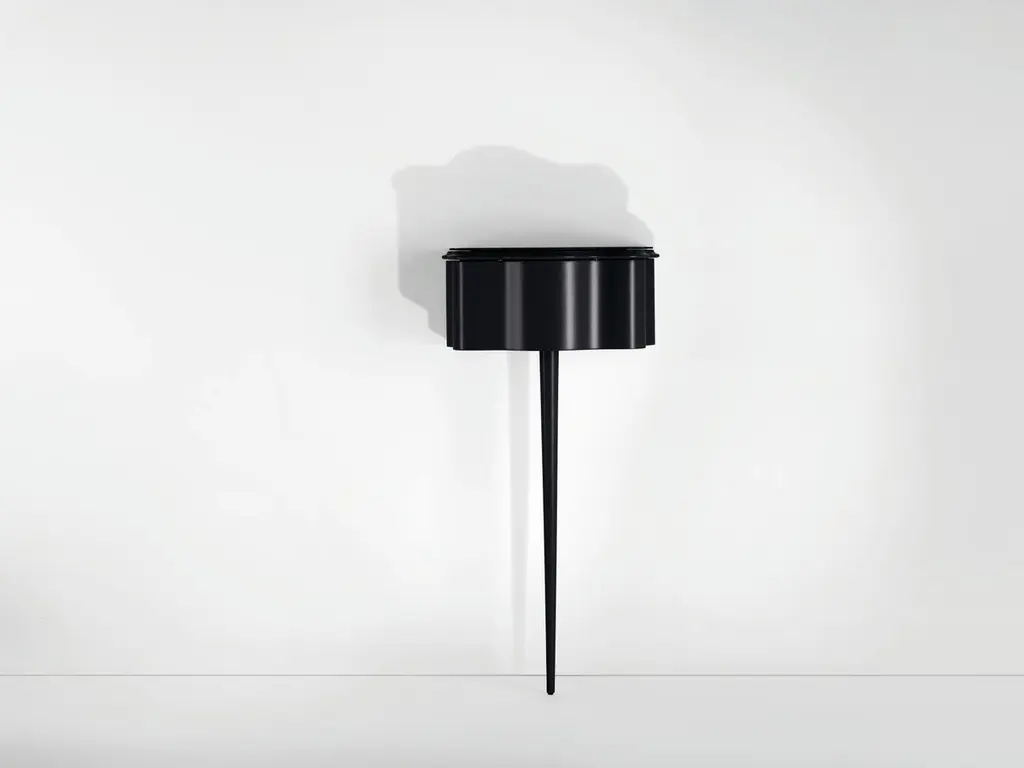 Service storage unit. Frame and drawer in painted wood, in the shades black and white. Plate glass top in the same colours.Milo CM and Carlino CM, both designed for the Miller House, represent the expression of Mollino's concept of beauty, in the sweetness of their elegant and sinuous lines.They are two furnishings that go beyond the boundary of design, and that become fantastic intersections: "bizarre, nervous, intelligent and maniacal beings" (Gio Ponti, Domus n. 238).The Carlino CM bedside table is made of black or white lacquered solid wood and is supported by a single pointed leg. The drawer slides internally on a wooden guide and is refined with a leather pad that covers the bottom; the top is in black or white back painted glass.