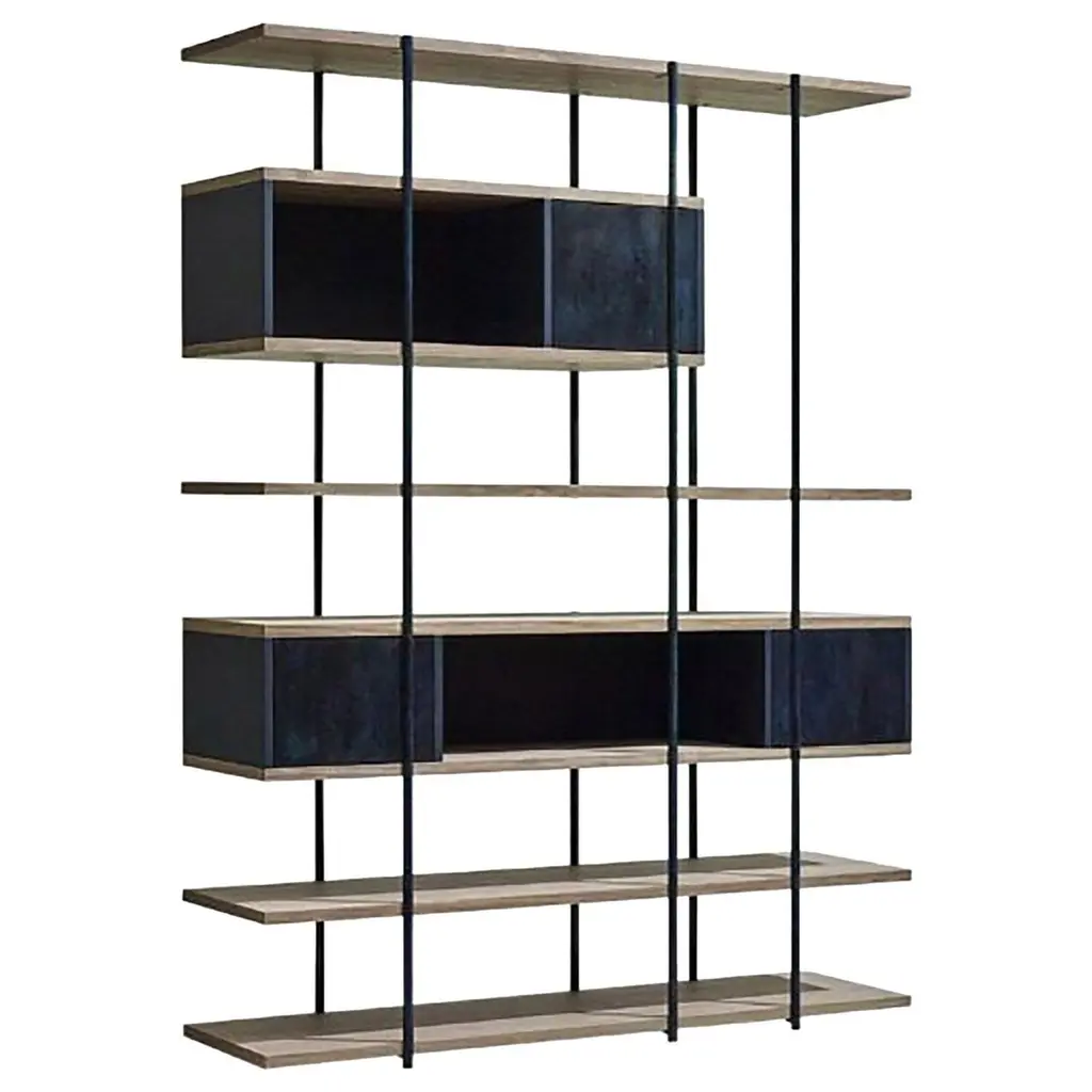 Ideally showcased against the walls of a living room, bedroom, or office, alike, this bookcase is a study in functionality and minimalist elegance. Cylindrical elements comprise the bronze-finished steel frame, which steadily holds together the six durmast-veneered boards for five spacious storage units. Equipped with some coordinated metal inserts, the design comes in multiple finishing variants upon request.