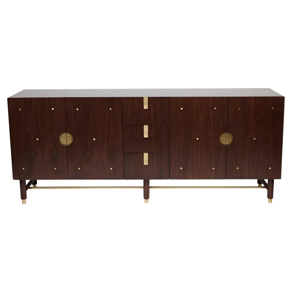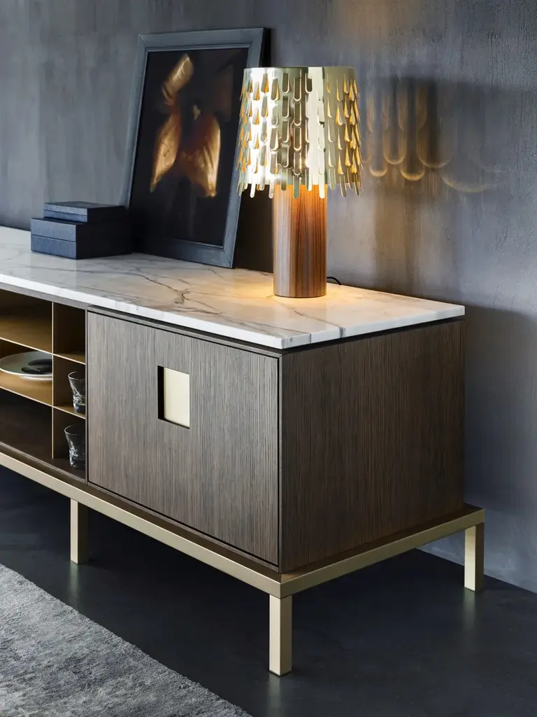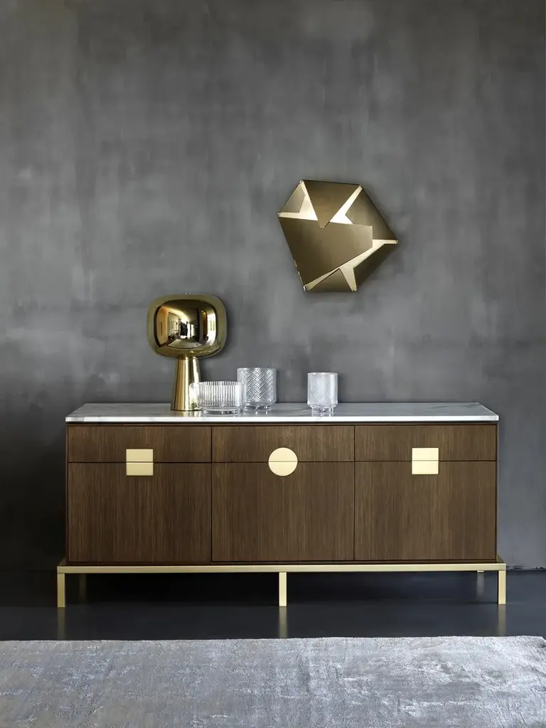 Zuan Dining CabinetStructure30x30mm squared tubular in satin brass and lacquered Mahogany feather veneered melamine container, matte polished with filling bottom Visible shelving in satin brass. Top in Green Alps marble. Handles in satin brass.InteriorInterior shelving and internal bases covered in natural leather.Elegant cabinet with essential lines of Japanese flavor. The slender structure in essence is opposed by four slim legs in gilded metal. Zuan is recognizable by the detail of the support, a quarter of a circle with great aesthetic and functionality, which defines the character of the storage unit. The central compartment, closed by essential brass handles, has shelves in Verde Alpi marble, a gesture of surprising refinement. The upper part of the cabinet is divided into four sections, in turn divided into smaller niches, drawn according to the golden proportion, inscribable in a perfect spiral. A wunderkabinet to exhibit our wonders.“Different cultural needs and references in time and space are combined in the "Zuan" cabinet collection. The timeless classical Chinese cabinets and the eighteenth-century English "chests" are revisited and updated. The single piece combines three materials in a variable and versatile way: brass, wood and marble. The brass for the support frames and partition walls, the wood for the containers and the marble for the support surfaces.The passionate quality of traditional cabinetmakers is supported by engineering in all production phases and by numerical control technologies, from the general scale to that of detail. The result is a product freed from fashions and boundaries." Paolo Rizzatto