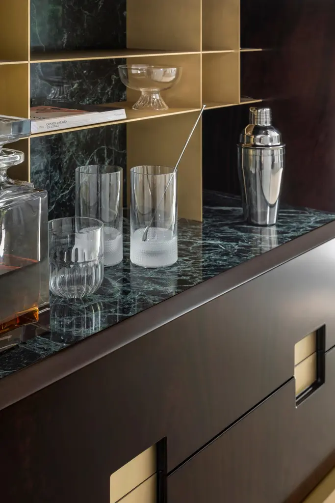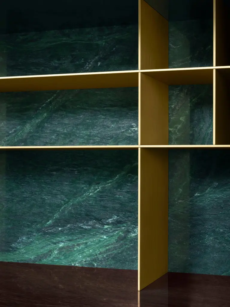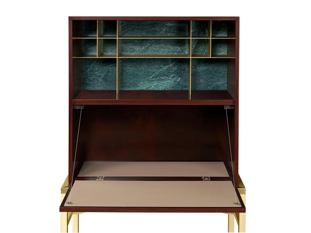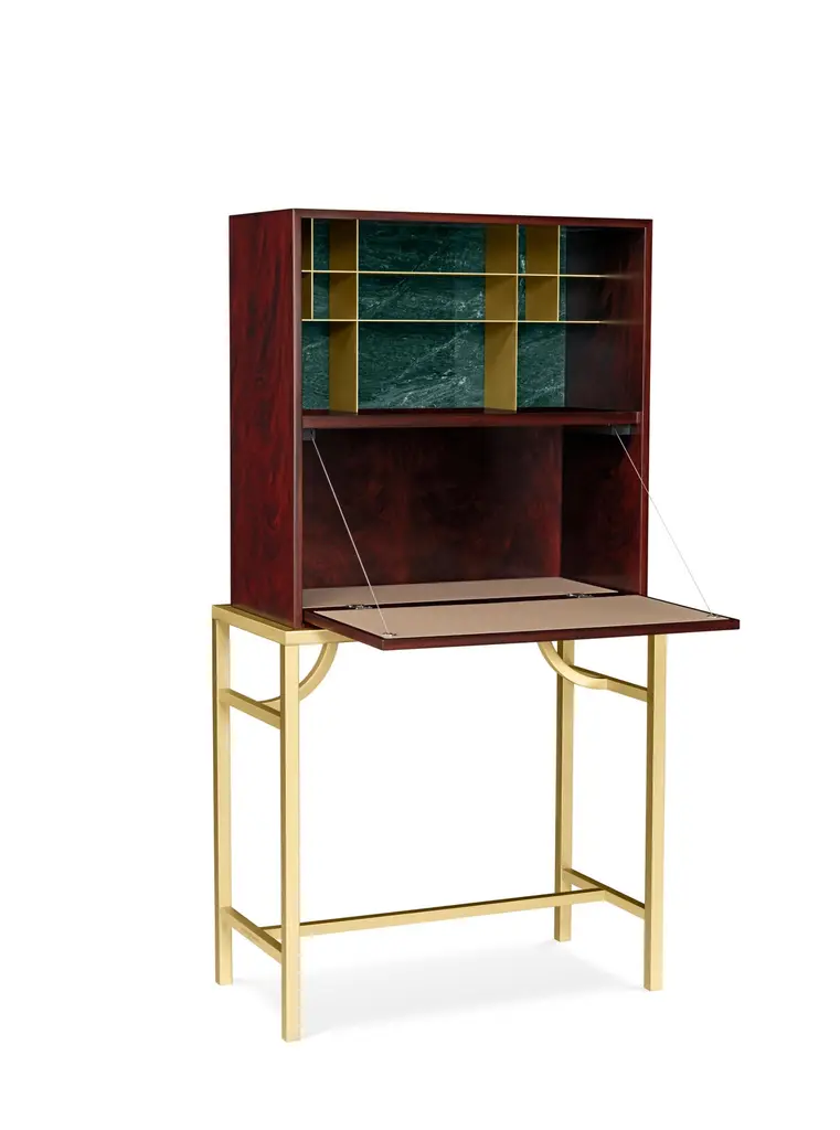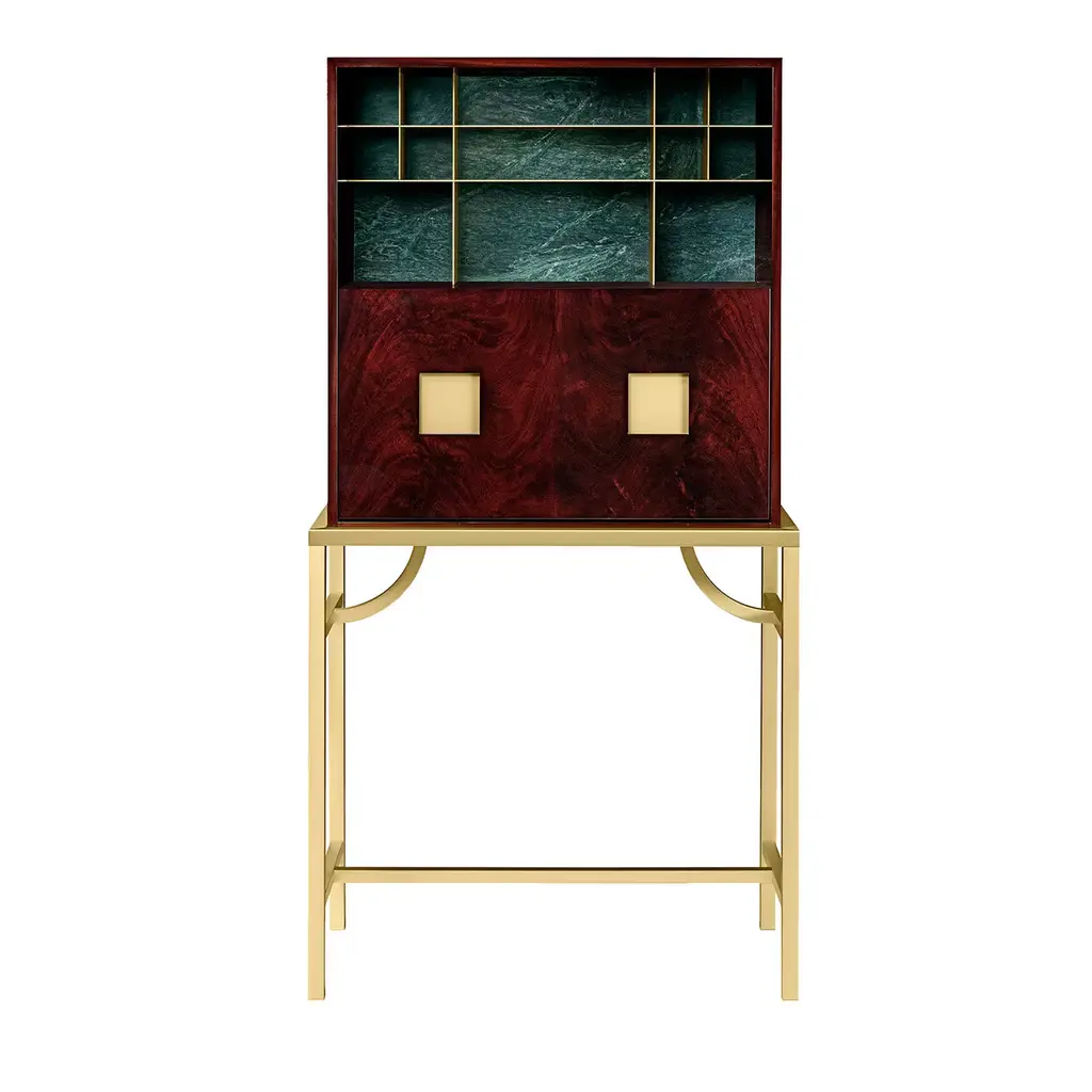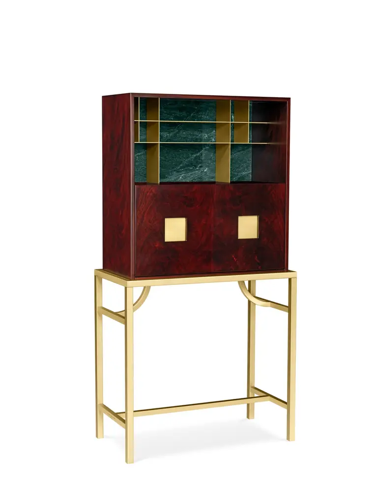 Elegant cabinet with essential lines of Japanese flavor. The slender structure in essence is opposed by four slim legs in gilded metal. Zuan is recognizable by the detail of the support, a quarter of a circle with great aesthetic and functionality, which defines the character of the storage unit. The central compartment, closed by essential brass handles, has shelves in Verde Alpi marble, a gesture of surprising refinement. The upper part of the cabinet is divided into four sections, in turn divided into smaller niches, drawn according to the golden proportion, inscribable in a perfect spiral. A wunderkabinet to exhibit our wonders.“Different cultural needs and references in time and space are combined in the "Zuan" cabinet collection. The timeless classical Chinese cabinets and the eighteenth-century English "chests" are revisited and updated. The single piece combines three materials in a variable and versatile way: brass, wood and marble. The brass for the support frames and partition walls, the wood for the containers and the marble for the support surfaces.The passionate quality of traditional cabinetmakers is supported by engineering in all production phases and by numerical control technologies, from the general scale to that of detail. The result is a product freed from fashions and boundaries."Structure: 30x30mm squared tubular in satin brass and lacquered Mahogany feather veneered melamine container, matte polished with filling bottom Visible shelving in satin brass. Top in Green Alps marble. Handles in satin brass.Interior: Interior shelving and internal bases covered in natural leather.Additional Information:Material: Brass, Mahogany and Verde Alpi marbleFinish: Satin brassTop: Verde Alpi marbleDimensions: W 89 x D 44 x H 170 cmAvailable in other wood finish option: Striped oak, canaletto walnut, bolivar, new lime, caleidoAvailable in other top options: Calacatta gold, carrara white, emperador dark, sahara noir, eramosa brownAvailable in other finish options: Polished brass, light burnished brass, brown burnished brass, dark burnished brass, black gold