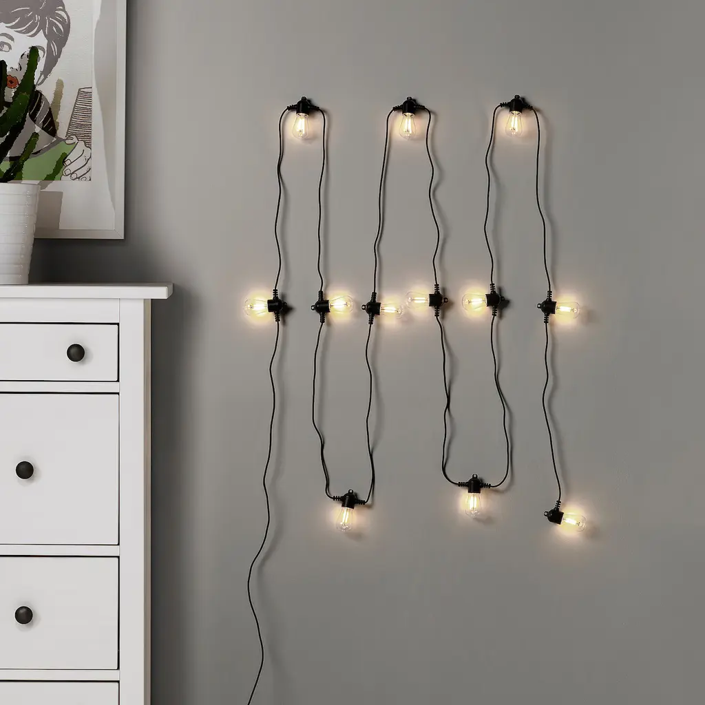 GARDJÄRN LED string light with 12 lights - black/outdoor. Approved for outdoor use (IP44), so it can light up both the living room and outdoor spaces like a balcony, terrace or garden. Built-in LED light source. Approved for use as outdoor lighting, IP 44. Can be used indoors as well.