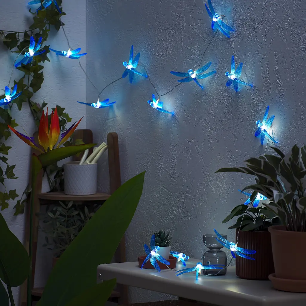 SKINA LED string light w/16lights,outdoor - dragonfly. Gives a nice decorative light. The LED light source consumes up to 85% less energy and lasts 20 times longer than incandescent bulbs. Built-in LED light source. LED life approx. 20,000 hours. Light color: natural white (4000 Kelvin).