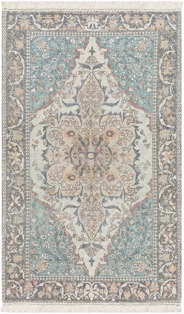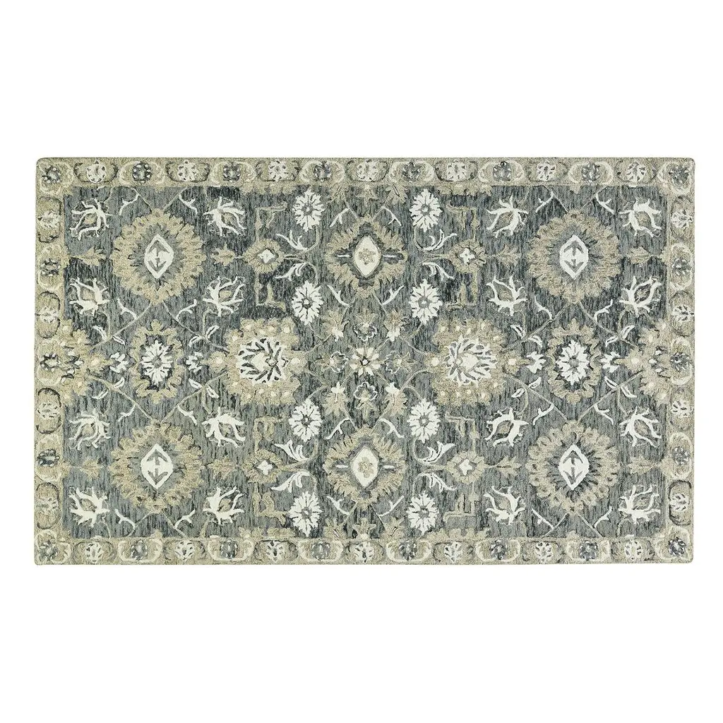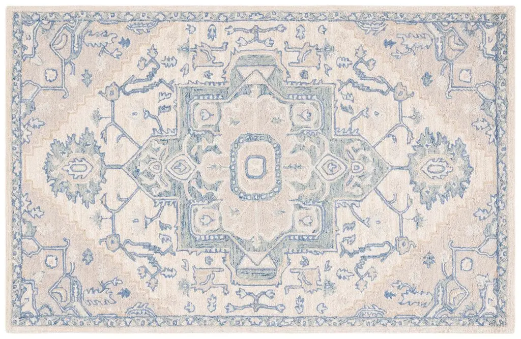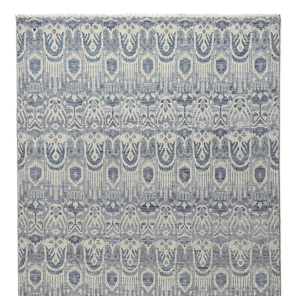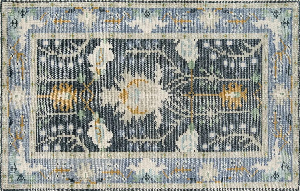 Atlantic blues. A floral motif. Hand sheared pile. At home from the dining room to the deck.