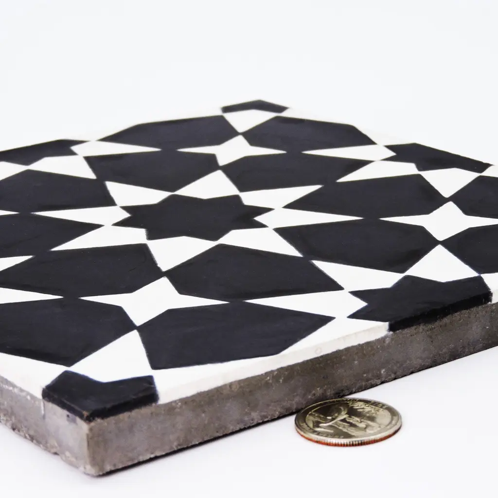Design a dazzling backsplash, floor, or wall with these stunning tiles. Handmade by skilled Moroccan artisans for superior craftsmanship and traditional authenticity. These decorative tiles made from cement are durable indoors and outdoors. Weather-resistant and waterproof, the eco-friendly Moroccan tiles support your commitment to a greener home .Features:Other Sections: Story Behind the Art: "It's more than tile, it's art." That simple statement is what sets the craftsmanship of Moroccan Mosaic apart from the rest. Based in the small city of Sale, Moroccan Mosaic is a family business going back 4 generations. When Simo, the current head of the business graduated from university in New York, he had little interest in the family business. But on a return trip home, he saw that the business was not doing well and set about reviving it. One important change he made was introducing black, grey, and white designs to appeal to American and European customers. It worked. When he started, they employed 2 workers and now they have nearly 80 on staff. The workshop itself is fairly simple, and the techniques used to create the tiles are steeped in tradition. Some modern equipment is available, though the workers prefer to use the more rustic tools. The creative process is time intensive and done by hand, as Simo insists on no corners be cut or production be rushed. Environmentally responsible and resource efficient, no chemicals are used at any step. For example, colors used come from nature literally. Green comes from mint leaves, orange from orange peel, and black from charcoal. The tiles themselves are a simple mixture of cement, sand, and granite powder. Moroccan Mosaic hires only local workers, teaching them a valued skill as well as paying them fair wages. Simo's goals for his business are to share the tradition of gorgeous Moroccan tile, grow the business, and employ more and more workers. \