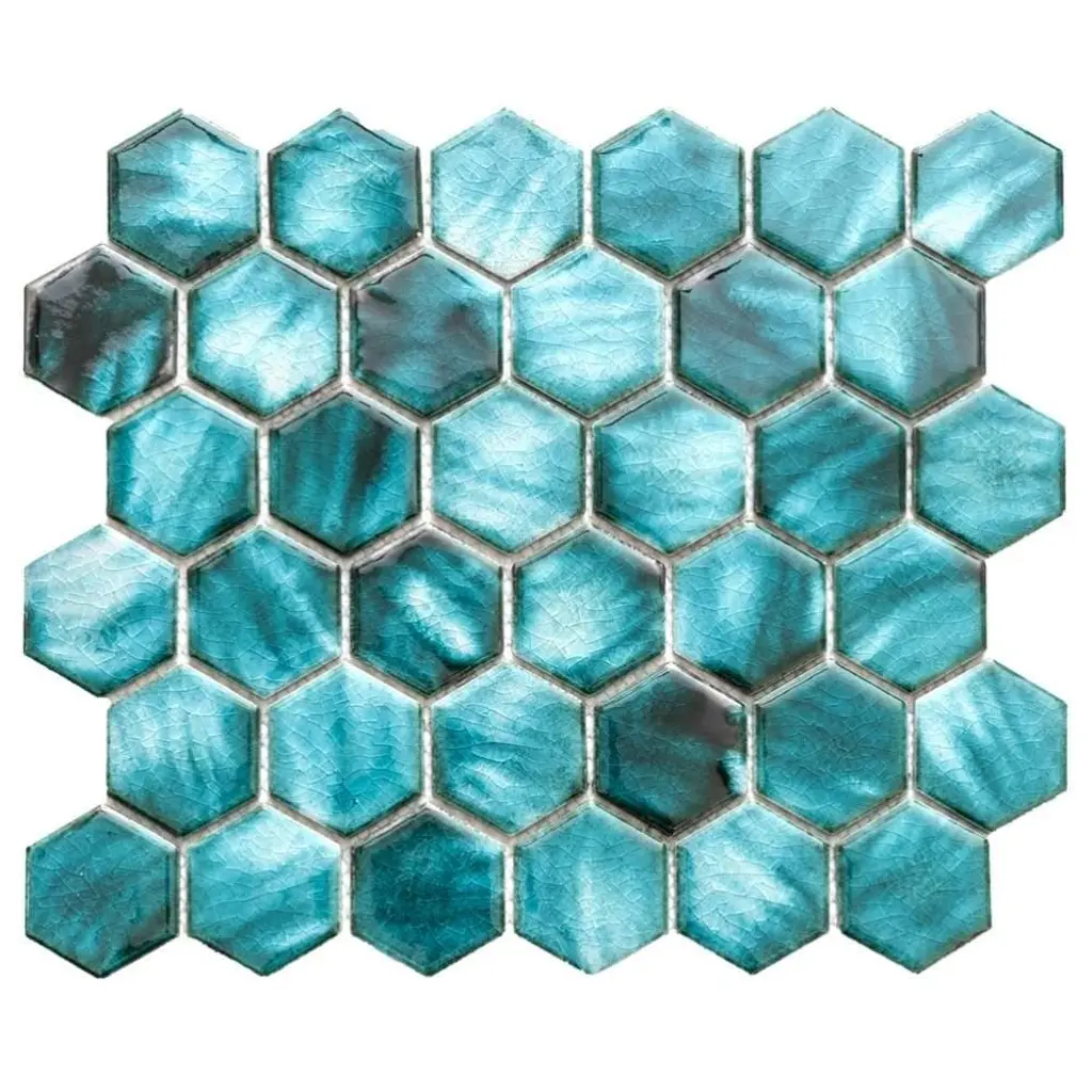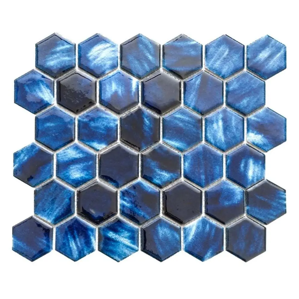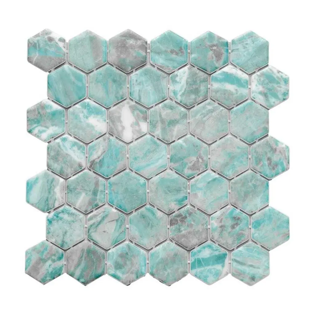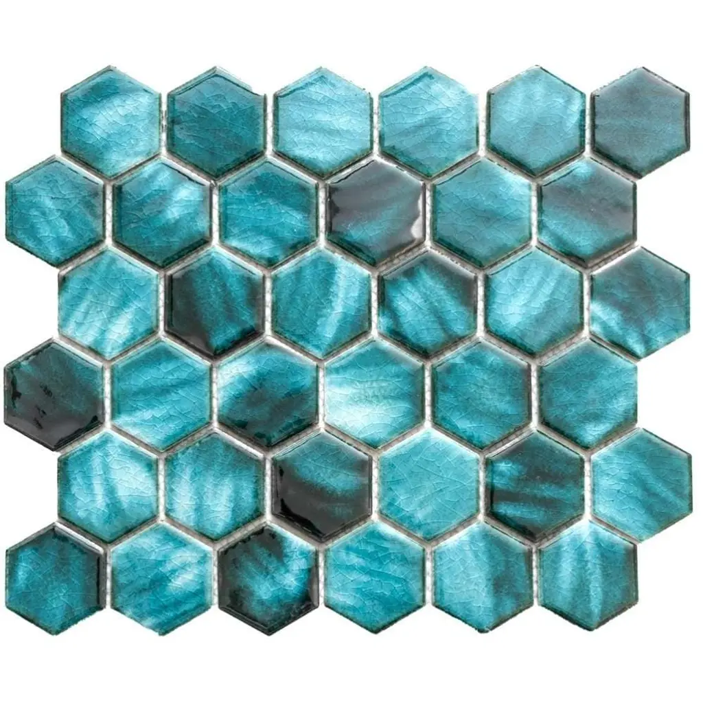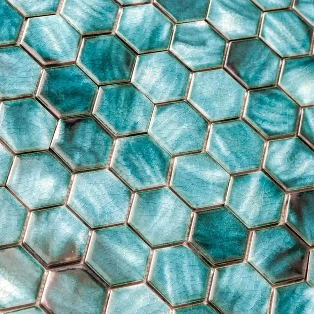 Experience a symphony of sophistication with our Agate Collection, boasting a reflective glossy finish that adds a touch of luxury to any space. Crafted with an artisanal touch, the Agate tiles offer a bold yet refined aesthetic. Each tile is a masterpiece with vibrant, crackled colorways arranged in a mesmerizing hexagon format accentuated with unique metal tones. With its distinctive metallic crackle and watercolored color variation, Agate distinguishes itself from the traditional hexagon mosaic, making it the perfect installation for any bathroom or kitchen space. FEATURES: DIMENSIONS: