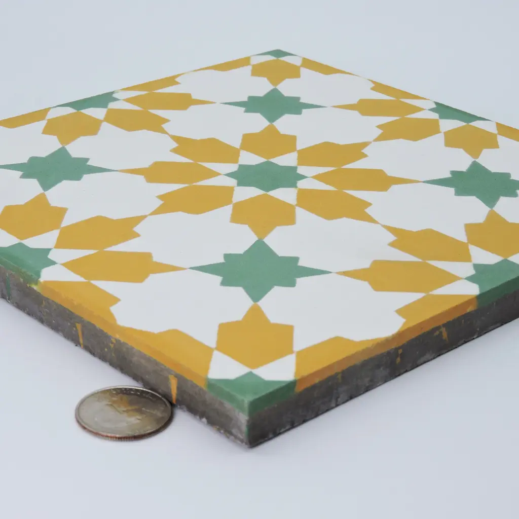 Design a dazzling backsplash, floor, or wall with these stunning tiles. Handmade by skilled Moroccan artisans for superior craftsmanship and traditional authenticity. These decorative tiles made from cement are durable indoors and outdoors. Weather-resistant and waterproof, the eco-friendly Moroccan tiles support your commitment to a greener home.Features:· Handmade in Morocco· Decorative floor and wall tiles· Made of cement materials· Professional installation is recommended.· Eco-friendly· Indoor or outdoor use· Geometric pattern· 12 tiles per box, covering 5.22 square feet.· 2.3 tiles per square foot· Each tile measures 8 inches wide x 8 inches longStory Behind the Art: "It's more than tile, it's art." That simple statement is what sets the craftsmanship of Moroccan Mosaic apart from the rest. Based in the small city of Sale, Moroccan Mosaic is a family business going back 4 generations. When Simo, the current head of the business graduated from university in New York, he had little interest in the family business. But on a return trip home, he saw that the business was not doing well and set about reviving it. One important change he made was introducing black, grey, and white designs to appeal to American and European customers. It worked. When he started, they employed 2 workers and now they have nearly 80 on staff. The workshop itself is fairly simple, and the techniques used to create the tiles are steeped in tradition. Some modern equipment is available, though the workers prefer to use the more rustic tools. The creative process is time intensive and done by hand, as Simo insists on no corners be cut or production be rushed. Environmentally responsible and resource efficient, no chemicals are used at any step. For example, colors used come from nature literally. Green comes from mint leaves, orange from orange peel, and black from charcoal. The tiles themselves are a simple mixture of cement, sand, and granite powder. Moroccan Mosaic hires only local workers, teaching them a valued skill as well as paying them fair wages. Simo's goals for his business are to share the tradition of gorgeous Moroccan tile, grow the business, and employ more and more workers. Country of Origin: Morocco Disclaimers & Disclosures: Please be aware that if you order more than 151 pounds of tile or flooring, the order may need to be shipped Freight and our Oversized Item Delivery/Return policy will apply.