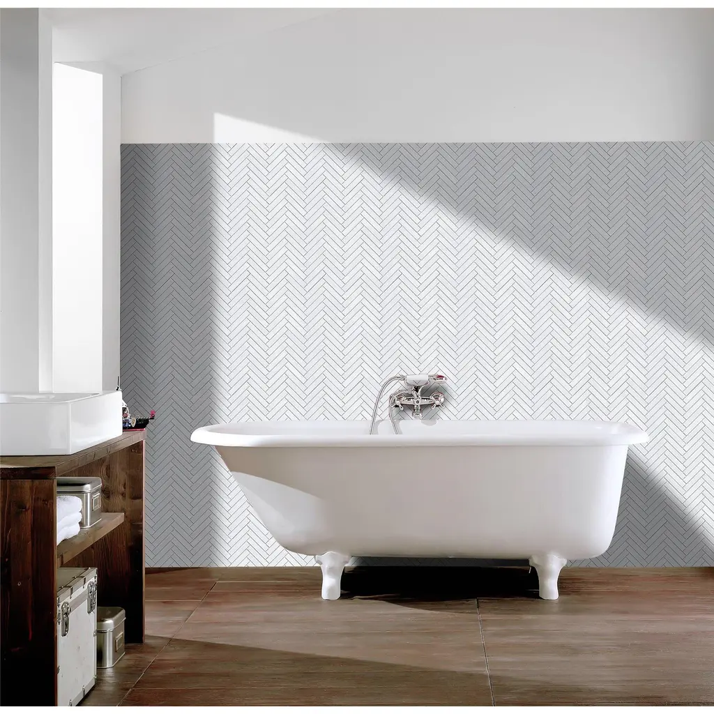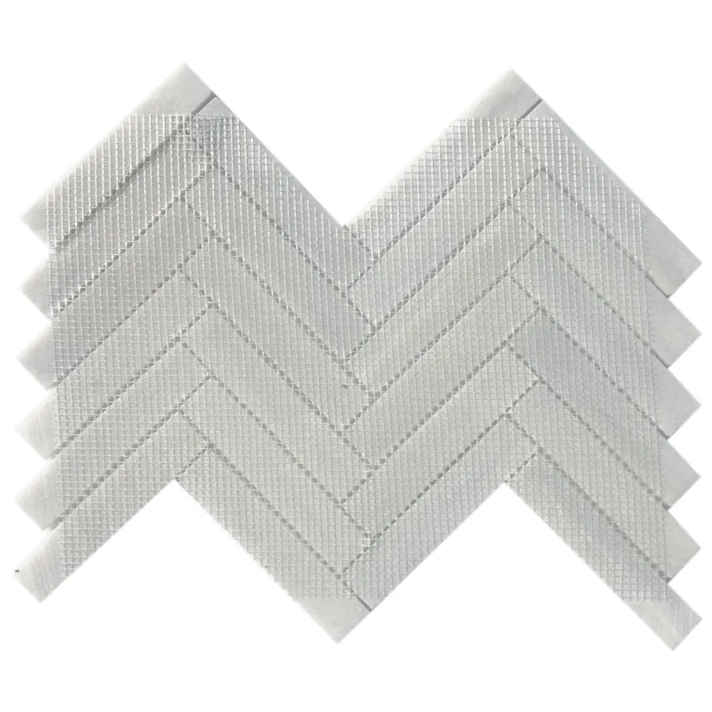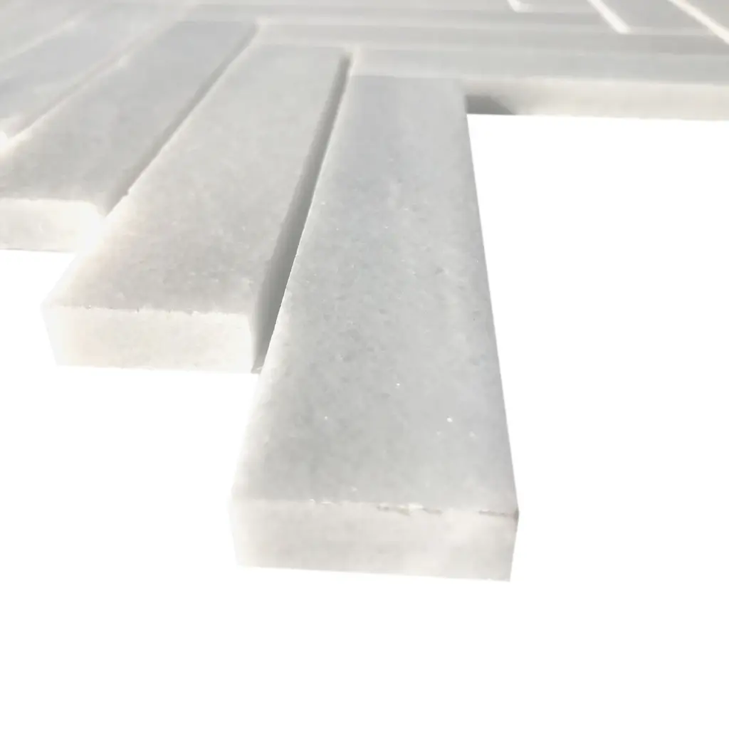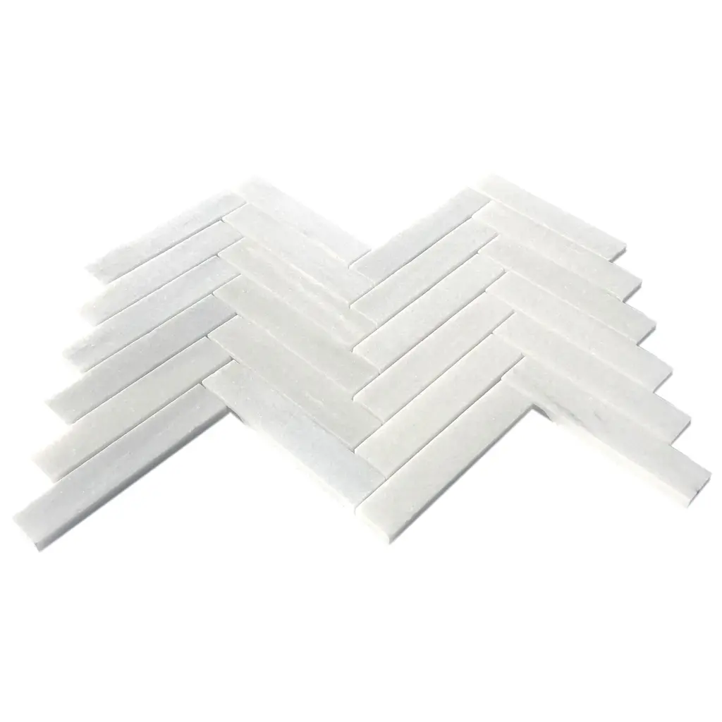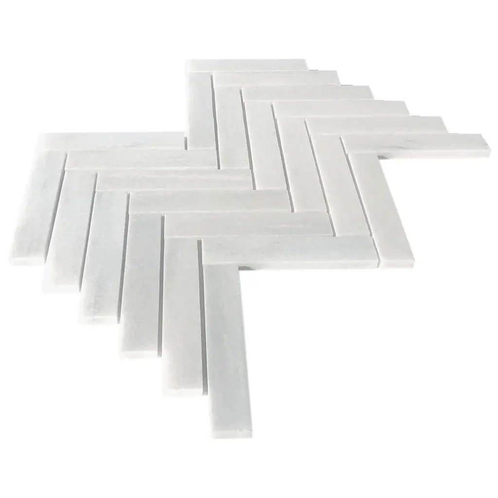 Alaska Crystal Marble 1.25" x 6" Insignia Mosaic Tile is a natural stone mosaic that features a unique, interlocking pattern of elongated, hexagonal tiles made from high-quality marble. The marble has a polished finish that gives it a shiny appearance and highlights the natural veins and patterns of the stone. The mosaic is primarily white in color, with varying shades of grey veining throughout. The interlocking hexagonal tiles create a beautiful, intricate pattern that is perfect for a wide range of interior design applications, including backsplashes, accent walls, shower surrounds, and flooring. The U/H shape of the tiles adds further visual interest and complexity to the overall pattern. It is a stunning and timeless option for any space.What's included?Product Details Sample Details