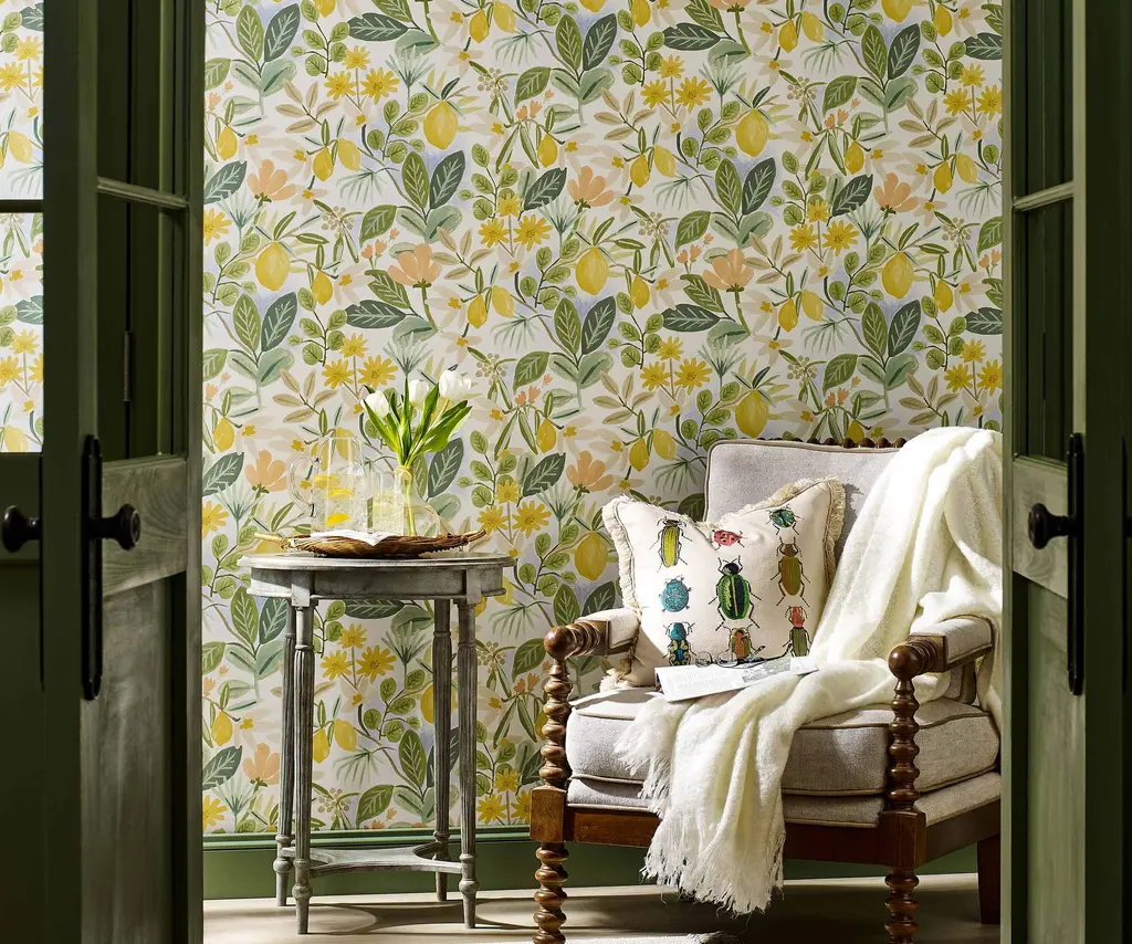 8 × 10" sample of our Amalfi peel & stick wallpaper. Step into a grove of lemon trees bearing bright fruit and delicate blooms with our Amalfi pattern, inspired by the famed Italian coastline. This peel & stick wallpaper can easily be removed, making it perfect for rentals and accent walls. The paper is gravure printed and comes in 27 inch rolls with a 24 inch repeat. Please note that wallpaper samples are cut at random, and pattern placement of the sample you receive will not match the photo featured here.