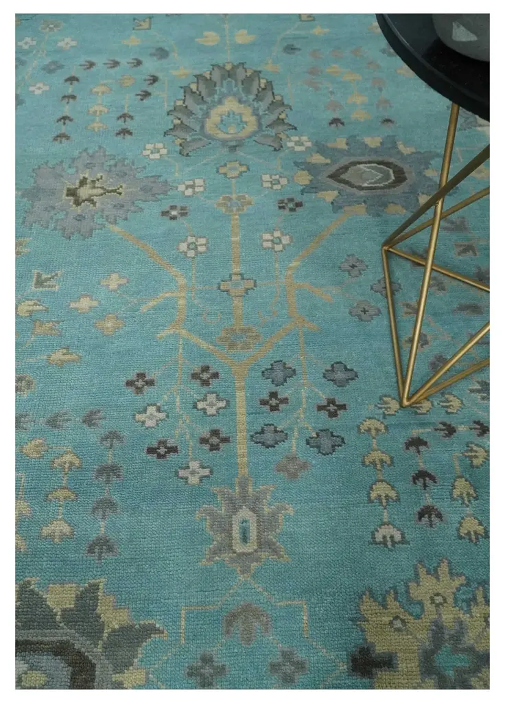 This antique wool area rug is a timeless classic. Featuring a traditional floral design in a stunning combination of blue, silver and beige, it is hand knotted and available in multiple sizes. This handwoven vintage rug will bring beauty and a luxurious feel to your home. Hand-Knotted SIZES ARE MADE TO ORDER IN 30-45 DAYS Made with Wool Color: Blue and Beige Made with 28 knots per square inch Oushak rugs have been made for centuries and carry a tradition and art. This specific rug is made in India, in the city of Bhadohi. Bhadohi is one of the biggest rug manufacturing cities. Carpet weaving in the region dates back to the 16th century during the reign of Akbar. The skilled artisans of Bhadohi have been carrying the tradition of rug-making for centuries. USERS GUIDE Avoid prolonged moisture Vacuum regularly and/or shake to remove dust Do not pull any loose threads. Use scissors to simply cut the ends Blot spills immediately with a white cloth. Harsh chemicals may damage or fade the rug Use rug protectors under heavy furniture
