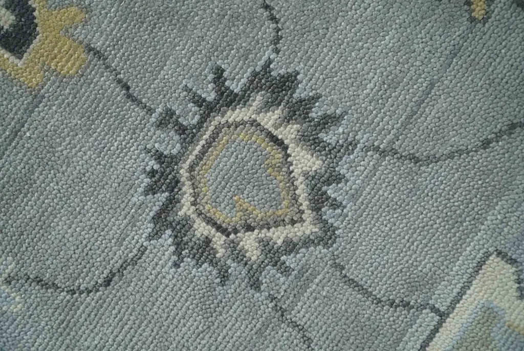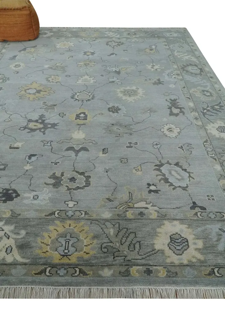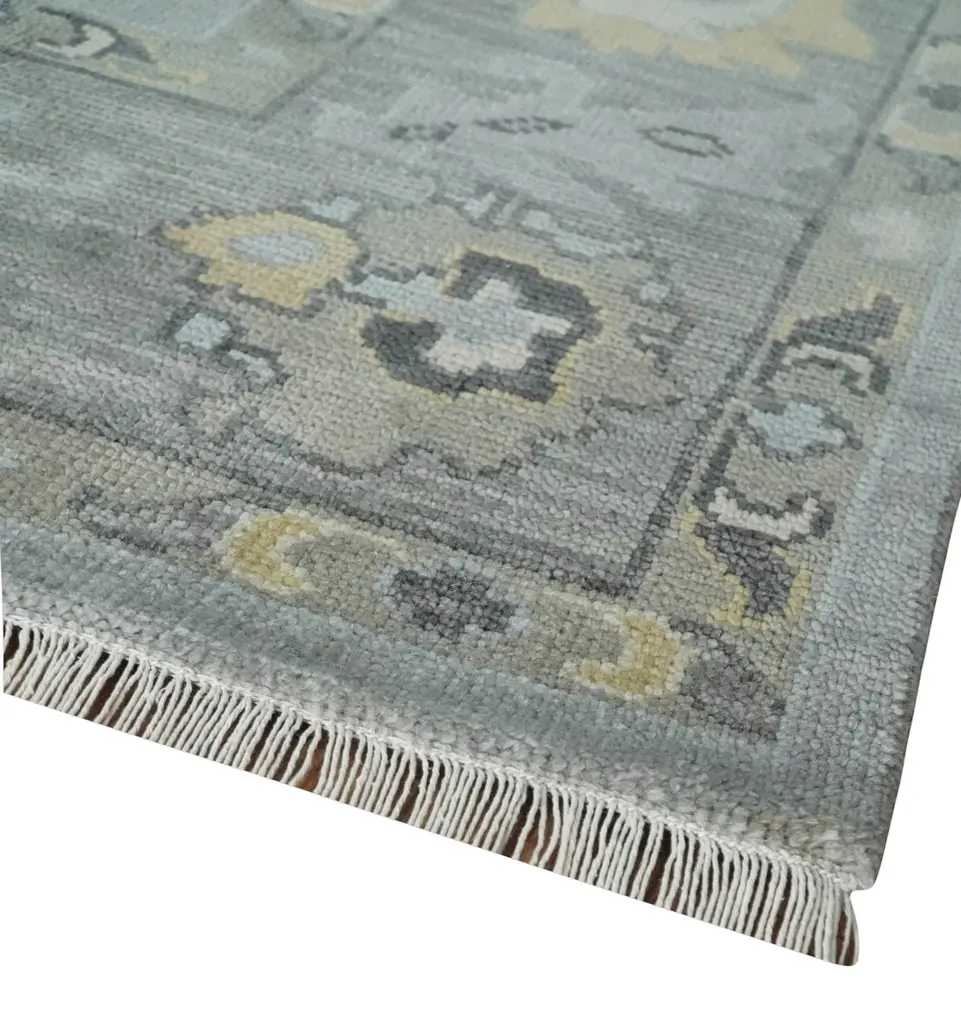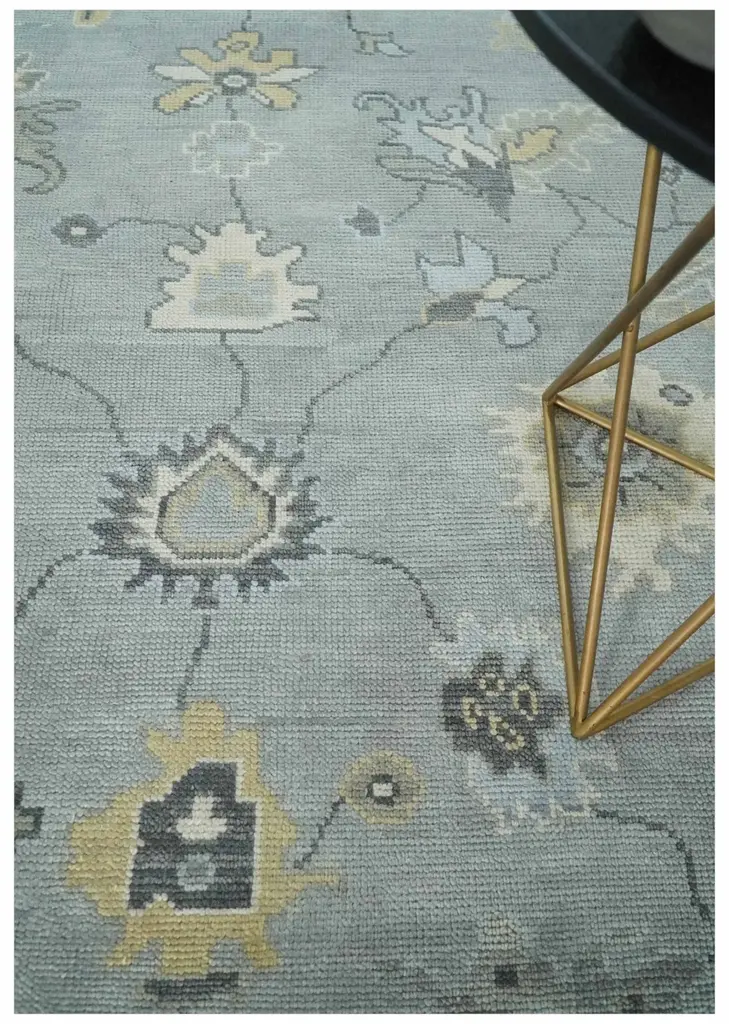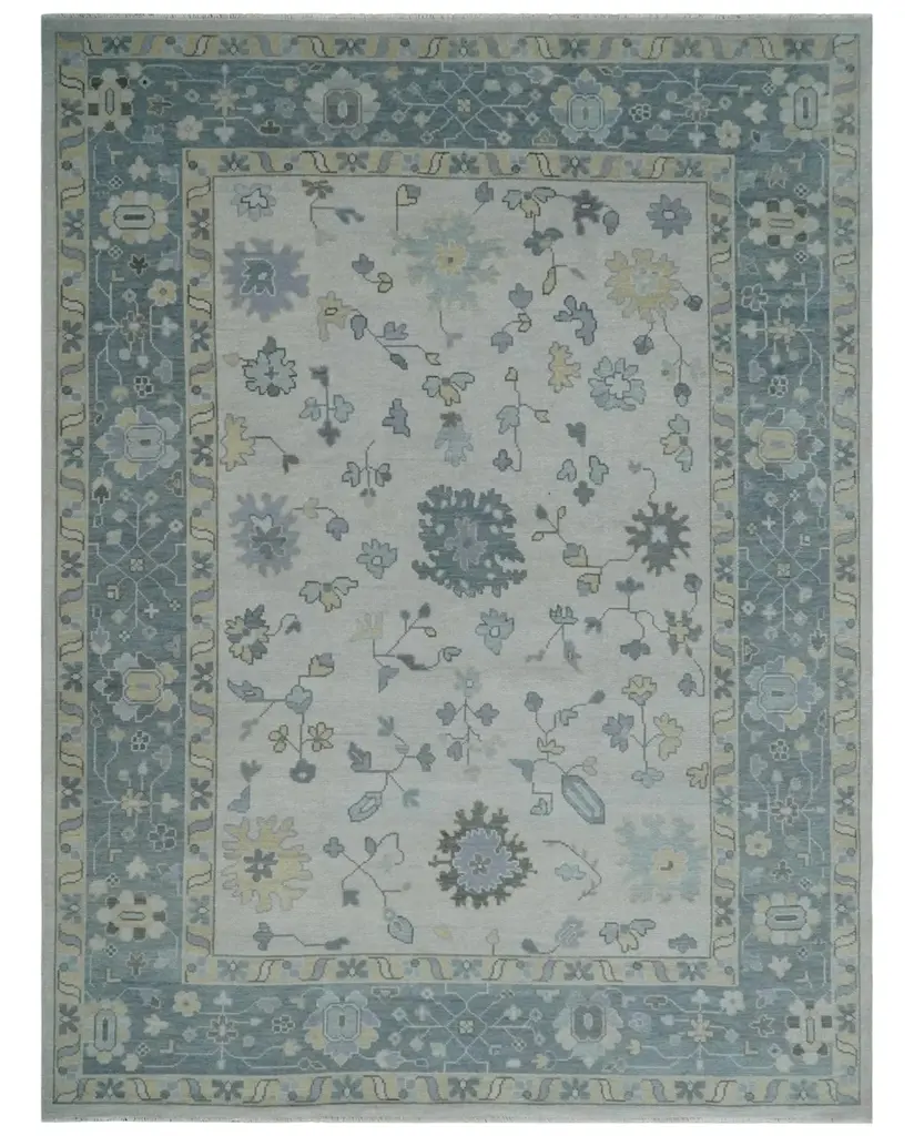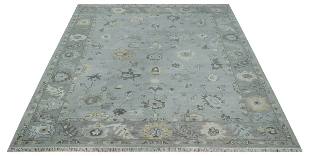 This antique hand-knotted wool area rug features a traditional floral Oushak design in silver and charcoal hues. The intricate hand-knotting of the 100% wool rug adds a perfect visual texture and depth to any living space. Hand-Knotted SIZES ARE MADE TO ORDER IN 30-60 DAYS Made with Wool Color : Silver and Charcoal Made with 28 knots per square inch This specific rug is made in India, in the city of Bhadohi. Bhadohi is one of the biggest rug manufacturing cities. Carpet weaving in the region dates back to the 16th century during the reign of Akbar. The skilled artisans of Bhadohi have been carrying the tradition of rug-making for centuries. USERS GUIDE Avoid prolonged moisture Vacuum regularly and/or shake to remove dust Do not pull any loose threads. Use scissors to simply cut the ends The blot spills immediately with a white cloth. Harsh chemicals may damage or fade the rug Use rug protectors under heavy furniture