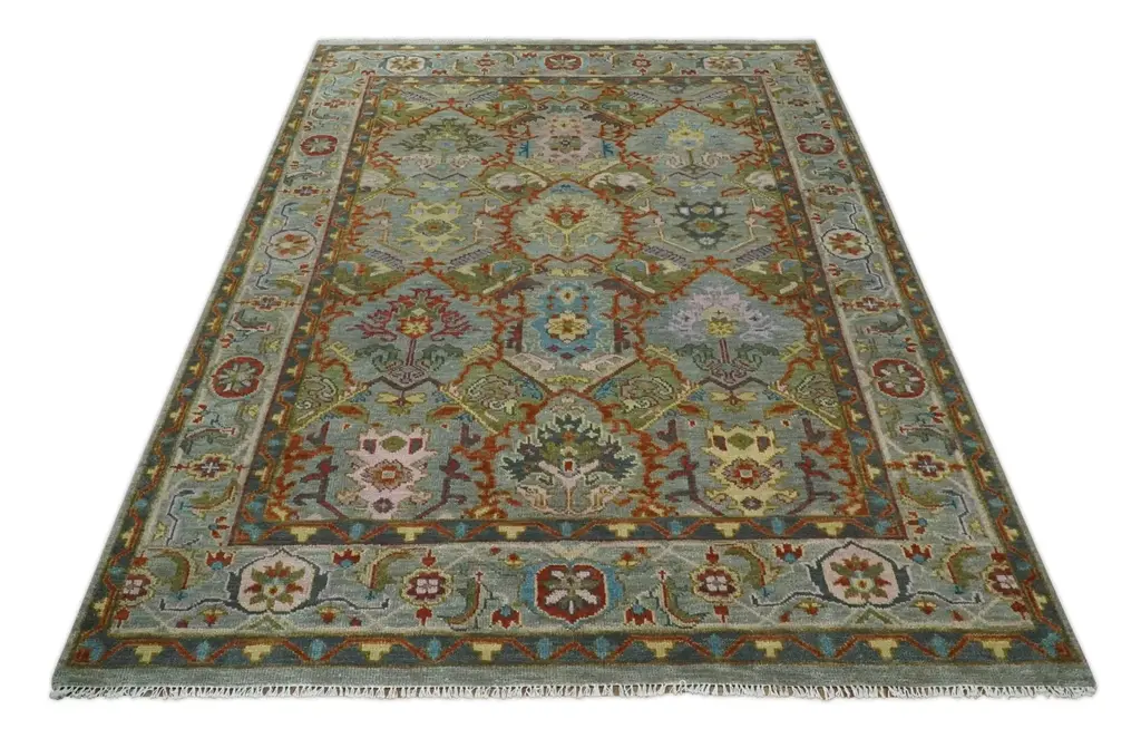This Hand-Knotted Rug has been Made with Handspun Wool. The beautiful colors and design of the rug carry a legacy of heirloom rugs. The large design of the rug completes your space without making it look busy. The rug is durable and can last for decades if treated right. ALL SIZES ARE MADE TO ORDER IN 30-45 Days Hand-Knotted Made with Soft Wool Color: Silver, Rust and Green Made with 22 knots per square inch This specific rug is made in India, in the city of Bhadohi. Bhadohi is one of the biggest rug manufacturing cities. Carpet weaving in the region dates back to the 16th century during the reign of Akbar. The skilled artisans of Bhadohi have been carrying the tradition of rug-making for centuries. USERS GUIDE Avoid prolonged moisture Vacuum regularly and/or shake to remove dust Do not pull any loose threads. Use scissors to simply cut the ends Blot spills immediately with a white cloth. Harsh chemicals may damage or fade the rug Use rug protectors under heavy furniture