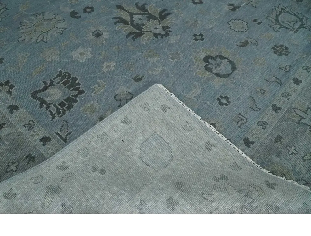 This blue, silver, and charcoal Oushak area rug has a timeless antique look. Hand-knotted with 100% wool, this piece is perfect for creating an elegant, unique style in any living space. Hand-Knotted SIZES ARE MADE TO ORDER IN 30-60 DAYS Made with Wool Color : Blue, Silver and Charcoal Made with 28 knots per square inch This specific rug is made in India, in the city of Bhadohi. Bhadohi is one of the biggest rug manufacturing cities. Carpet weaving in the region dates back to the 16th century during the reign of Akbar. The skilled artisans of Bhadohi have been carrying the tradition of rug-making for centuries. USERS GUIDE Avoid prolonged moisture Vacuum regularly and/or shake to remove dust Do not pull any loose threads. Use scissors to simply cut the ends The blot spills immediately with a white cloth. Harsh chemicals may damage or fade the rug Use rug protectors under heavy furniture