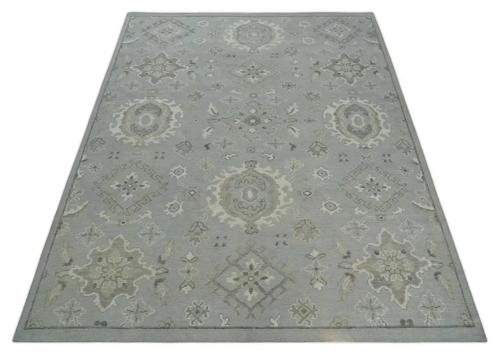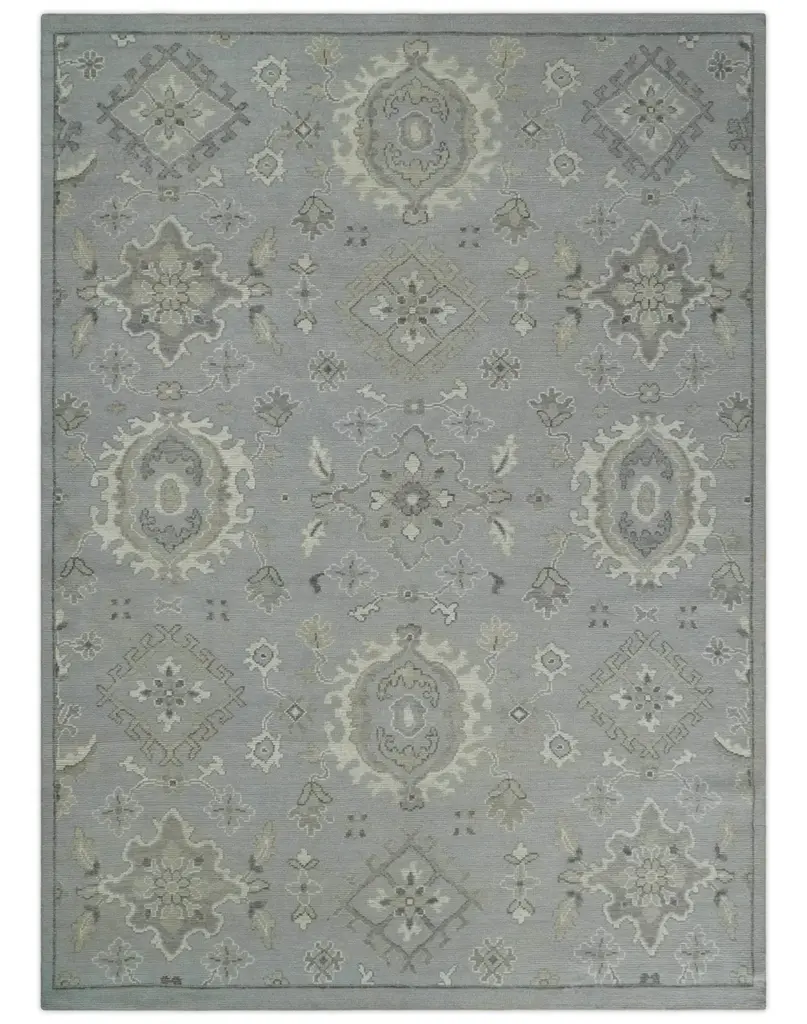 This Antique Style Oushak wool Area Rug boasts soft hues of pastel silver, beige, and grey against a low pile. Its multi-sized design adds subtle complexity and a timeless style. Crafted from wool for superior quality and durability. Hand-Knotted Made with Low Pile Wool Made to Order in 30-45 Days Color: Silver, Beige and Camel Perfect fit for Living Room, Dining Area, or Bedroom This specific rug is made in India, in the city of Bhadohi. Bhadohi is one of the biggest rug manufacturing cities. Carpet weaving in the region dates back to the 16th century during the reign of Akbar. The skilled artisans of Bhadohi have been carrying the tradition of rug-making for centuries. USERS GUIDE Avoid prolonged moisture Vacuum regularly and/or shake to remove dust Do not pull any loose threads. Use scissors to simply cut the ends Blot spills immediately with a white cloth. Harsh chemicals may damage or fade the rug Use rug protectors under heavy furniture