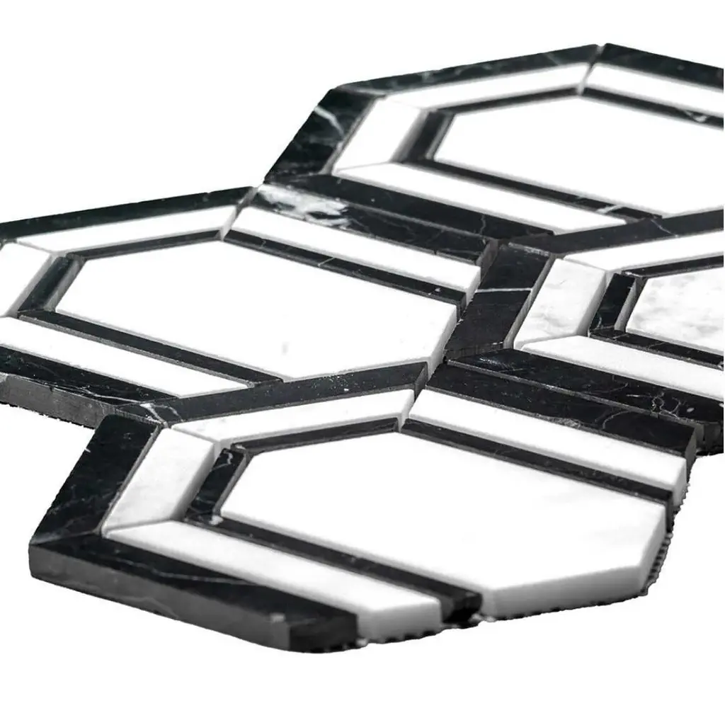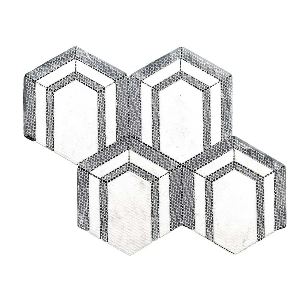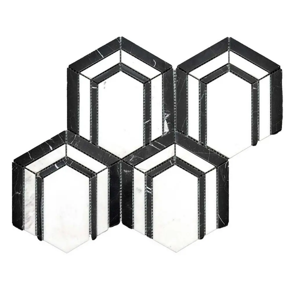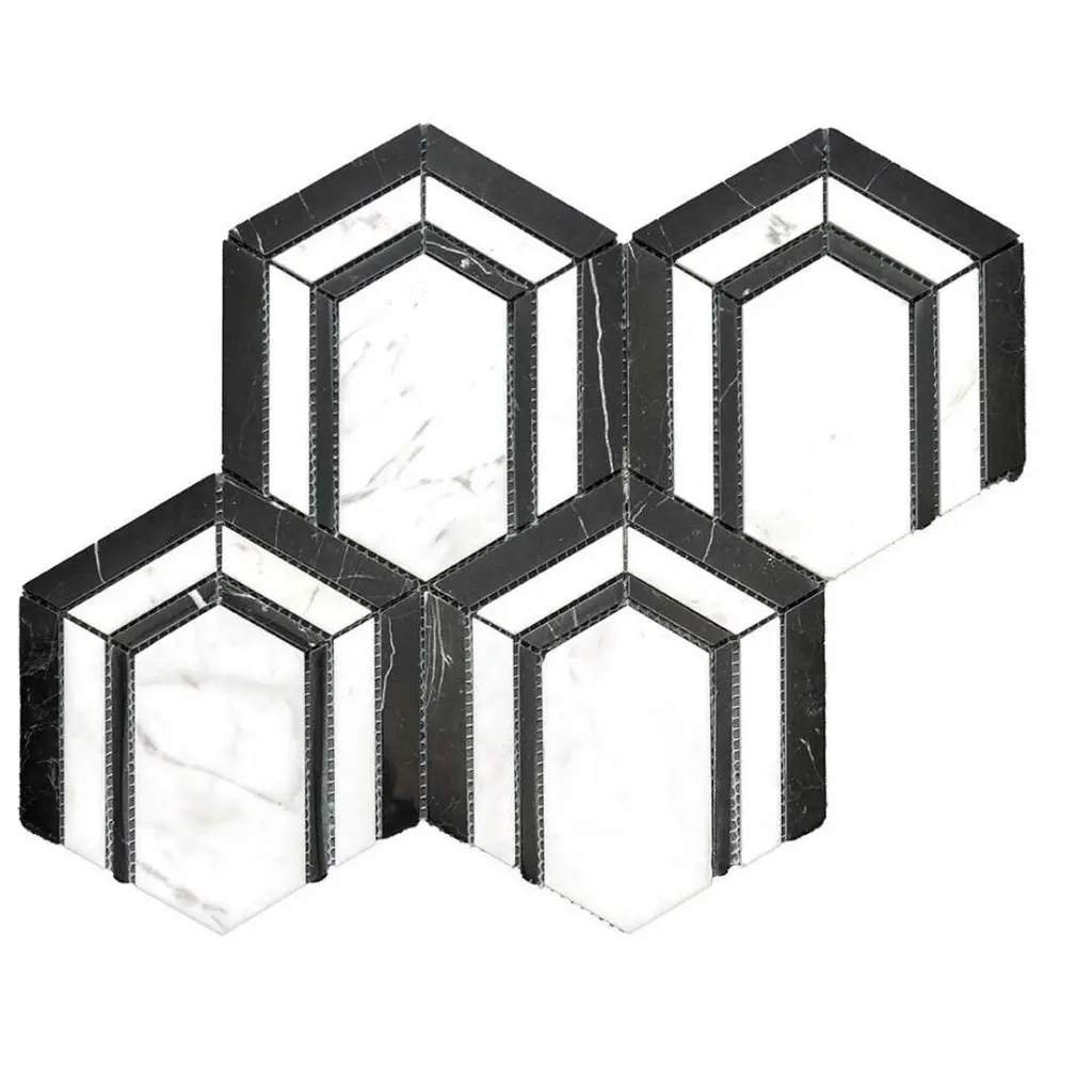 Argos Peak presents a chic tile collection featuring three hexagon mosaic designs in classic black and white. With a blend of modern geometry and timeless style, Argos Peak enhances the ambiance of any room. Each mosaic offers a bold yet balanced pattern that adds visual interest without overwhelming the space. Crafted from durable polished marble, these versatile tiles are perfect for floors, walls, or backsplashes in both residential and commercial spaces. FEATURES: Each mosaic sheet covers 0.83 square foot (approx.) Marble, meshed backed, hexagon, mosaic, polished, rectified edge tile for floor and wall use Impervious and waterproof; Not suitable for outdoor use but are resistant to most elements Polished finish with a shade 1 rating/ variation - V1 uniform appearance High-quality marble look with porcelain's easy maintenance Shiny polished finish Mesh-mounted, creating a seamless pattern and easy installation Modern geometric hexagon shape in a monochromatic color palette Perfect for commercial or residential installations Great for backsplashes, kitchens, bathrooms, or feature walls Easy to install 12" x 14" decorative porcelain mosaic floor and wall tiles Available in three colors: Nero, Carrara, and Carrara & Thassos DIMENSIONS: Mosaic sheet: 12 inches L x 14 inches W Surface area per piece: 0.83 square feet