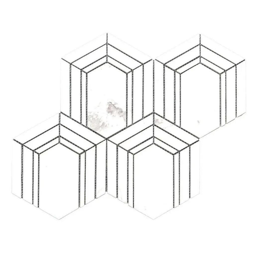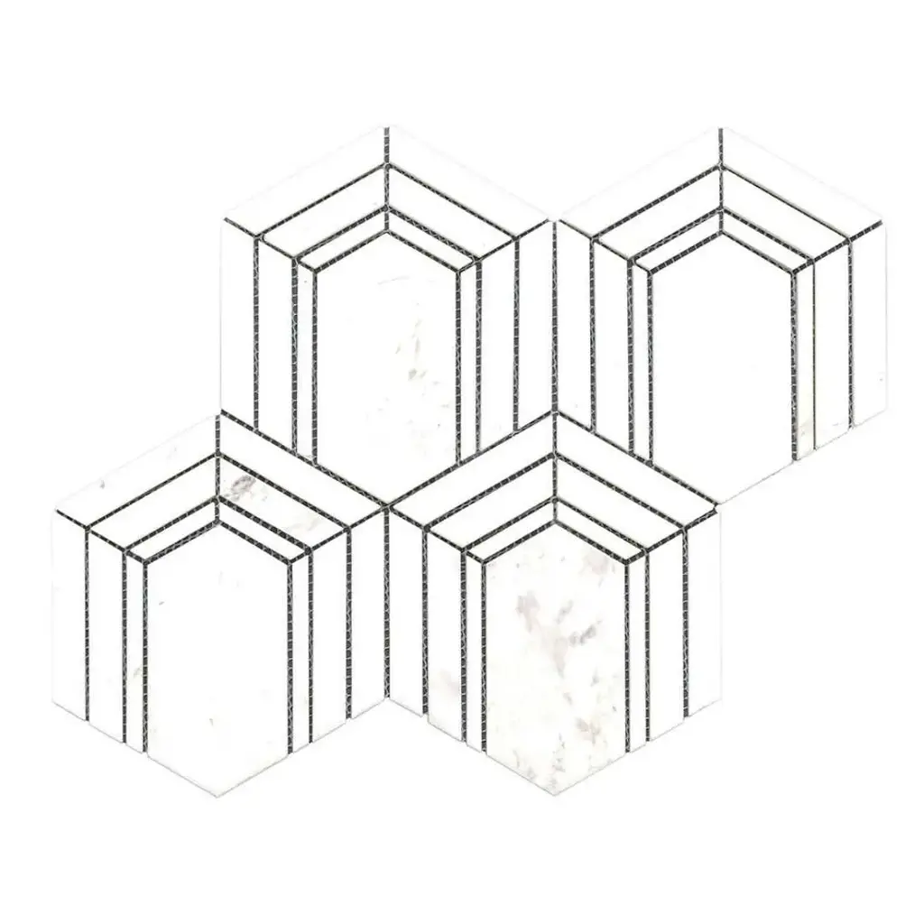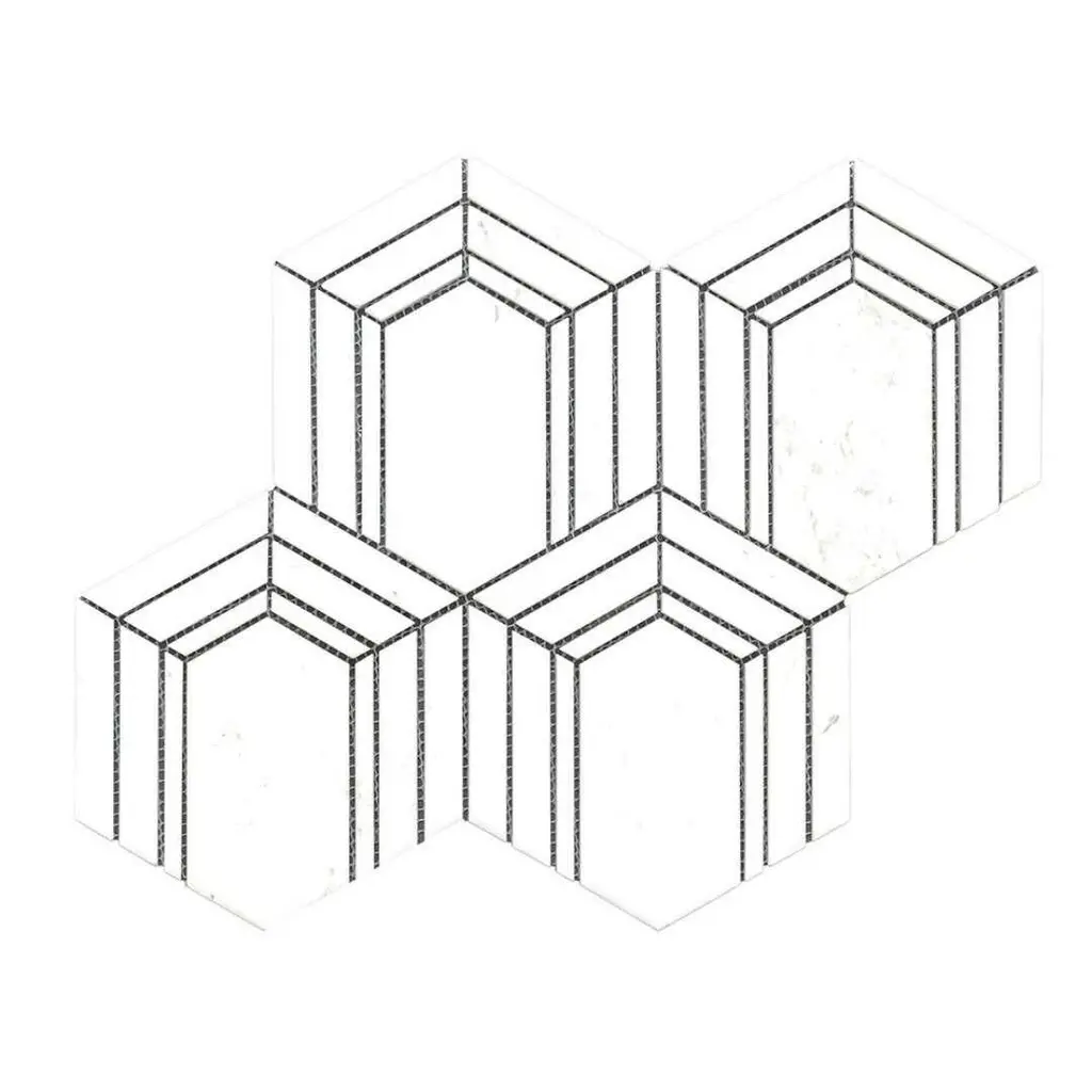Argos Peak presents a chic tile collection featuring three hexagon mosaic designs in classic black and white. With a blend of modern geometry and timeless style, Argos Peak enhances the ambiance of any room. Each mosaic offers a bold yet balanced pattern that adds visual interest without overwhelming the space. Crafted from durable polished marble, these versatile tiles are perfect for floors, walls, or backsplashes in both residential and commercial spaces. FEATURES: Each mosaic sheet covers 0.83 square foot (approx.) Marble, meshed backed, hexagon, mosaic, polished, rectified edge tile for floor and wall use Impervious and waterproof; Not suitable for outdoor use but are resistant to most elements Polished finish with a shade 1 rating/ variation - V1 uniform appearance High-quality marble look with porcelain's easy maintenance Shiny polished finish Mesh-mounted, creating a seamless pattern and easy installation Modern geometric hexagon shape in a monochromatic color palette Perfect for commercial or residential installations Great for backsplashes, kitchens, bathrooms, or feature walls Easy to install 12" x 14" decorative porcelain mosaic floor and wall tiles Available in three colors: Nero, Carrara, and Carrara & Thassos DIMENSIONS: Mosaic sheet: 12 inches L x 14 inches W Surface area per piece: 0.83 square feet