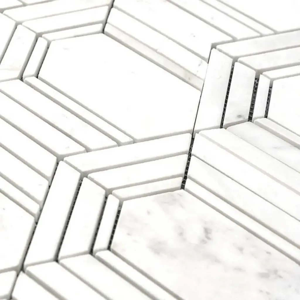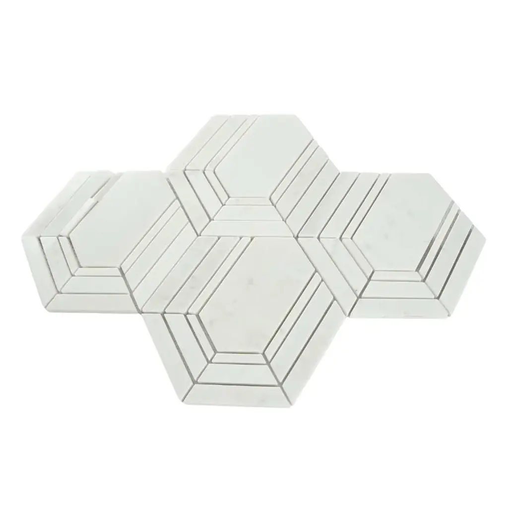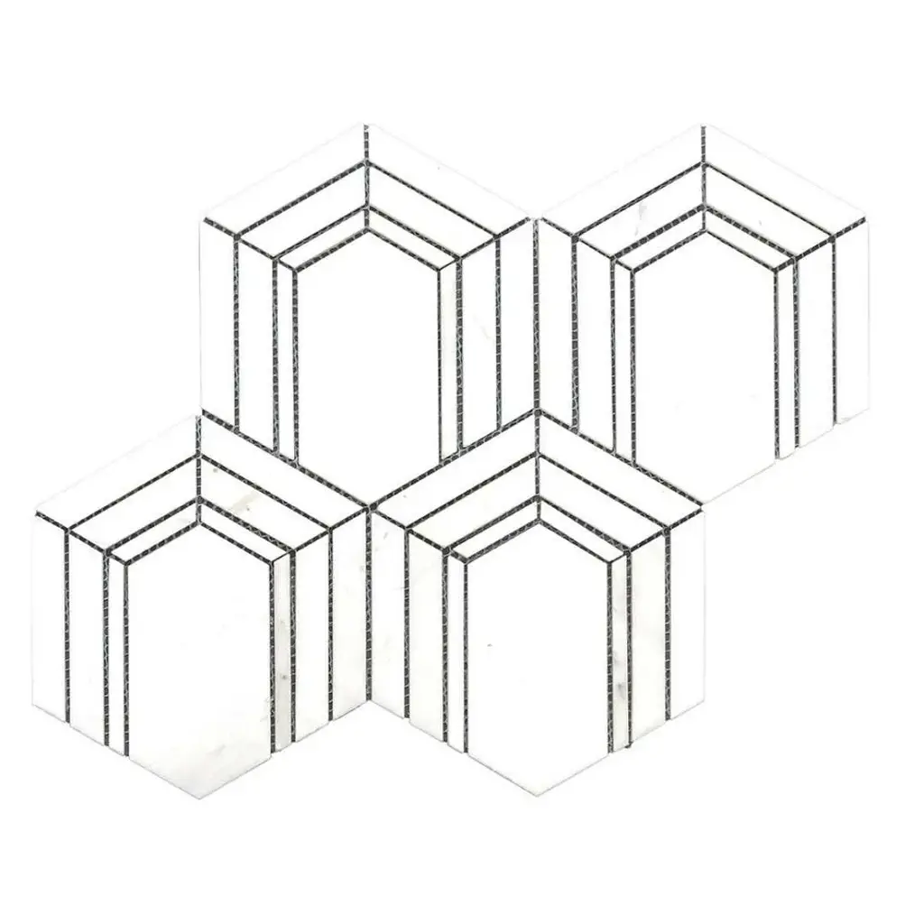Argos Peak presents a chic tile collection featuring three hexagon mosaic designs in classic black and white. With a blend of modern geometry and timeless style, Argos Peak enhances the ambiance of any room. Each mosaic offers a bold yet balanced pattern that adds visual interest without overwhelming the space. Crafted from durable polished marble, these versatile tiles are perfect for floors, walls, or backsplashes in both residential and commercial spaces. FEATURES: Each mosaic sheet covers 0.83 square foot (approx.) Marble, meshed backed, hexagon, mosaic, polished, rectified edge tile for floor and wall use Impervious and waterproof; Not suitable for outdoor use but are resistant to most elements Polished finish with a shade 1 rating/ variation - V1 uniform appearance High-quality marble look with porcelain's easy maintenance Shiny polished finish Mesh-mounted, creating a seamless pattern and easy installation Modern geometric hexagon shape in a monochromatic color palette Perfect for commercial or residential installations Great for backsplashes, kitchens, bathrooms, or feature walls Easy to install 12" x 14" decorative porcelain mosaic floor and wall tiles Available in three colors: Nero, Carrara, and Carrara & Thassos DIMENSIONS: Mosaic sheet: 12 inches L x 14 inches W Surface area per piece: 0.83 square feet