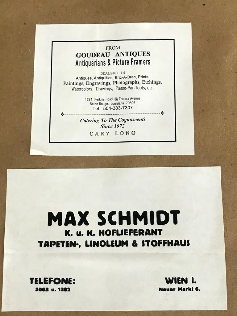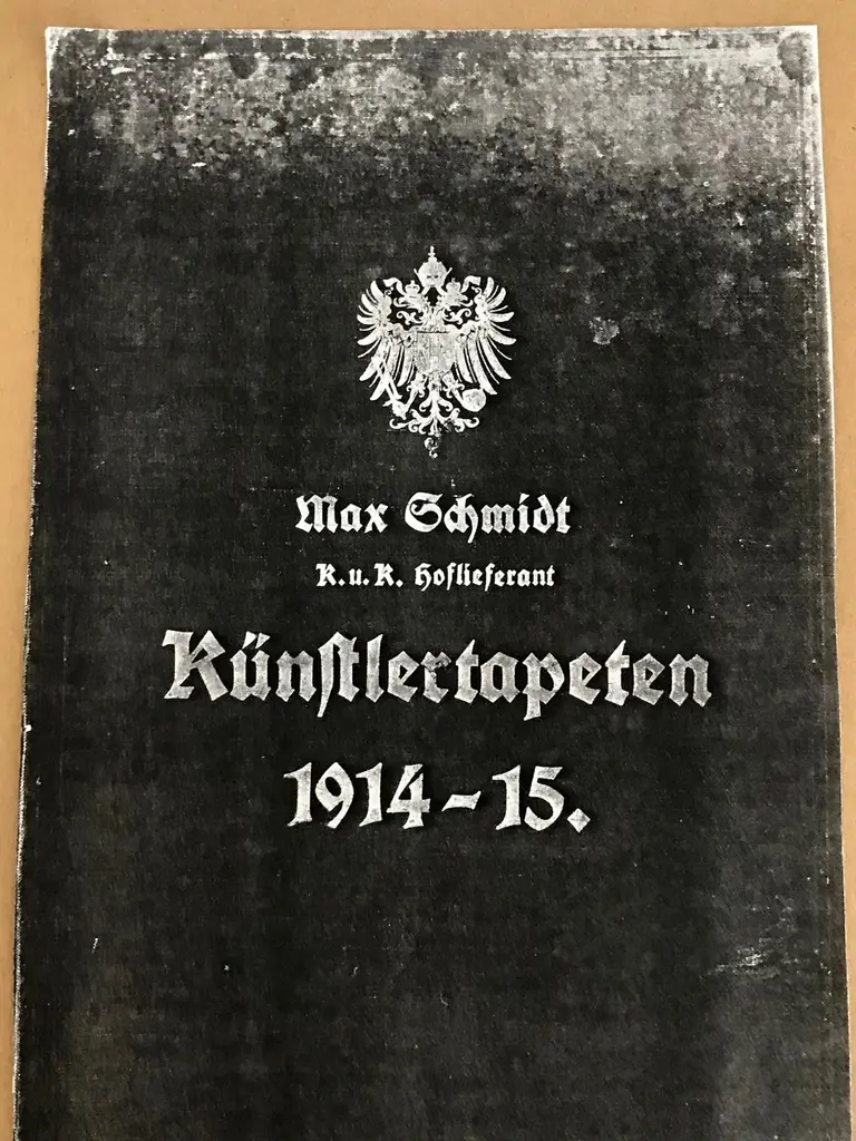 Two wallpaper samples in the Art Nouveau style from the Vienna Secession period 1914-1915. It was made by Künstler-Tapeten (A Germanic Wallpaper company) and printed by Max Schmidt in Vienna, who also printed wallpapers designed by Josef Hoffmann for Wiener Werkstätte around the same time.Labeled on the back as a k.u.k. Hoflieferant, which means a court purveyor (imperial and royal court purveyor, sometimes written k & k. Hoflieferant) in the Austro-Hungarian dual monarchy, a merchant or service provider, from 1911 until 1918, that had a special permit by an imperial privilege, goods and services to the court to deliver in Vienna. This privilege allowed the supplier to publicly advertise it.Measures: The larger one 29 x 16 in. and 14.5 in. x 12.5 in.Provenance: From noted antiquarian Cary Long (Goudeau Antiques), Baton Rouge.