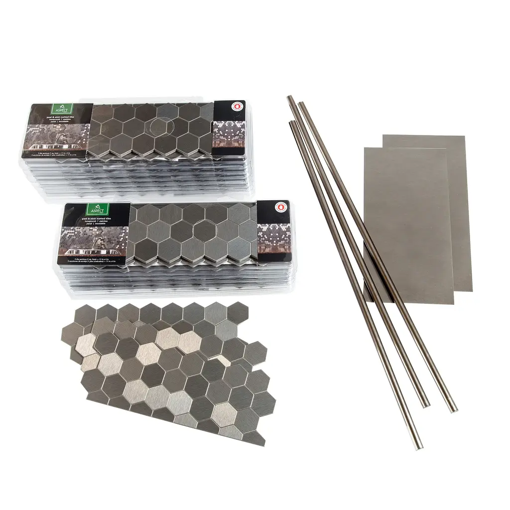 Matted Aspect is a decorative metal tile that provides the look of custom metal backsplash and wall paneling at a fraction of the cost. These tiles have easy to use peel and stick application and are made of a double-sided aluminum with polymer core. They can be used in multiple applications including backsplash, walls, cabinets, details, accents and more. Each box of tiles contains 3 pieces. Backsplash Kit includes 15 boxes of Matted Aspect tiles (total of approximately 15-square feet), three 24 in. matching J-Trim pieces and one package of matching Outlet Covers. Samples are a portion of a matted tile. Samples are not returnable Partial Kits are not returnable If the quantity ordered is over 150 lbs, the order will ship via freight carrier and longer shipping timeframes are to be expected. Each line item within an order will be selected from a single dye lot (color) and caliber (size), but multiple orders can result in receiving multiple dye lots and/or calibers. Please ensure that all tile for a project is obtained within one order.