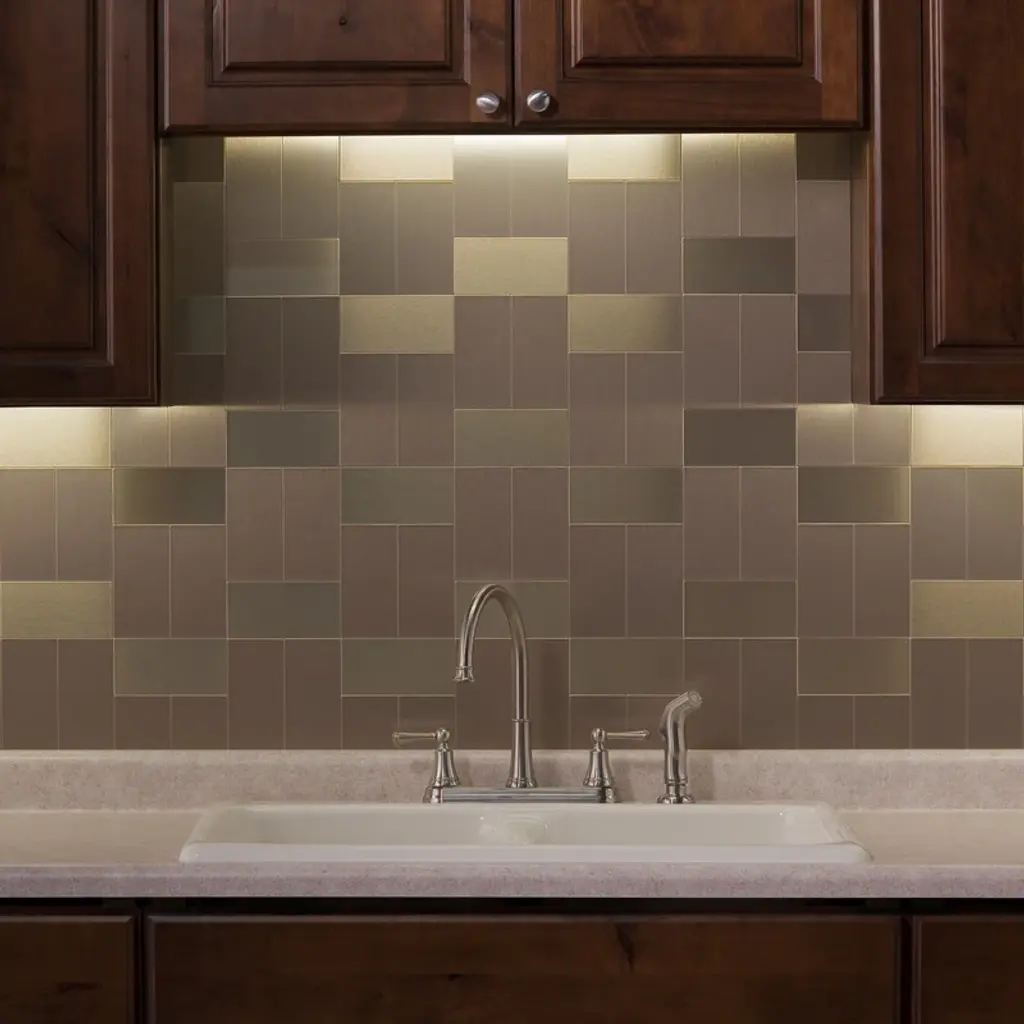 Aspect is a decorative metal tile that provides the look of custom metal backsplash and wall paneling at a fraction of the cost. There are a wide variety of tile patterns that can be used. Aspect tiles can be designed to create as elaborate or as uncomplicated as your personal style requires. These tiles have easy to use peel and stick application and are made of a double-sided aluminum with polymer core. They can be used in multiple applications including backsplash, walls, cabinets, toe-kicks, details, accents and more. Backsplash Kit includes 15 boxes of Aspect tiles (total of approximately 15-square feet), three 24 in. matching J-Trim pieces and one package of matching Outlet Covers. Samples are one 3 in. x 6. In tile. Samples are not returnable Partial Kits are not returnable If the quantity ordered is over 150 lbs, the order will ship via freight carrier and longer shipping timeframes are to be expected. Each line item within an order will be selected from a single dye lot (color) and caliber (size), but multiple orders can result in receiving multiple dye lots and/or calibers. Please ensure that all tile for a project is obtained within one order.