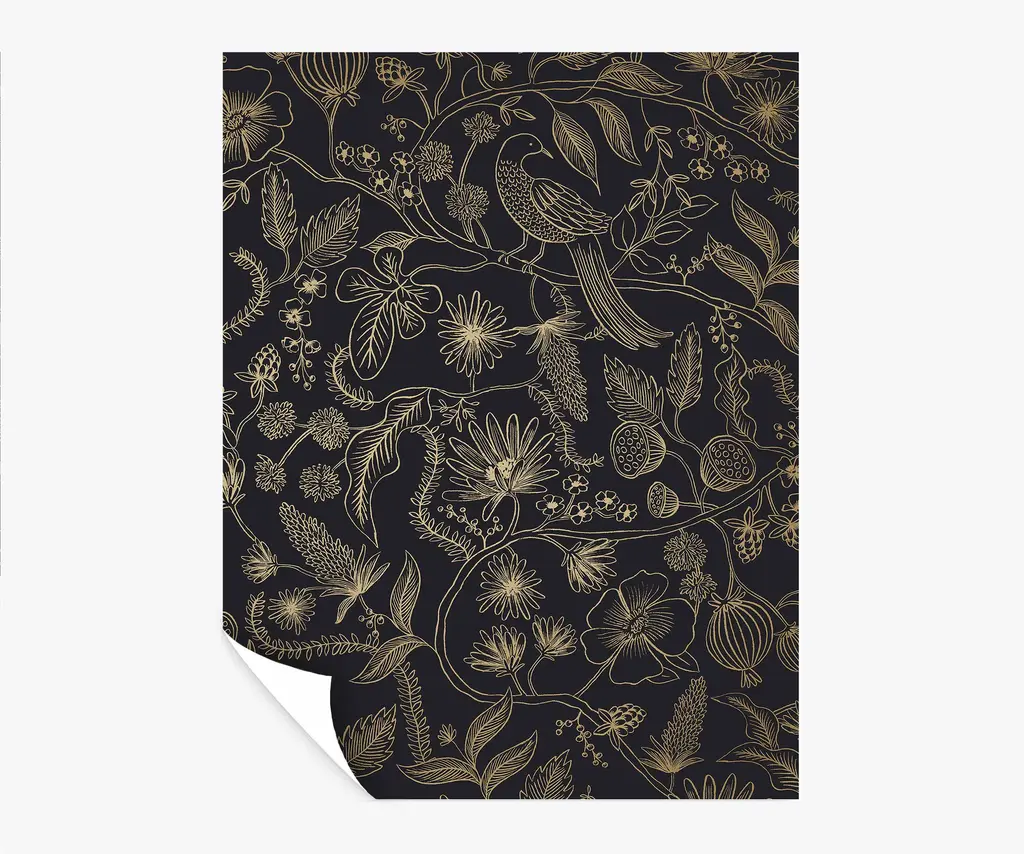 8 × 10" sample of our Aviary peel & stick wallpaper. The intricate linework of the two-color Aviary print was originally created from a pen-and-ink drawing. Named for the birds perched on the winding branches, it also features poppy pods and blooming flowers. This peel & stick wallpaper can easily be removed, making it perfect for rentals and accent walls. The paper is gravure printed with metallic ink and comes in 27 inch rolls with a 24 inch repeat. Please note that wallpaper samples are cut at random, and pattern placement of the sample you receive will not match the photo featured here.