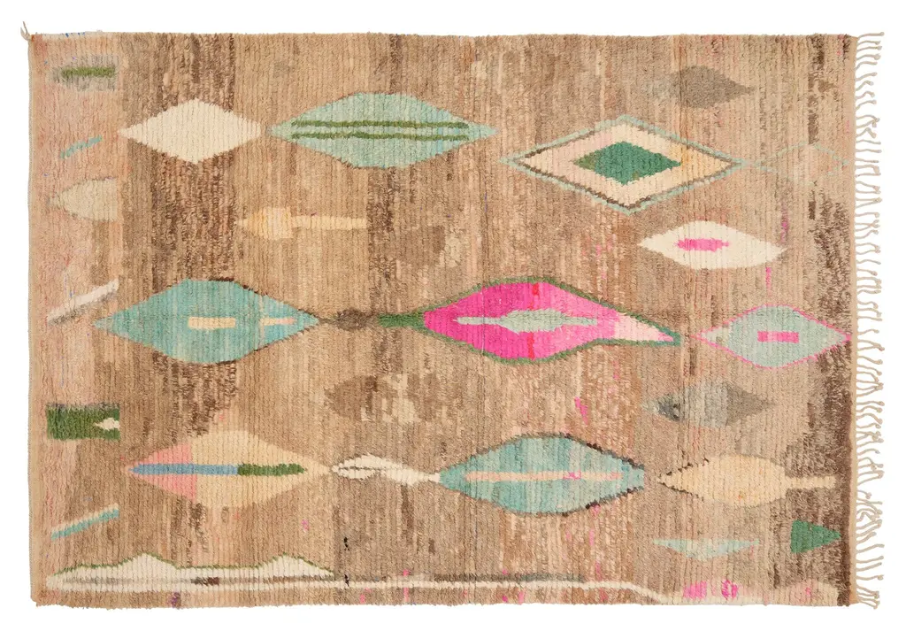 Inspired by an original vintage painting, this rug is both hand-tufted and hand-hooked to create an abstract chevron pattern. Crafted from a durable, naturally stain-resistant soft wool, it’s perfect for high-traffic areas like living rooms, kids’ rooms, staircases, and hallways.