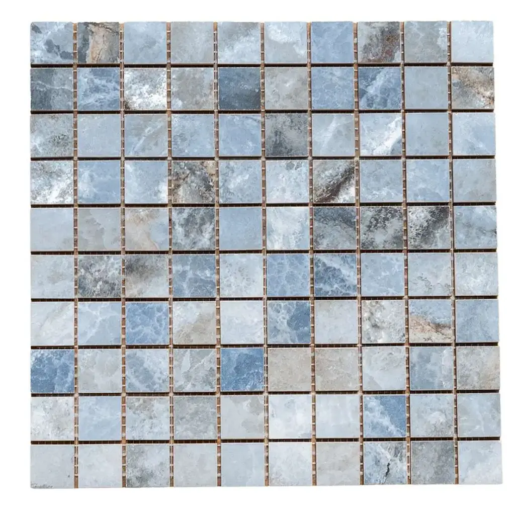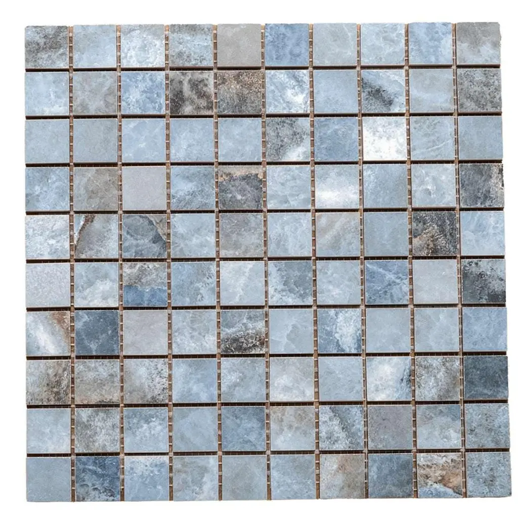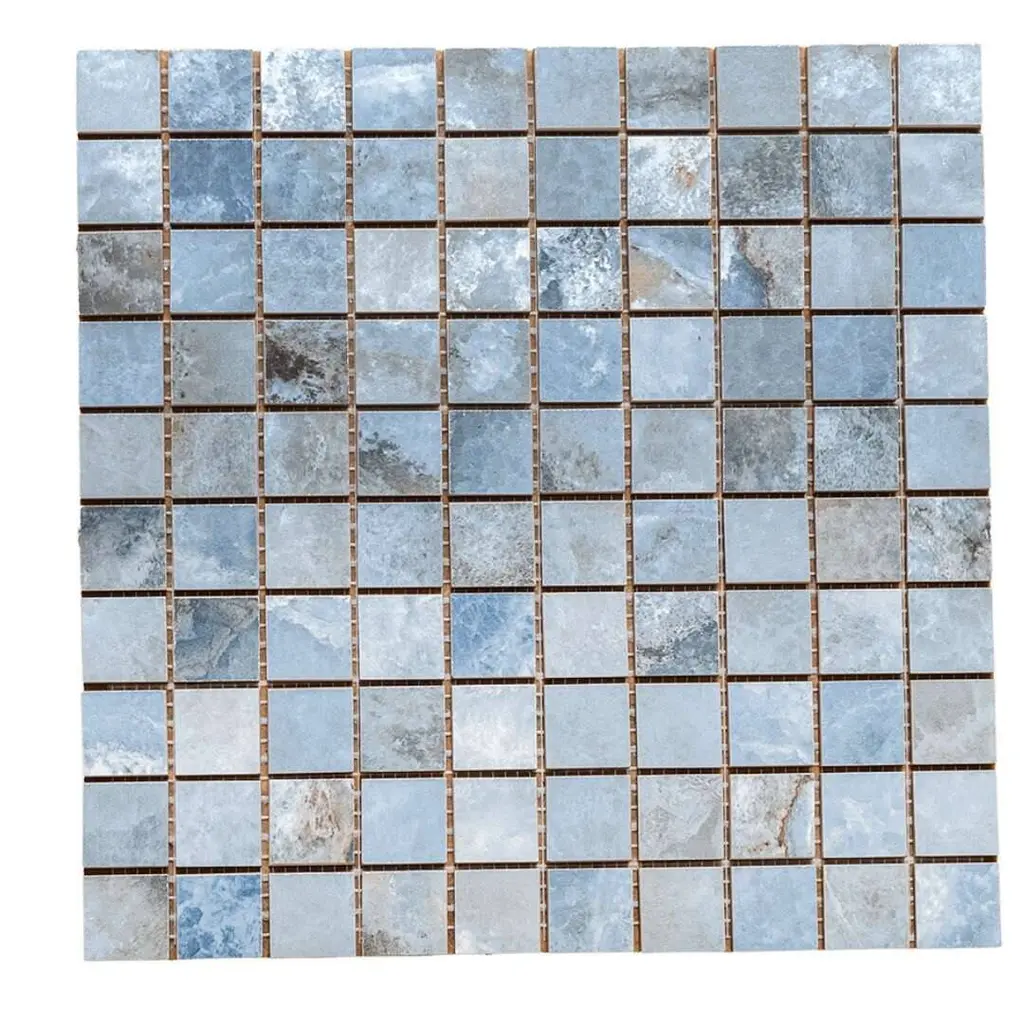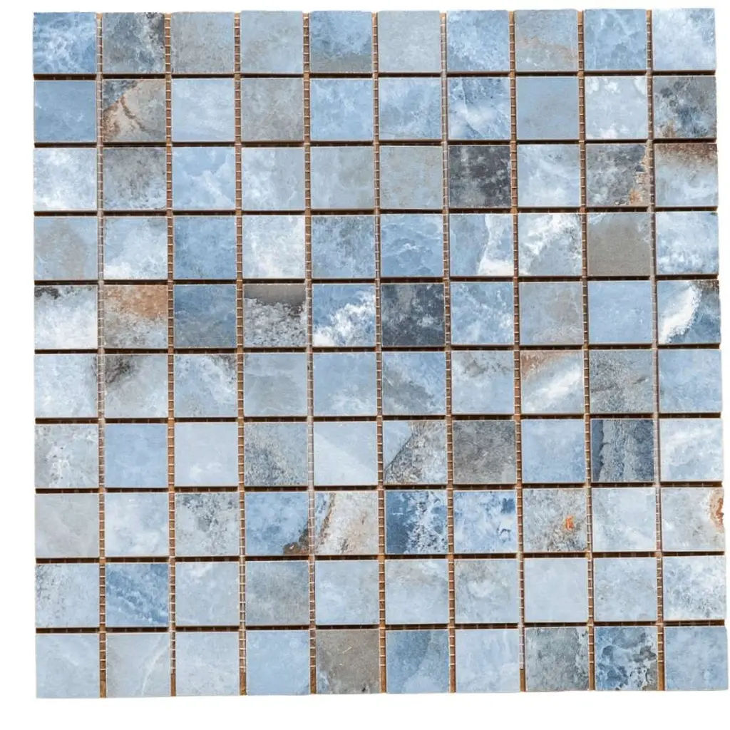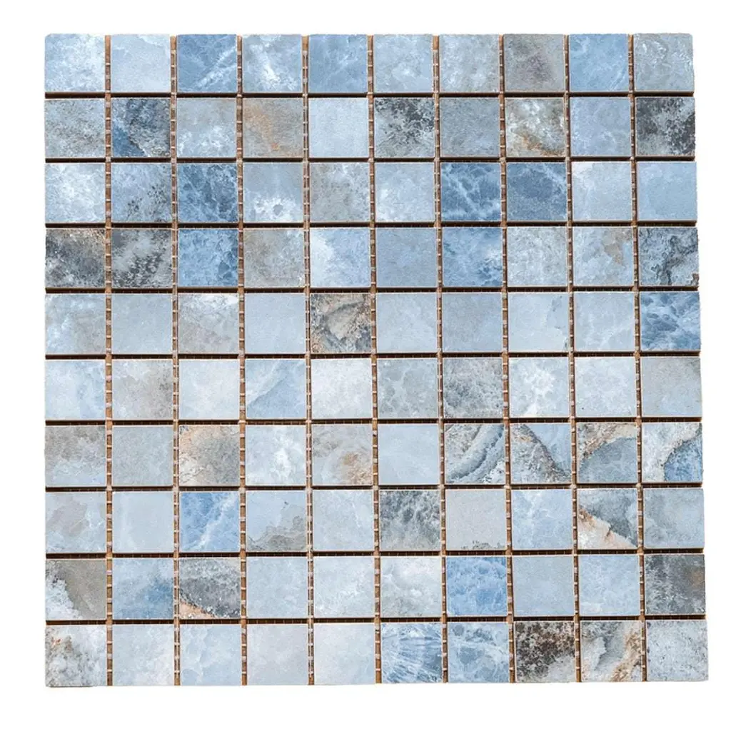 Express your creativity and individuality with the visual appeal of our Banff collection. A testament to the beauty water-colored onyx can bring to your space, this collection is a harmonious blend of artful craftsmanship and natural wonder. Inspired by the mesmerizing luminosity of onyx, each tile showcases alternating layers of color, reminiscent of the rich banded patterns found in the stone's fluid veins. Available in three distinct jewel-toned colors--blue, jade, and white—these tiles serve as a perfect transitional tile for any design aesthetic. The result is a sophisticated, dynamic look that adds depth and character to any space. FEATURES: Crafted in Italy Authentic onyx-inspired design Offered in three jewel-toned colors: jade, white, and blue Designed for interior walls and floors Available in smooth matte or shiny polished finish Each mosaic sheet covers 0.97 square foot (approx.) Porcelain, mesh backed, grid, mosaic, square, matte, rectified, floor and wall tile Impervious and waterproof; Not suitable for outdoor use but are resistant to most elements Matte finish with a V4 substantial variation Ideal for backsplashes, bathrooms, showers, kitchens, floors, walls Approved for residential and commercial installations Easy to install 12 inches x 12 inches decorative grid porcelain mosaic tile PEI Rating: 5 - Heavy duty traffic DIMENSIONS: Mosaic sheet: 12 inches L x 12 inches W Individual tile size: 1 inch L x 1 inch W Surface area per carton: 0.97 square feet Sample tile size: 4 inches L x 4 inches W